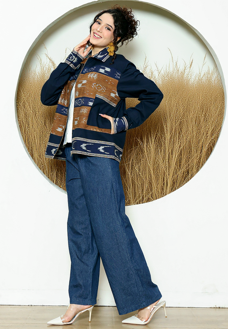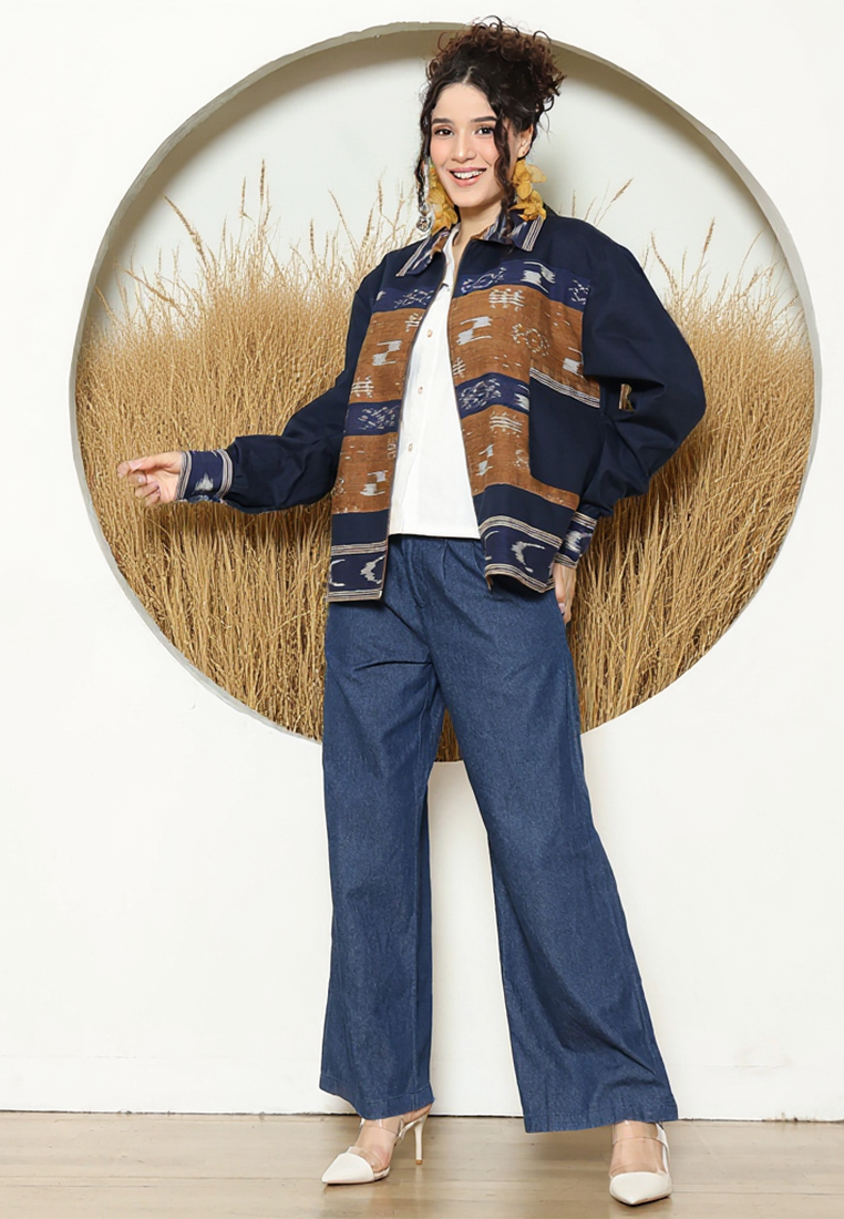 Blue Brown Tribal Handwoven Ikat Bomber Jacket