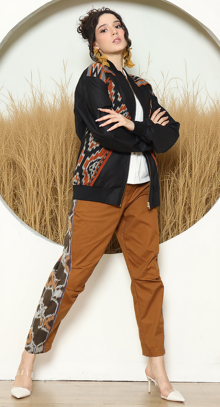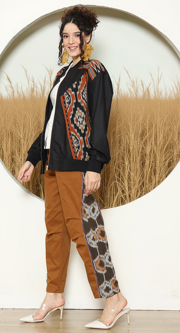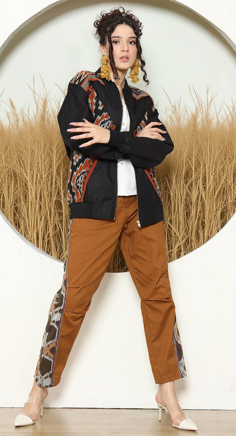 Ikat bomber jacket. This bomber jacket has black ribbed trims and zipped fastening through front. Blending traditional flair with sporty style.