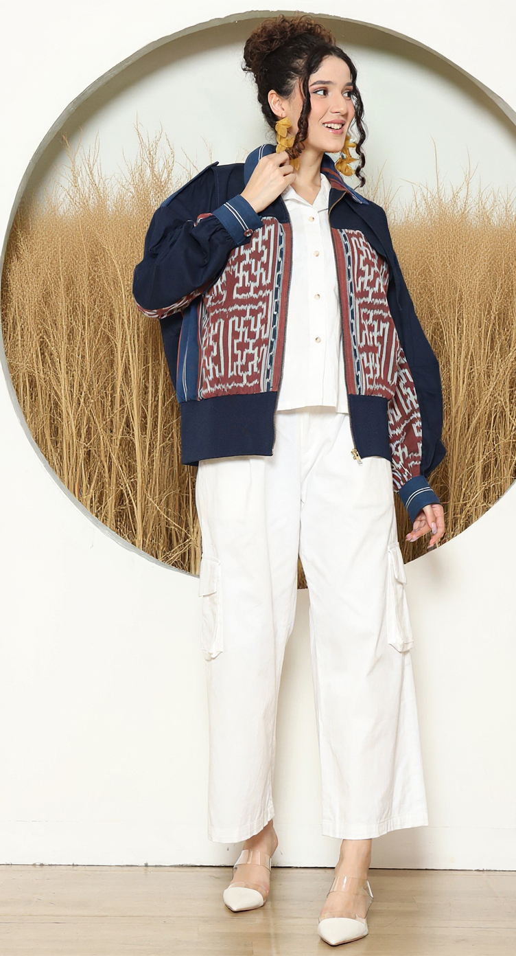 Brown Blue Tribal Handwoven Ikat Bomber Jacket