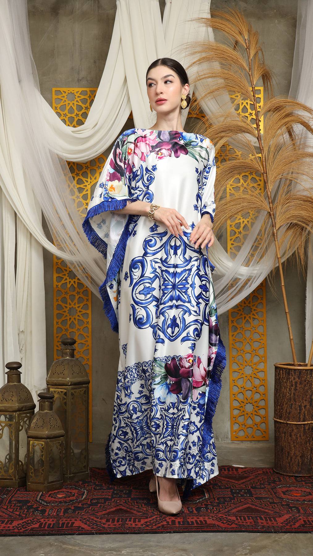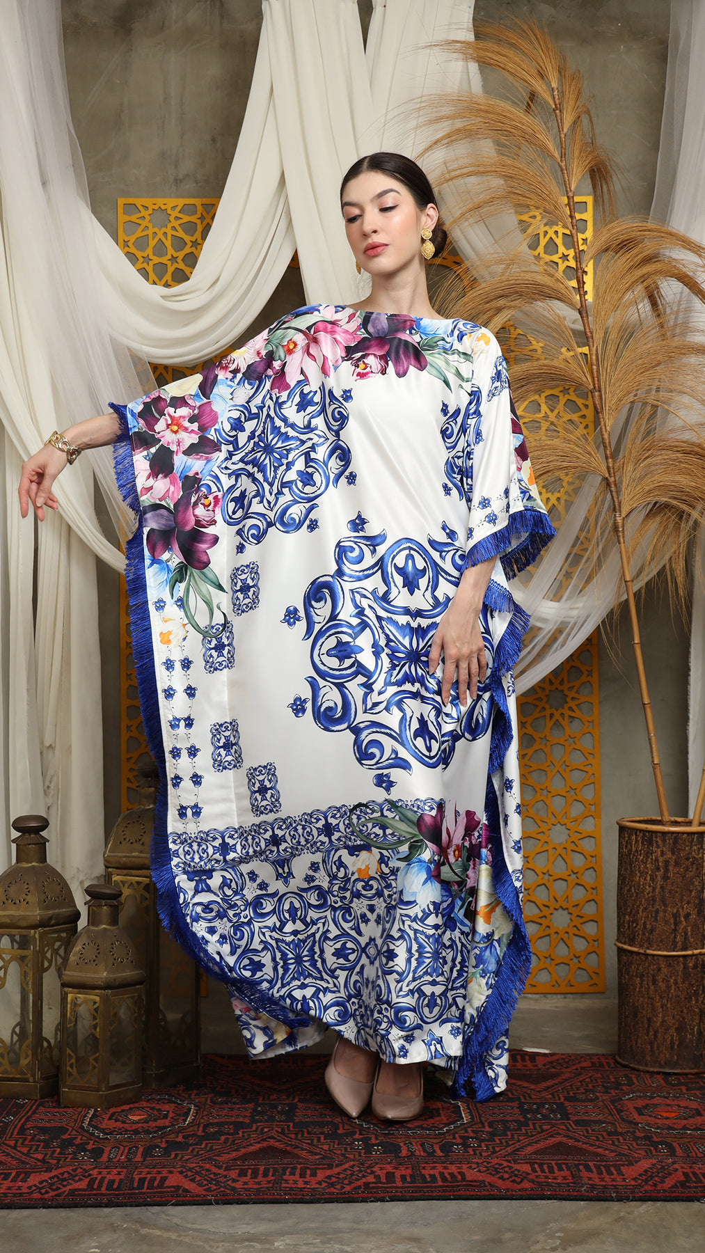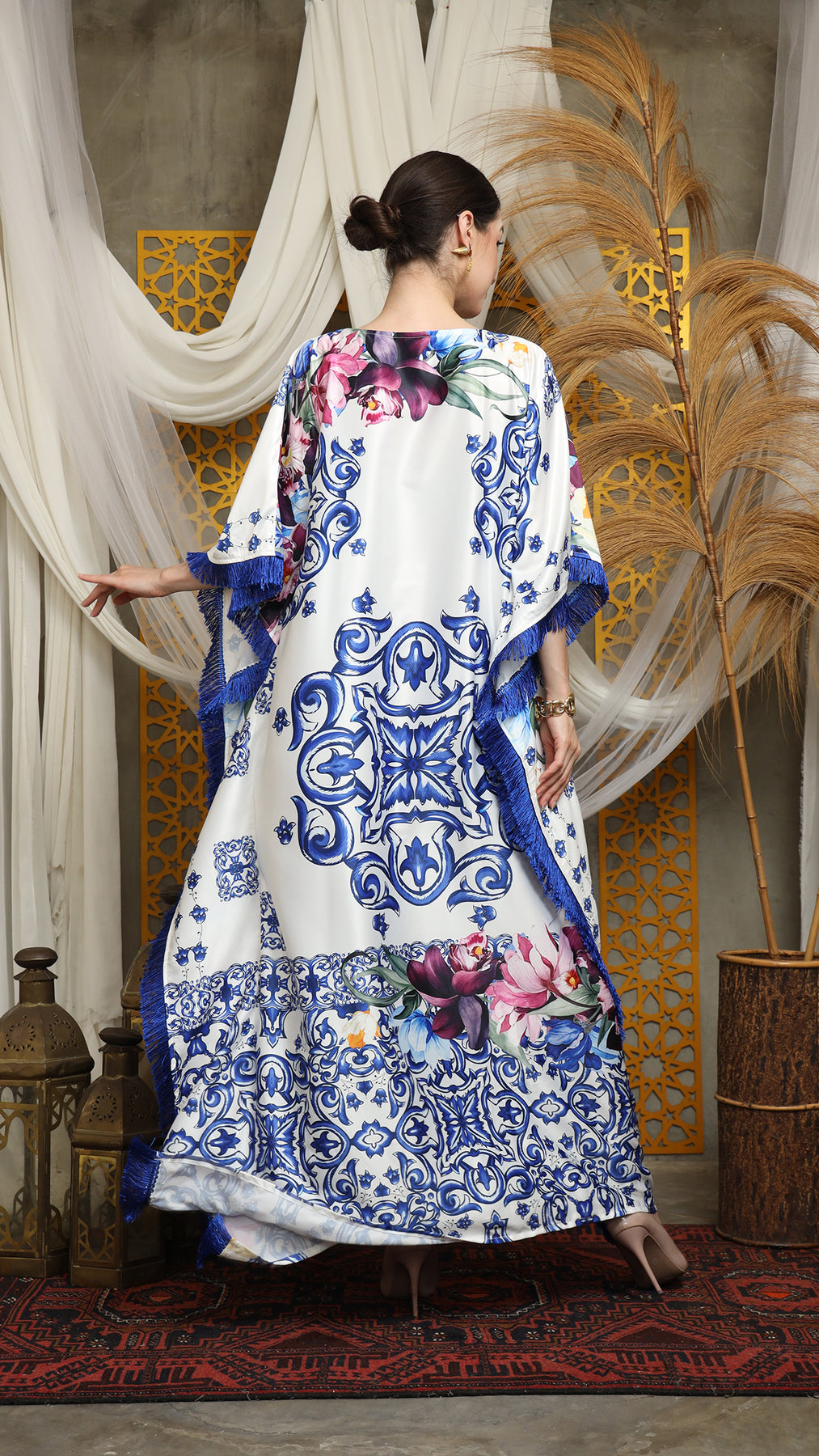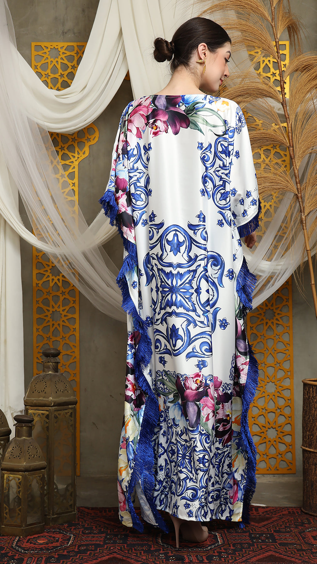 This kaftan is made from premium satin material, which has super comfortable to lounge around in, adjustable drawstring, and flattering neckline is an added feature which offers a glamorous way to cover up and perfect for evening wear. A short fringe kaftan that brings effortless drama and easy elegance. Cut in a relaxed, breezy silhouette, it drapes beautifully over the body while allowing freedom of movement. The playful fringe detailing adds texture and motion, swaying with every step for a touch of bohemian glamour