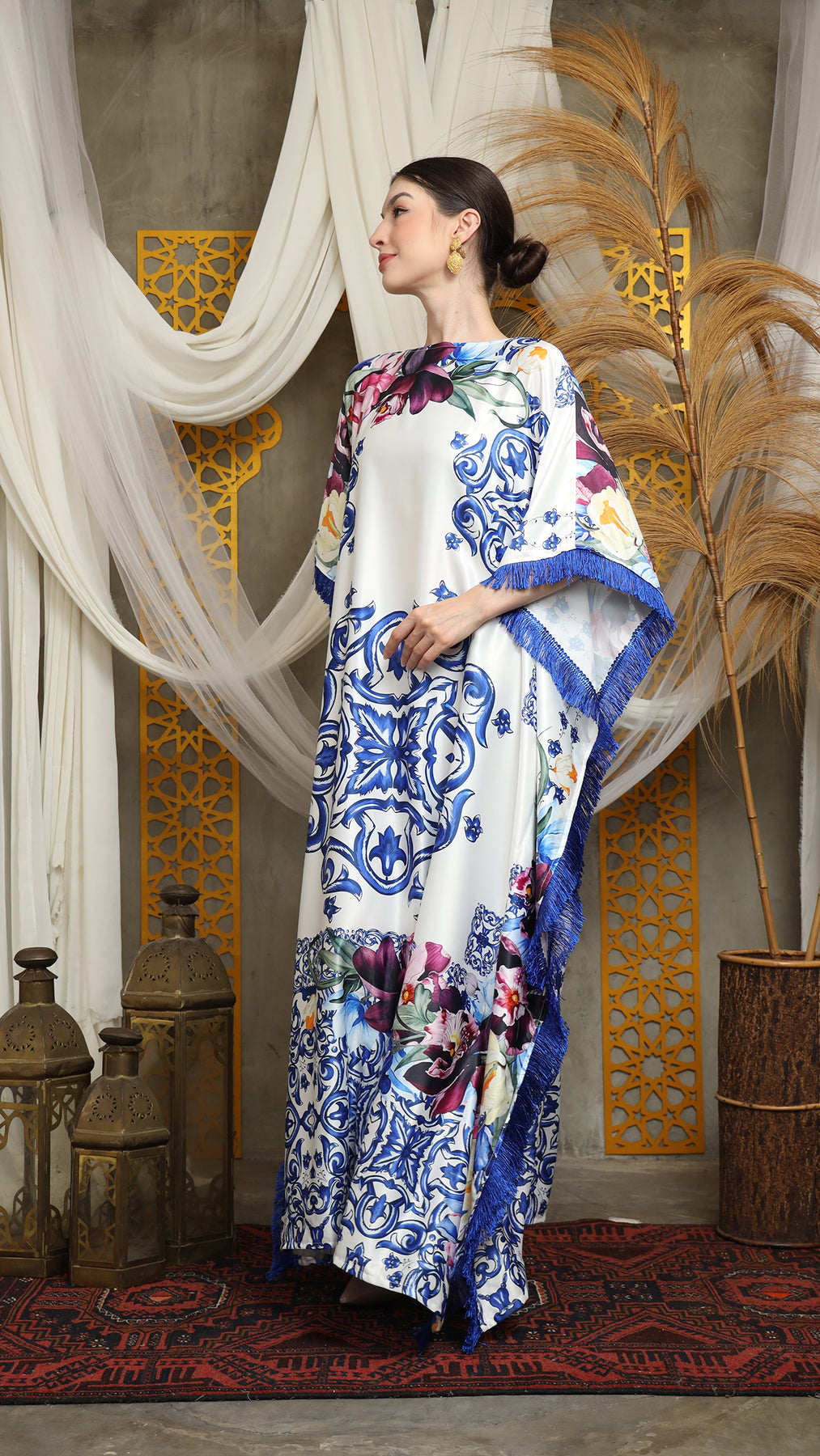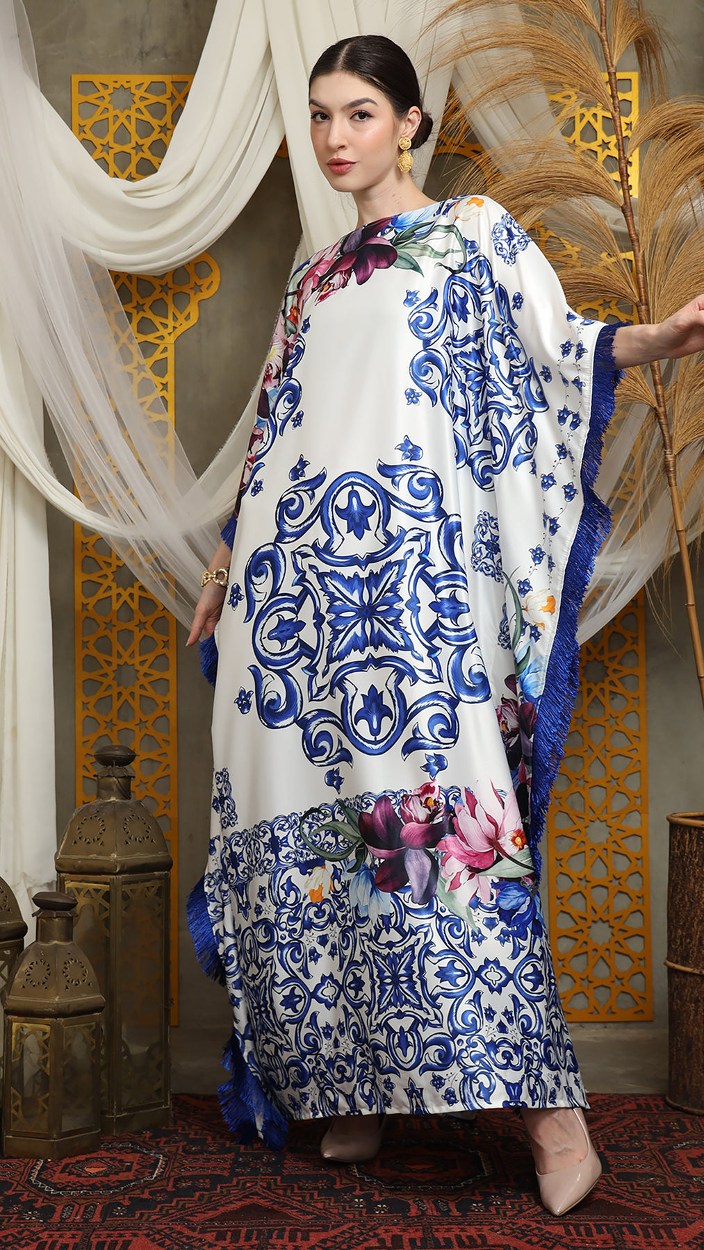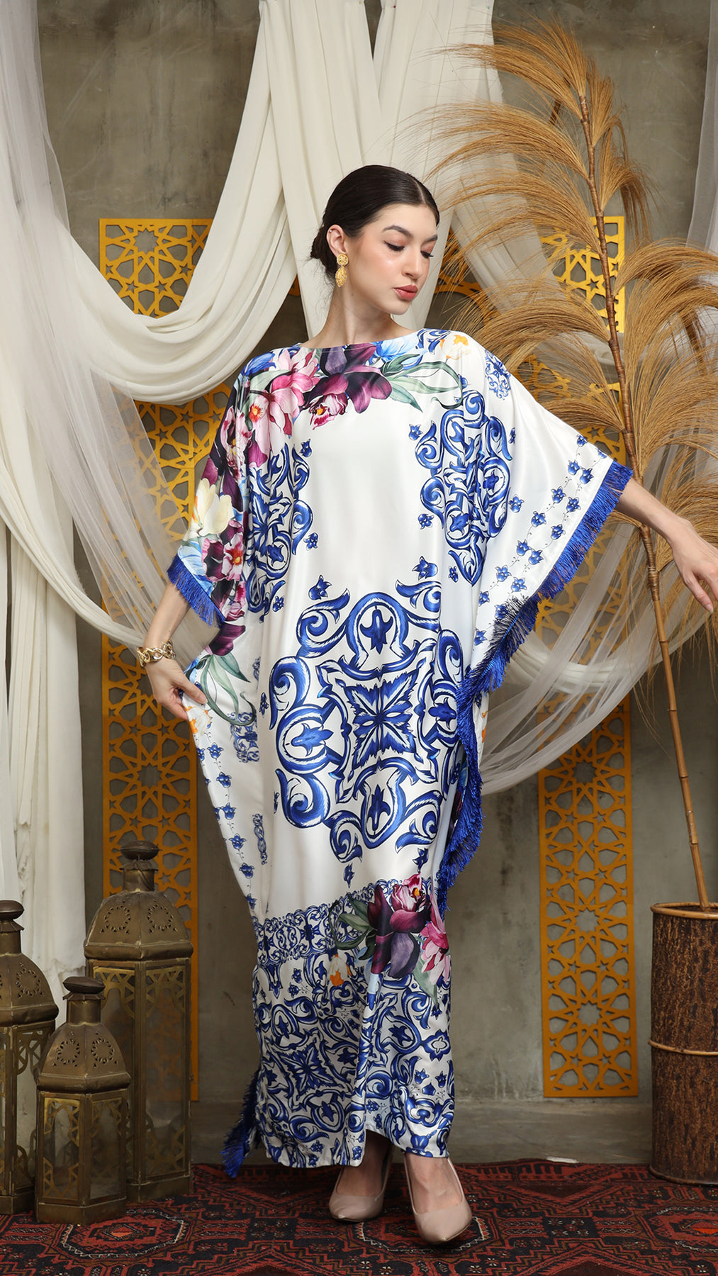 This kaftan is made from premium satin material, which has super comfortable to lounge around in, adjustable drawstring, and flattering neckline is an added feature which offers a glamorous way to cover up and perfect for evening wear. A short fringe kaftan that brings effortless drama and easy elegance. Cut in a relaxed, breezy silhouette, it drapes beautifully over the body while allowing freedom of movement. The playful fringe detailing adds texture and motion, swaying with every step for a touch of bohemian glamour