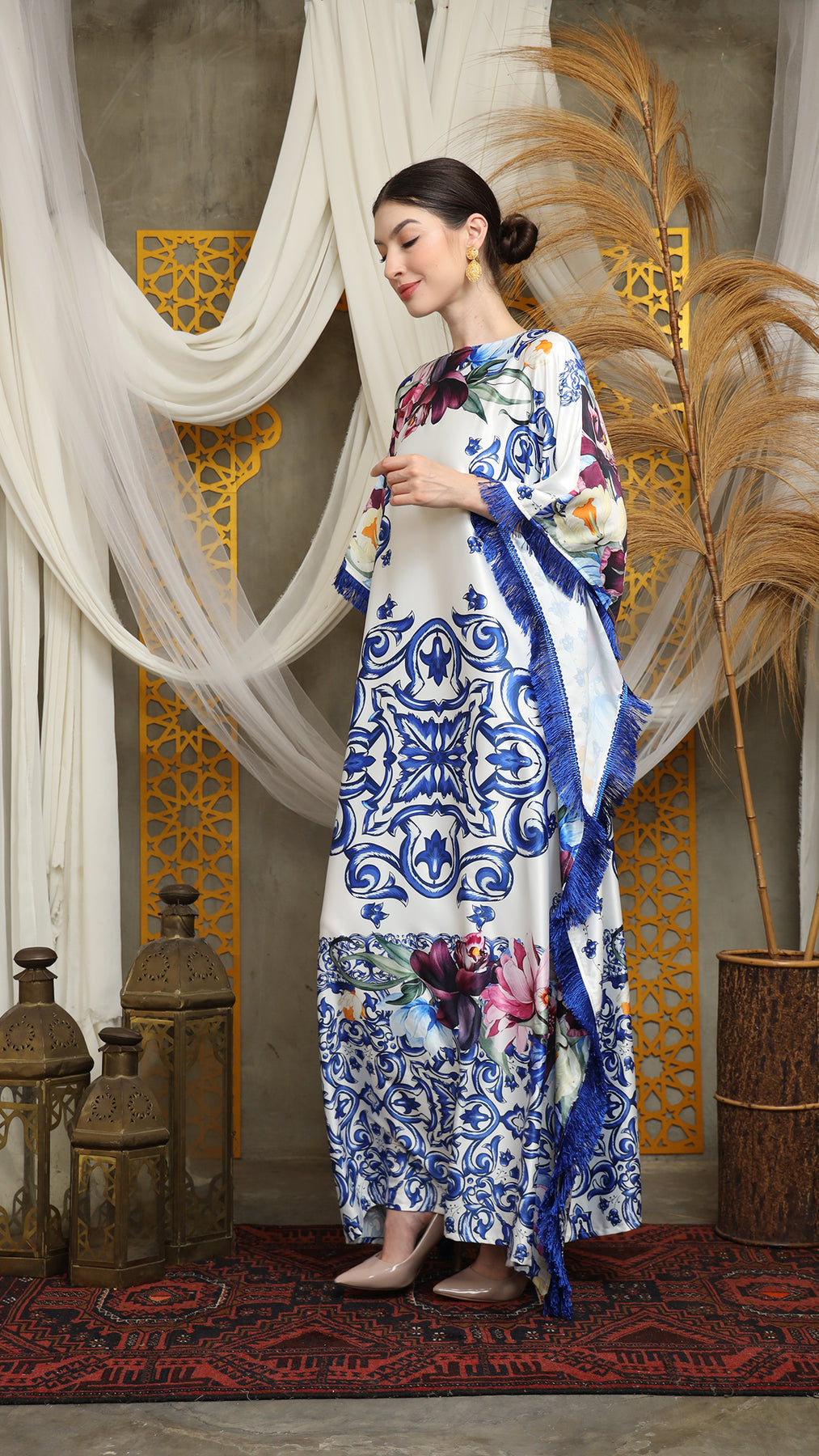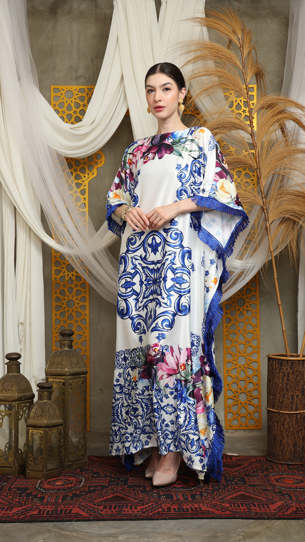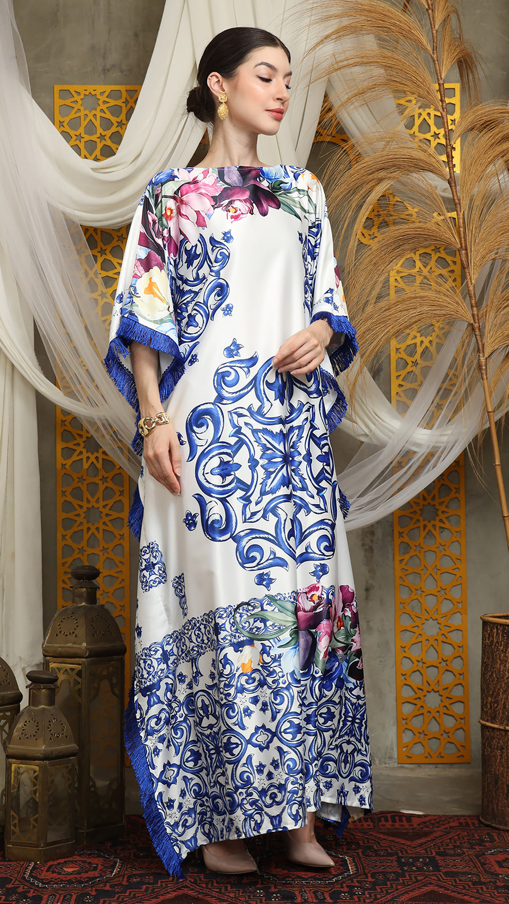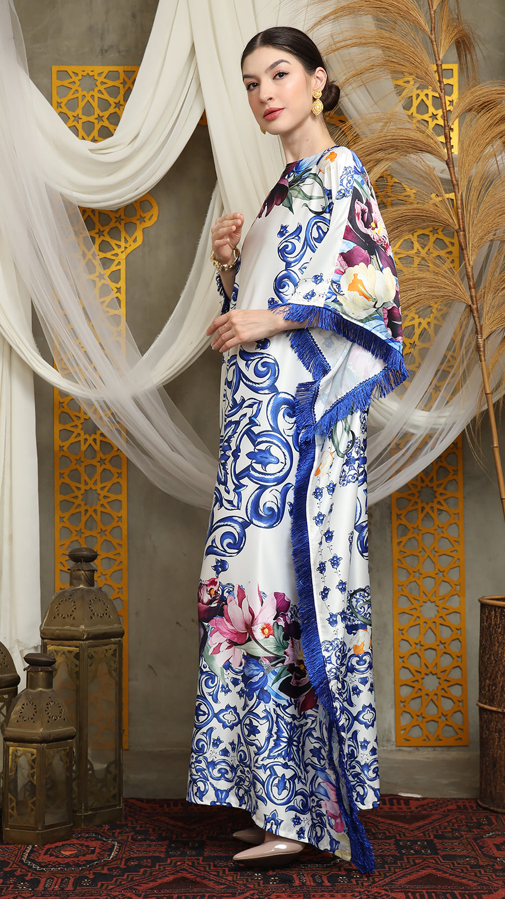 This kaftan is made from premium satin material, which has super comfortable to lounge around in, adjustable drawstring, and flattering neckline is an added feature which offers a glamorous way to cover up and perfect for evening wear. A short fringe kaftan that brings effortless drama and easy elegance. Cut in a relaxed, breezy silhouette, it drapes beautifully over the body while allowing freedom of movement. The playful fringe detailing adds texture and motion, swaying with every step for a touch of bohemian glamour
