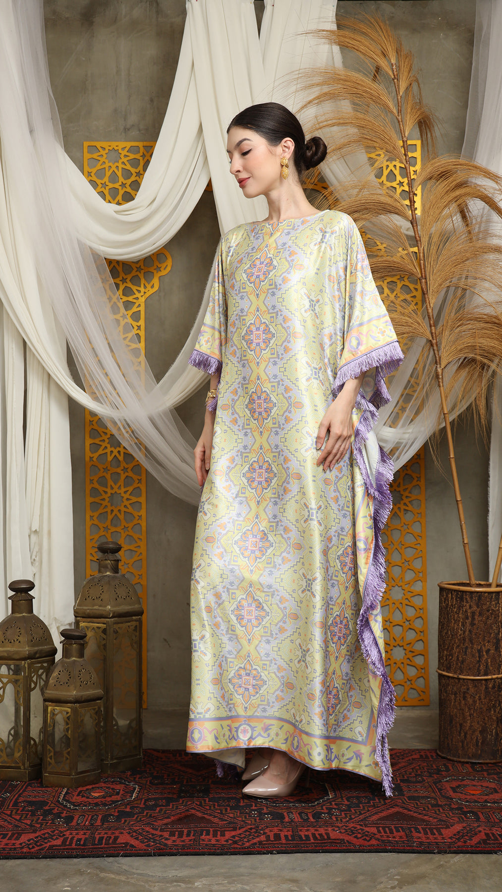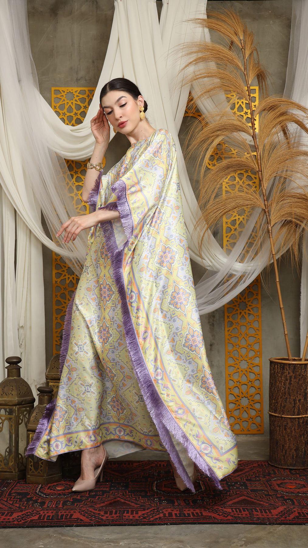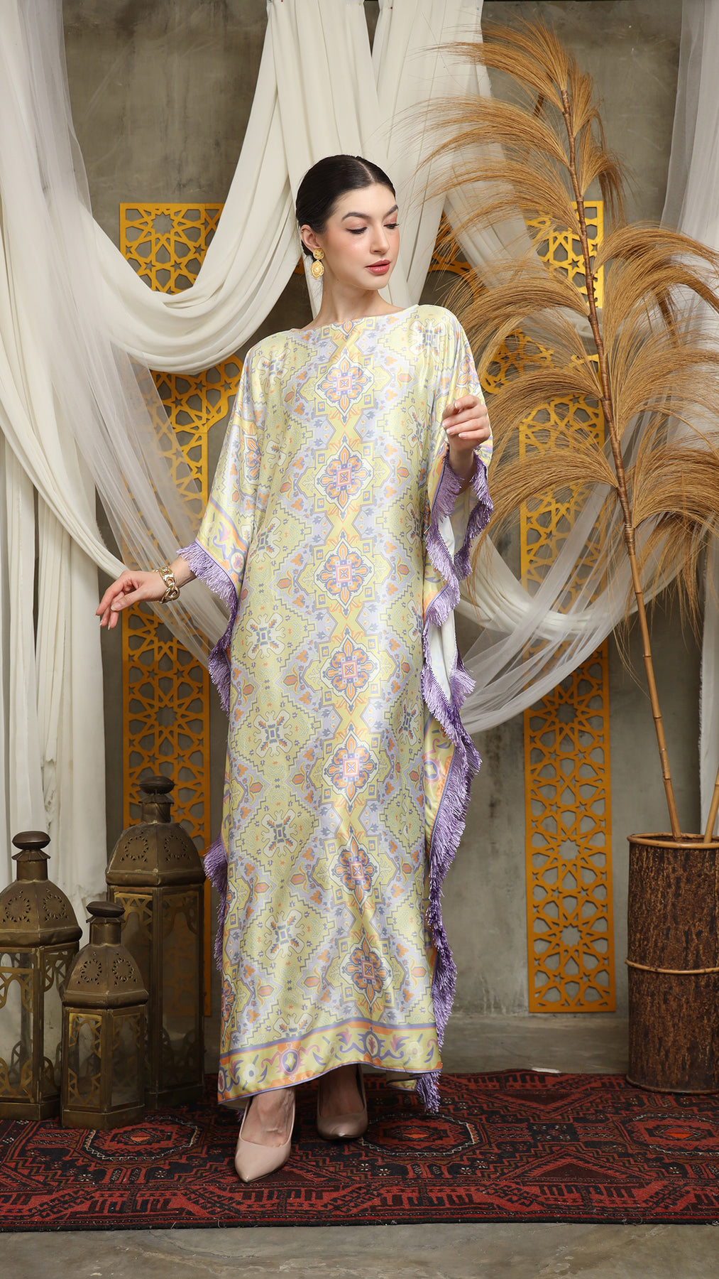 This kaftan is made from premium satin material, which has super comfortable to lounge around in, adjustable drawstring, and flattering neckline is an added feature which offers a glamorous way to cover up and perfect for evening wear. A short fringe kaftan that brings effortless drama and easy elegance. Cut in a relaxed, breezy silhouette, it drapes beautifully over the body while allowing freedom of movement. The playful fringe detailing adds texture and motion, swaying with every step for a touch of bohemian glamour