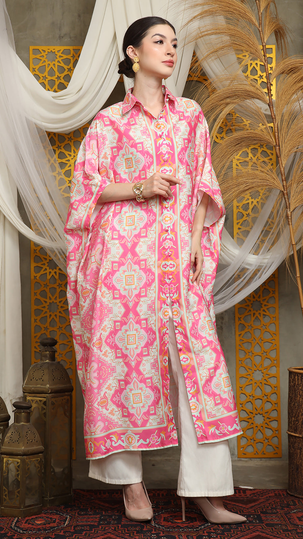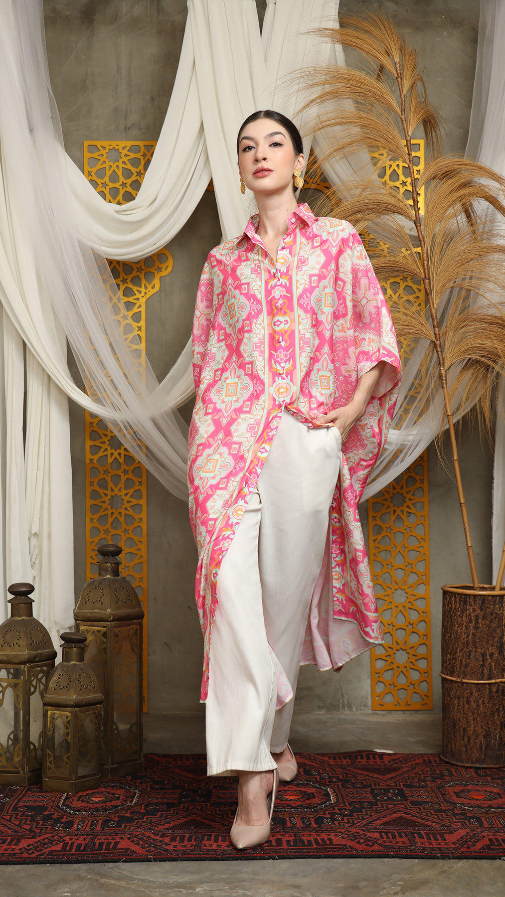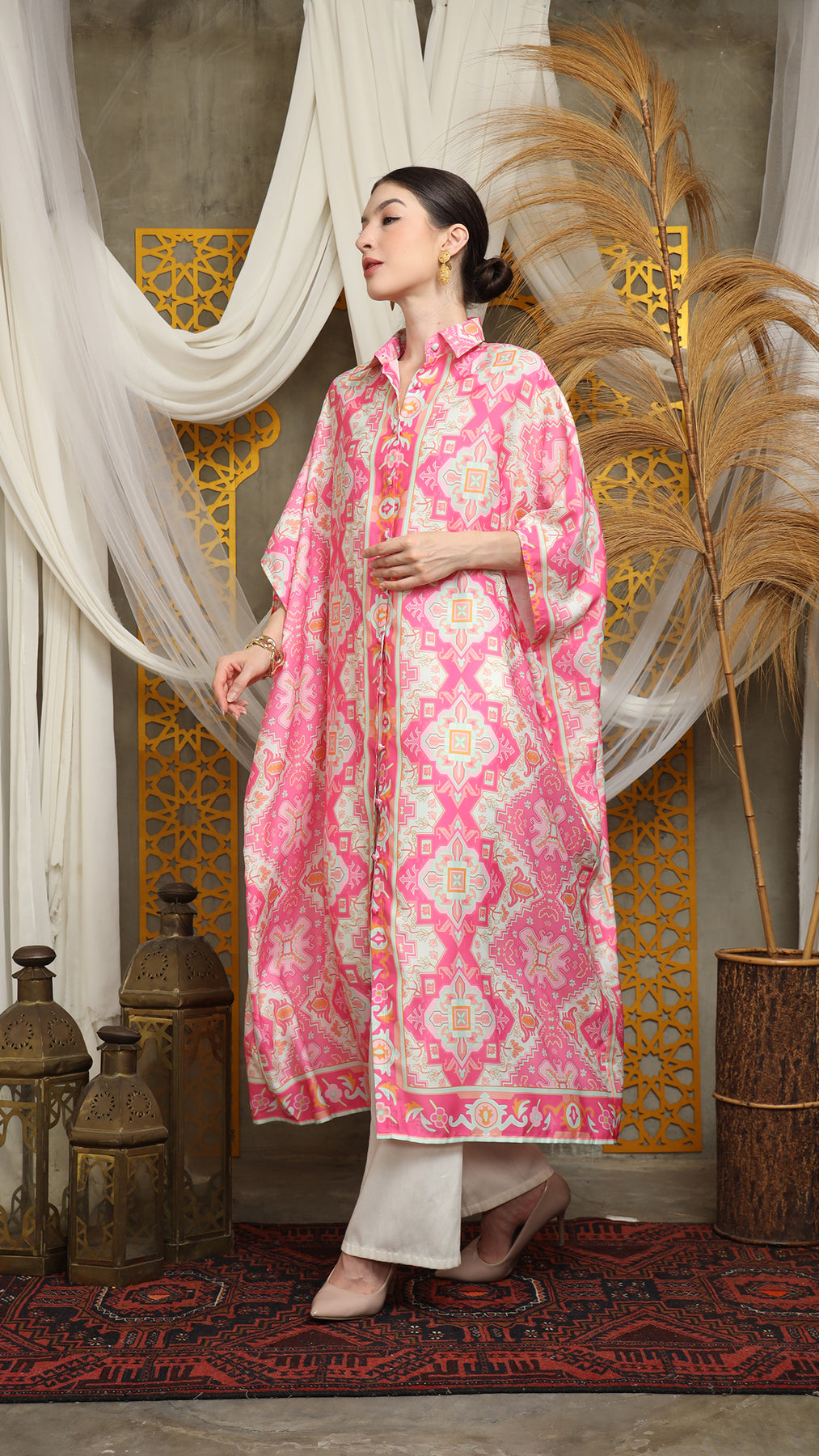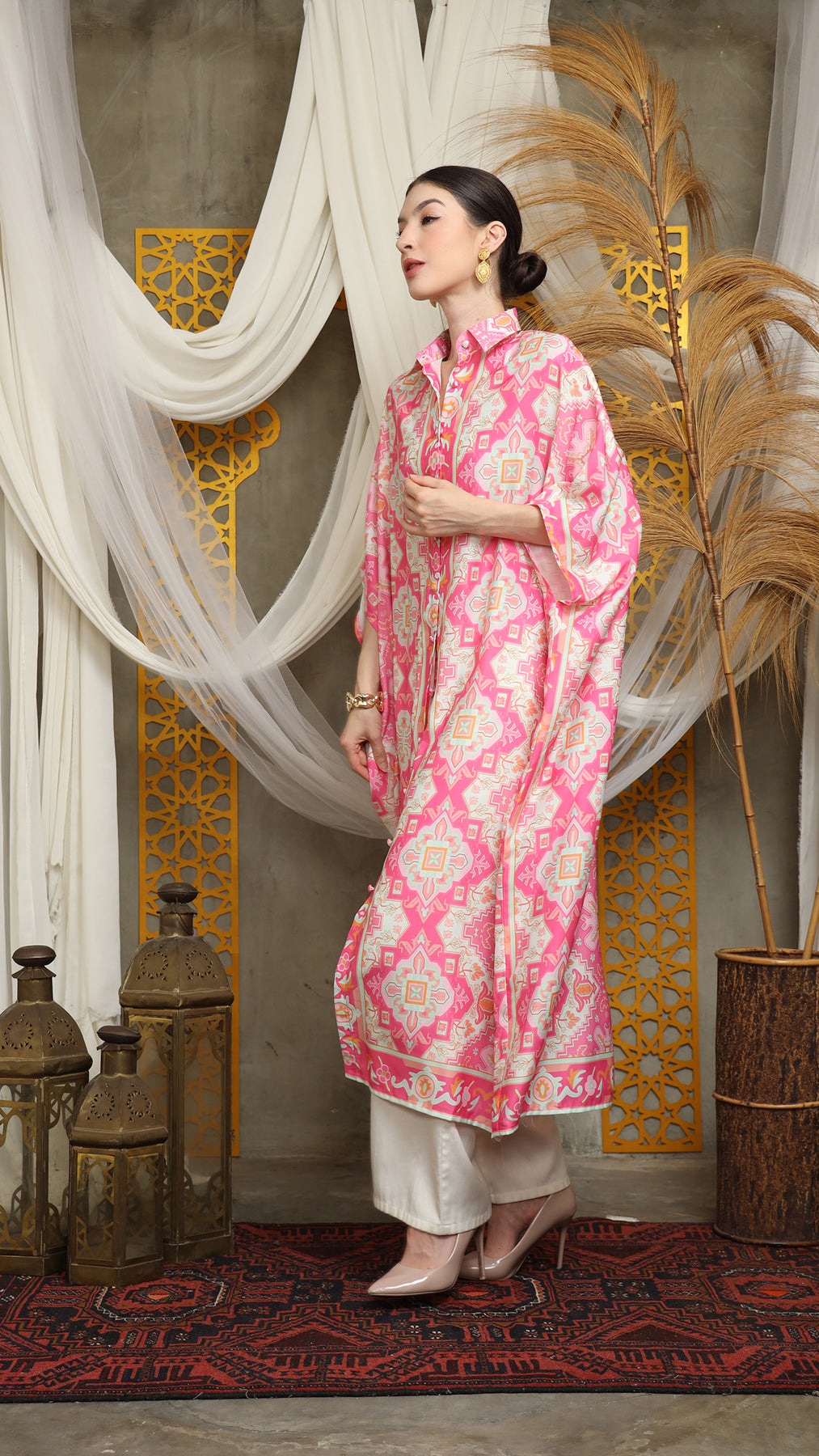 The Button Kaftan is a versatile, timeless piece that effortlessly blends style and comfort. Crafted from lightweight satin, it offers a luxurious feel and graceful drape, making it perfect for a variety of occasions. Designed with a convenient button-front fastening, it allows for easy wear and adjustable styling. The elegant motif adds a refined, sophisticated touch, elevating any look. Whether styled casually or worn as a chic outer layer, this kaftan adapts beautifully to different personal styles. Paired with pants, it creates a polished, contemporary outfit with endless styling possibilities.