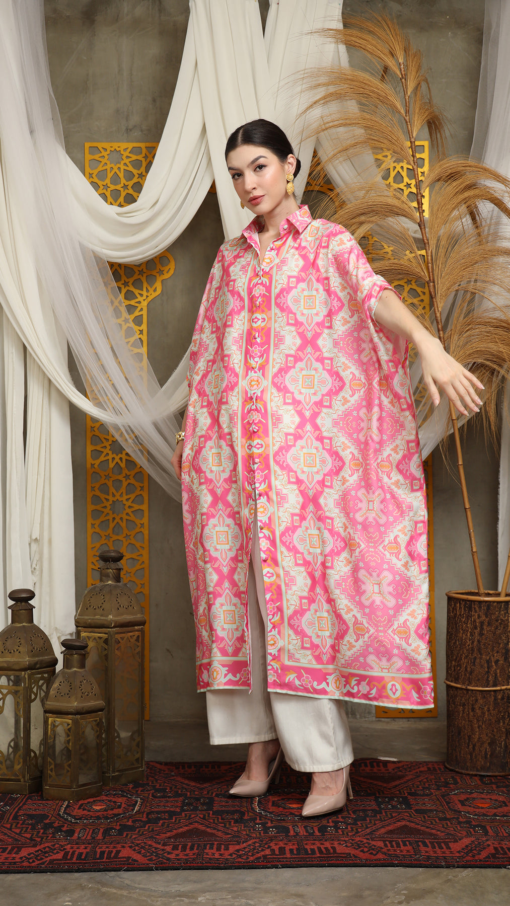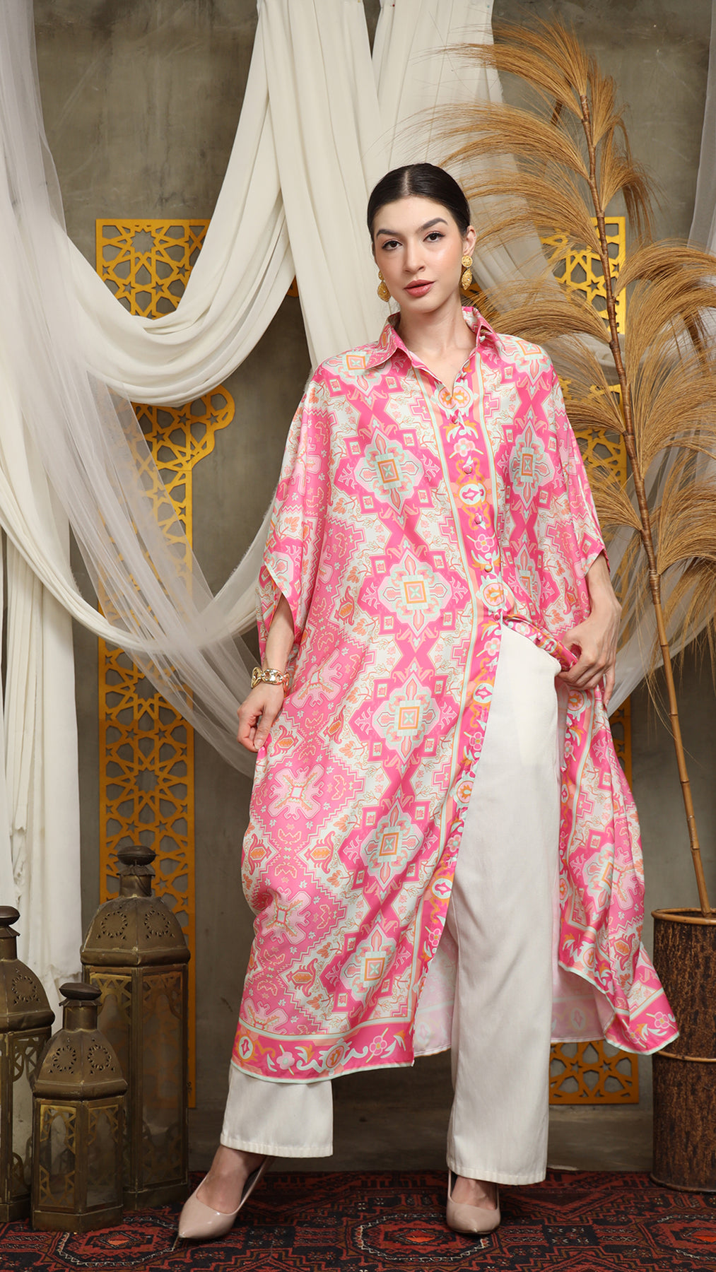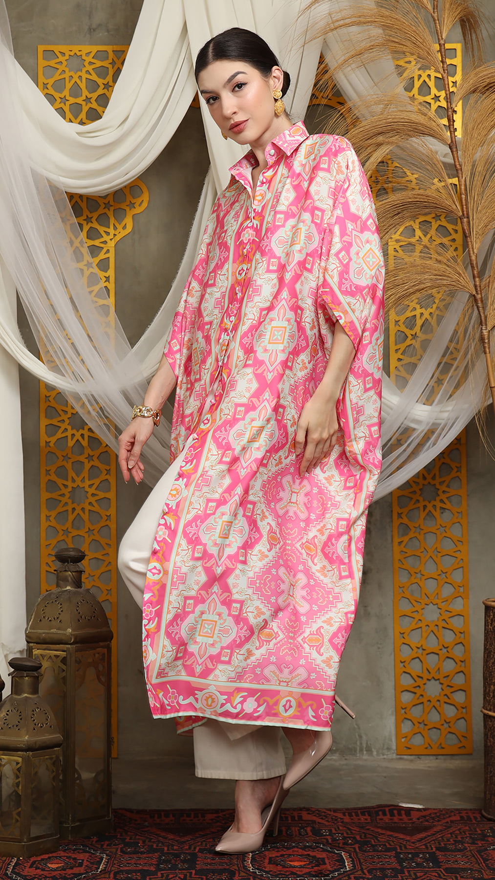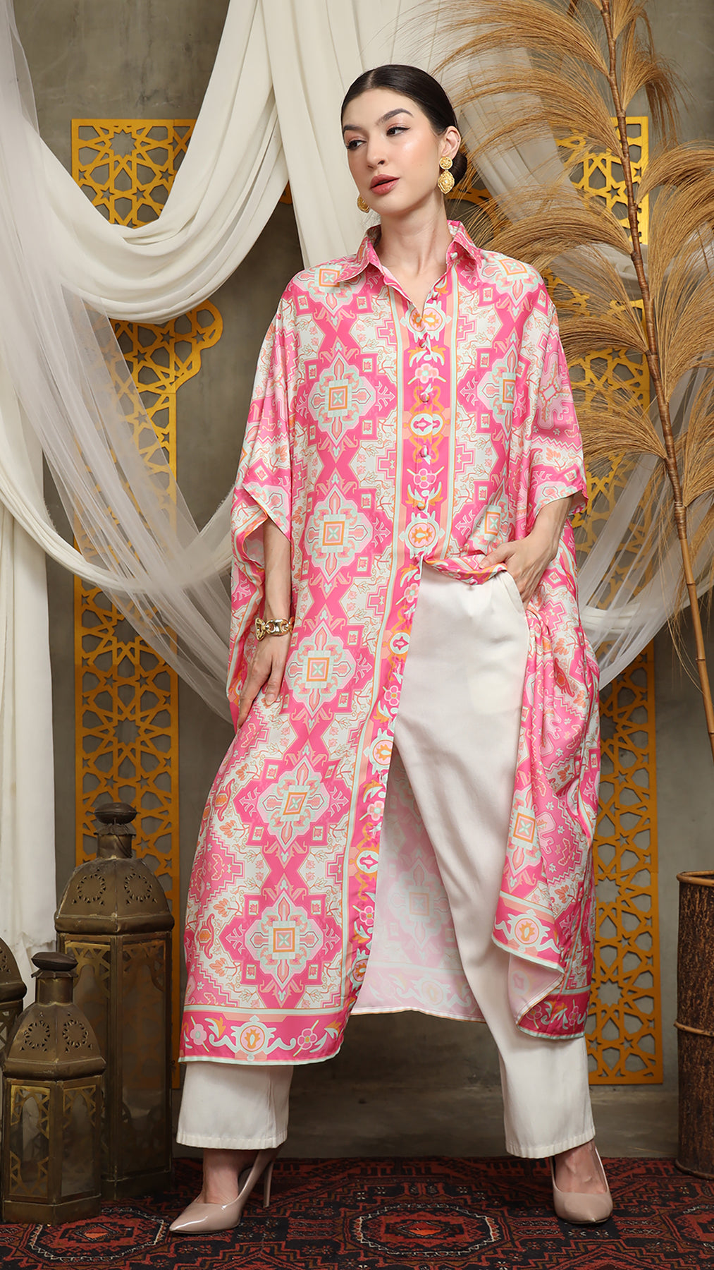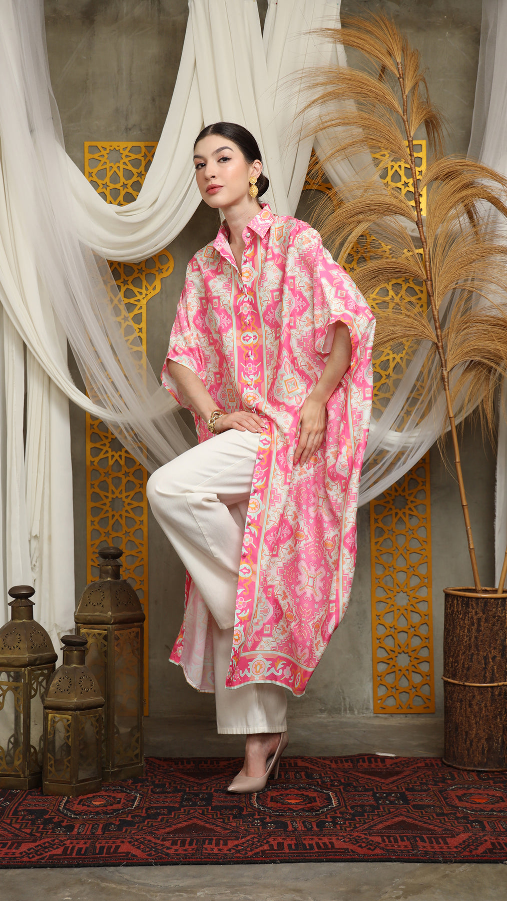 The Button Kaftan is a versatile, timeless piece that effortlessly blends style and comfort. Crafted from lightweight satin, it offers a luxurious feel and graceful drape, making it perfect for a variety of occasions. Designed with a convenient button-front fastening, it allows for easy wear and adjustable styling. The elegant motif adds a refined, sophisticated touch, elevating any look. Whether styled casually or worn as a chic outer layer, this kaftan adapts beautifully to different personal styles. Paired with pants, it creates a polished, contemporary outfit with endless styling possibilities.