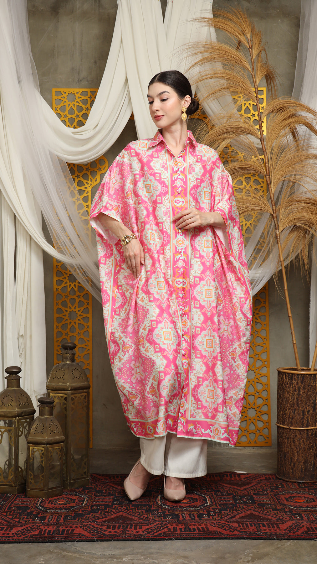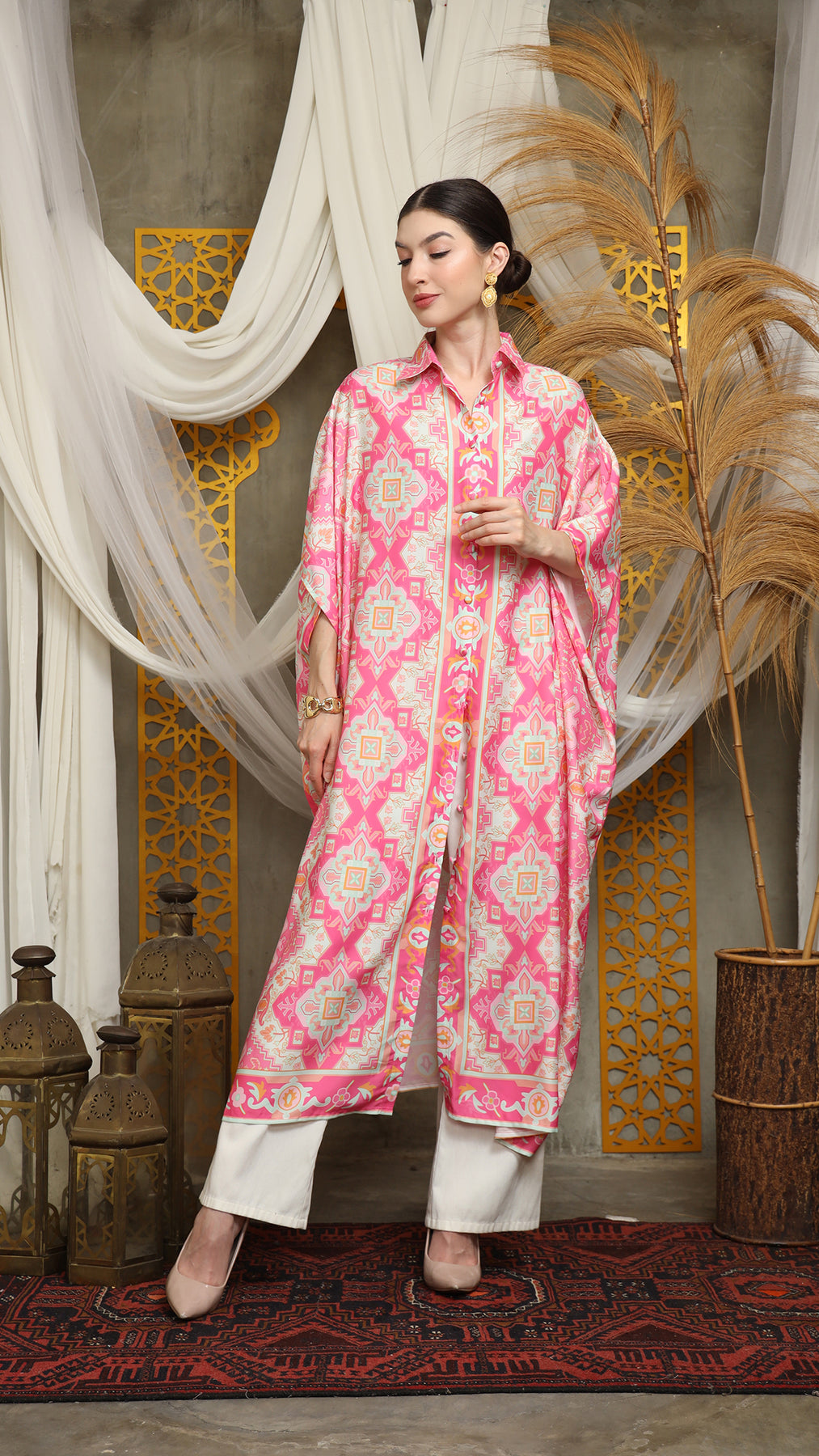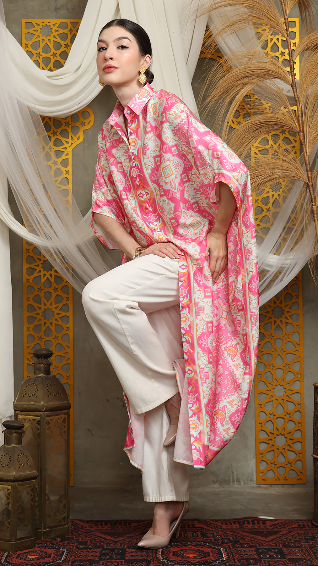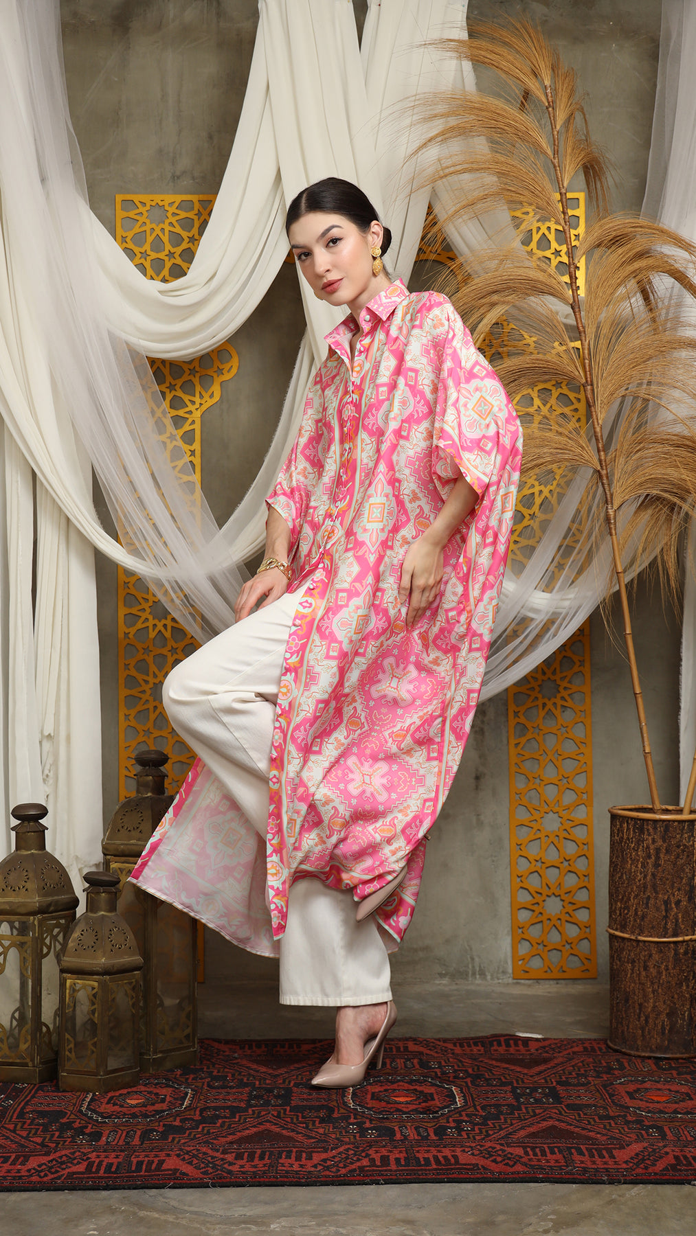 The Button Kaftan is a versatile, timeless piece that effortlessly blends style and comfort. Crafted from lightweight satin, it offers a luxurious feel and graceful drape, making it perfect for a variety of occasions. Designed with a convenient button-front fastening, it allows for easy wear and adjustable styling. The elegant motif adds a refined, sophisticated touch, elevating any look. Whether styled casually or worn as a chic outer layer, this kaftan adapts beautifully to different personal styles. Paired with pants, it creates a polished, contemporary outfit with endless styling possibilities.