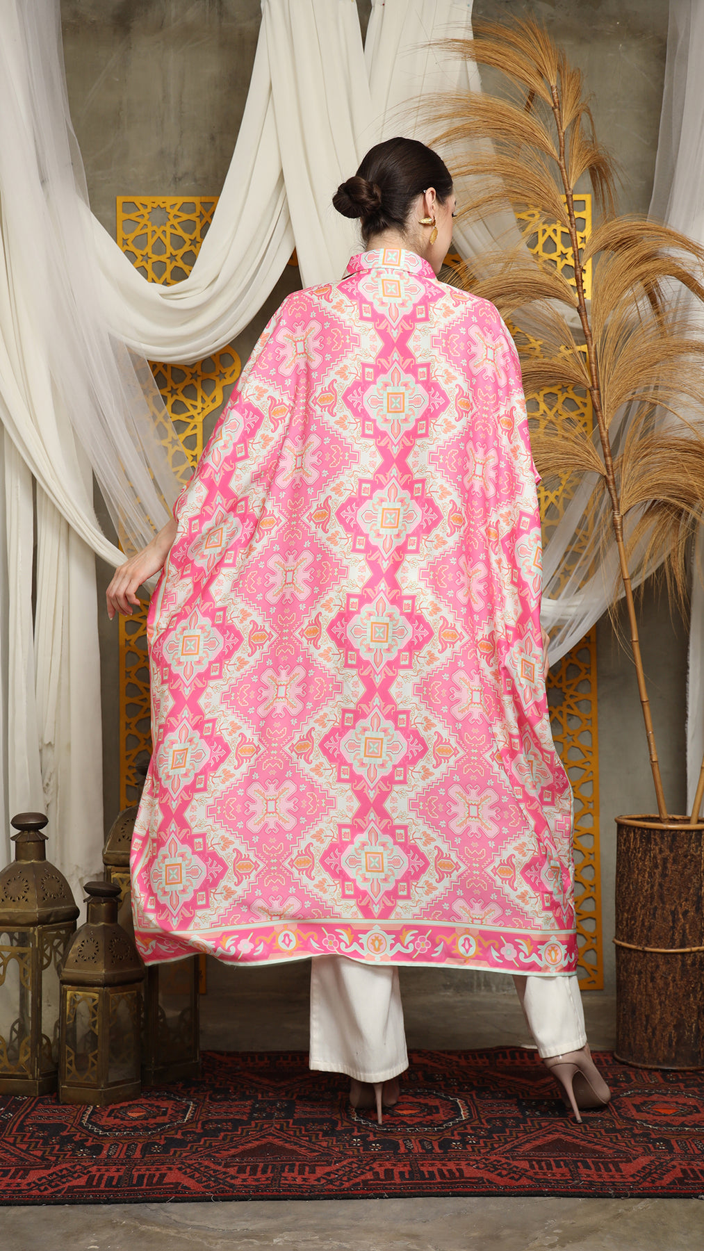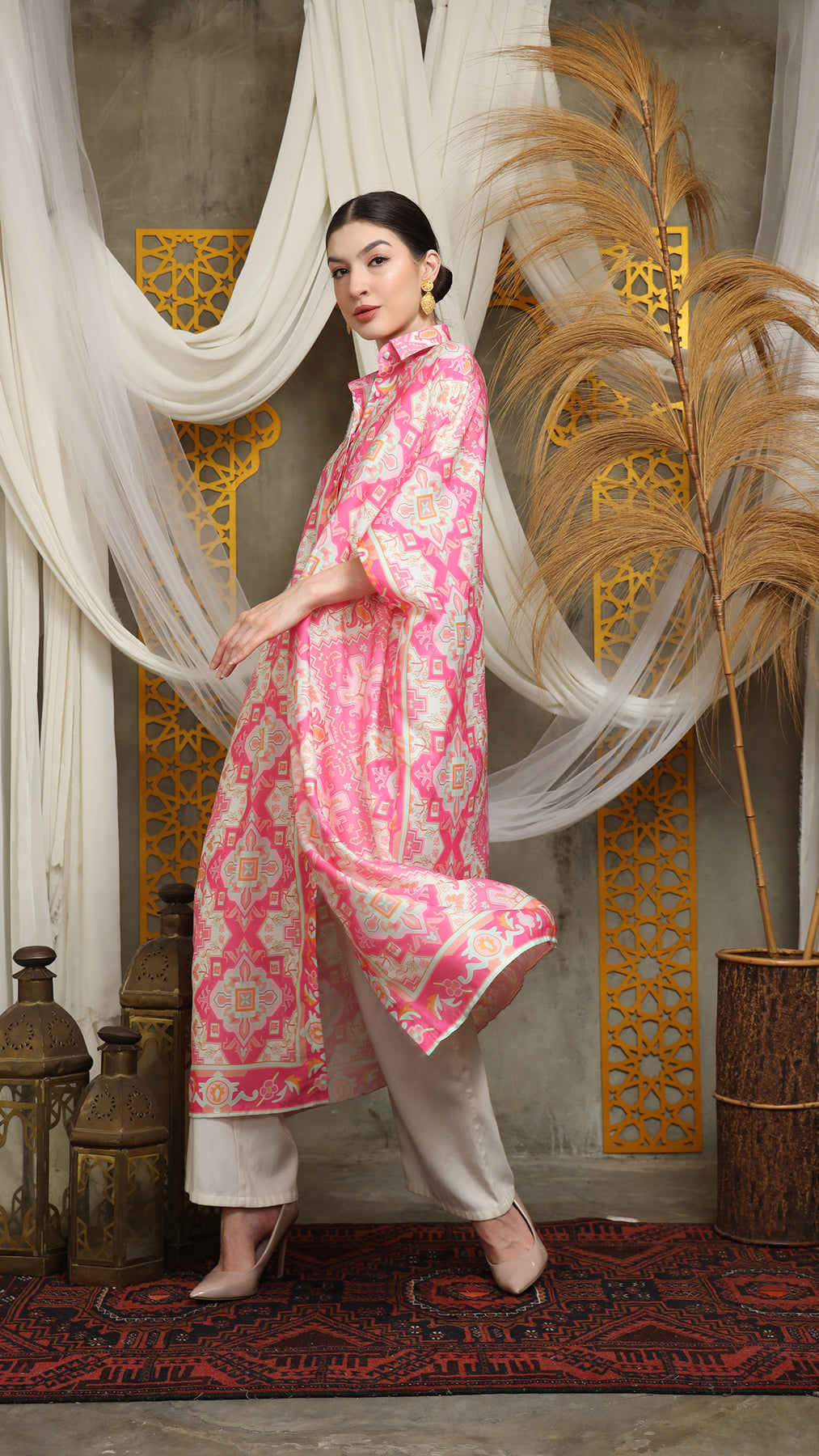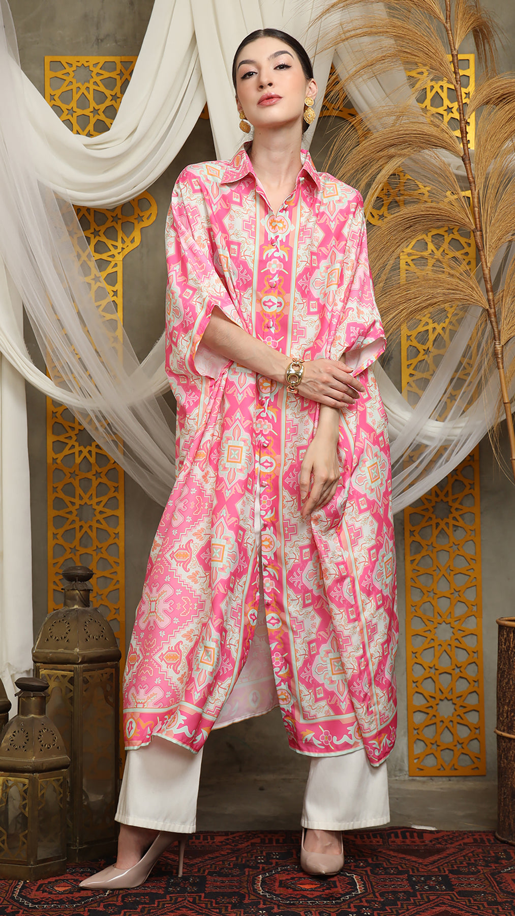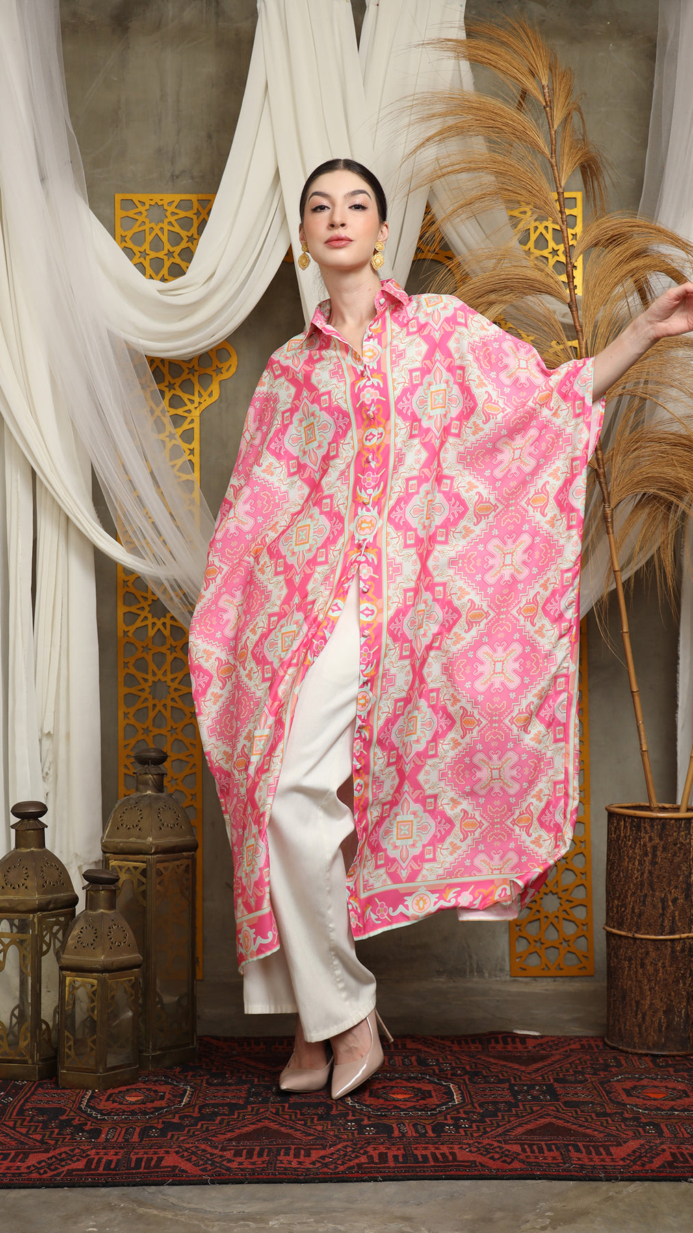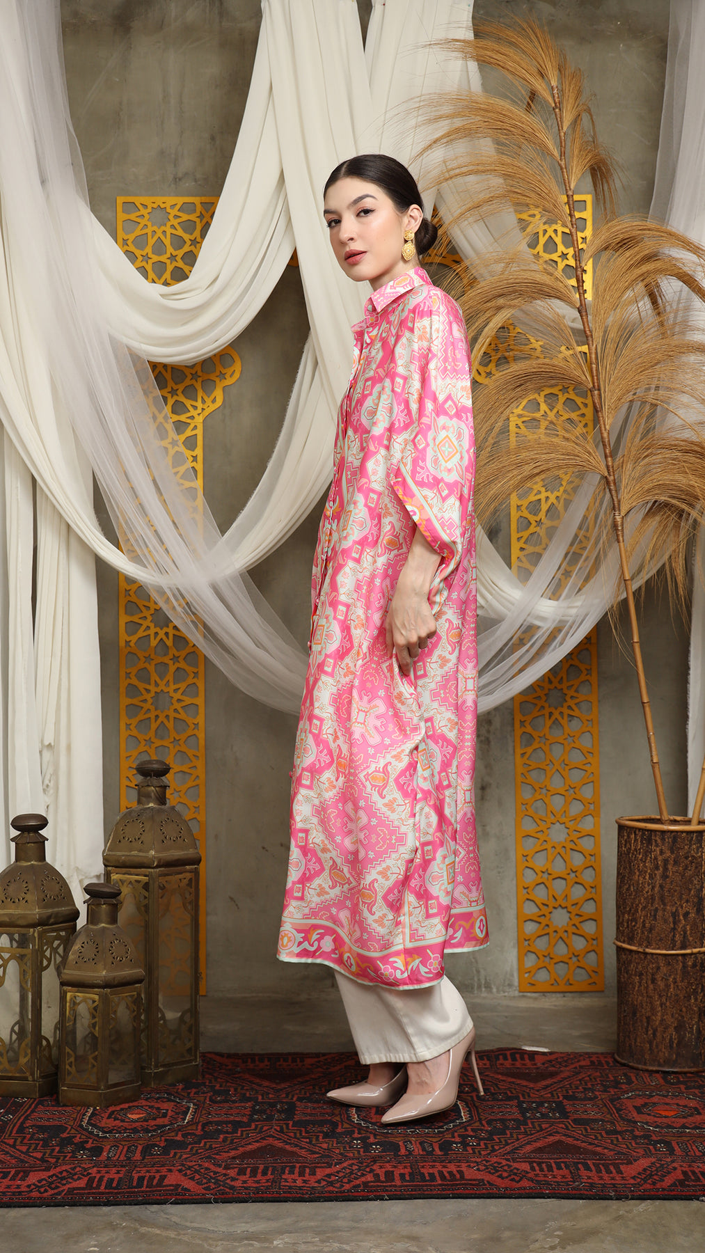 The Button Kaftan is a versatile, timeless piece that effortlessly blends style and comfort. Crafted from lightweight satin, it offers a luxurious feel and graceful drape, making it perfect for a variety of occasions. Designed with a convenient button-front fastening, it allows for easy wear and adjustable styling. The elegant motif adds a refined, sophisticated touch, elevating any look. Whether styled casually or worn as a chic outer layer, this kaftan adapts beautifully to different personal styles. Paired with pants, it creates a polished, contemporary outfit with endless styling possibilities.