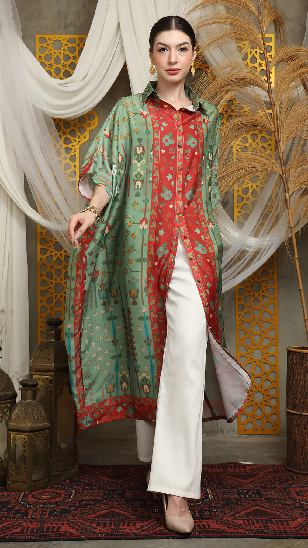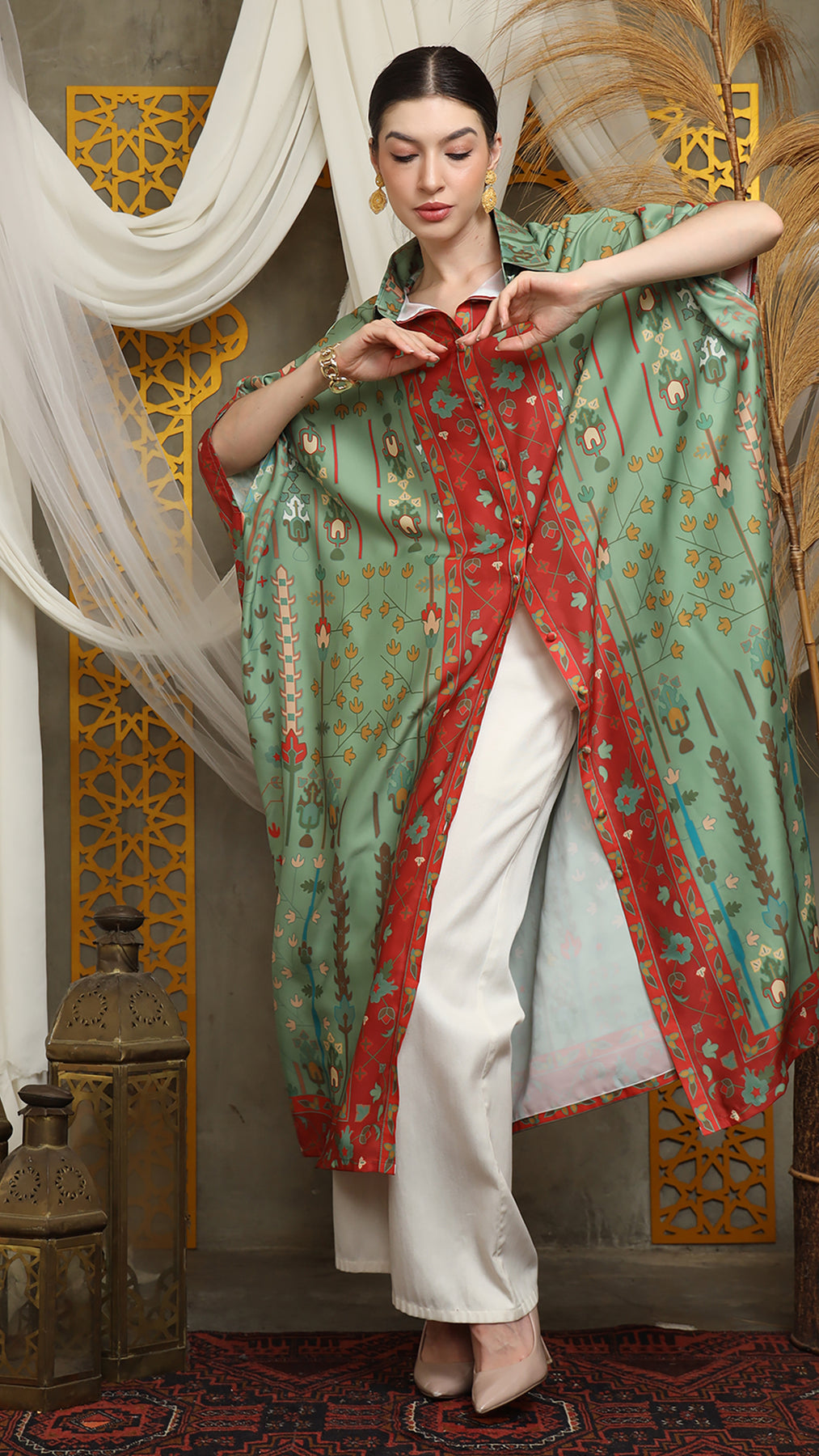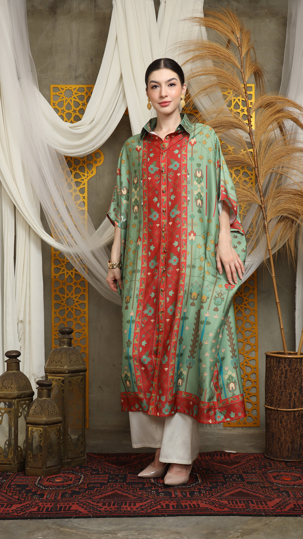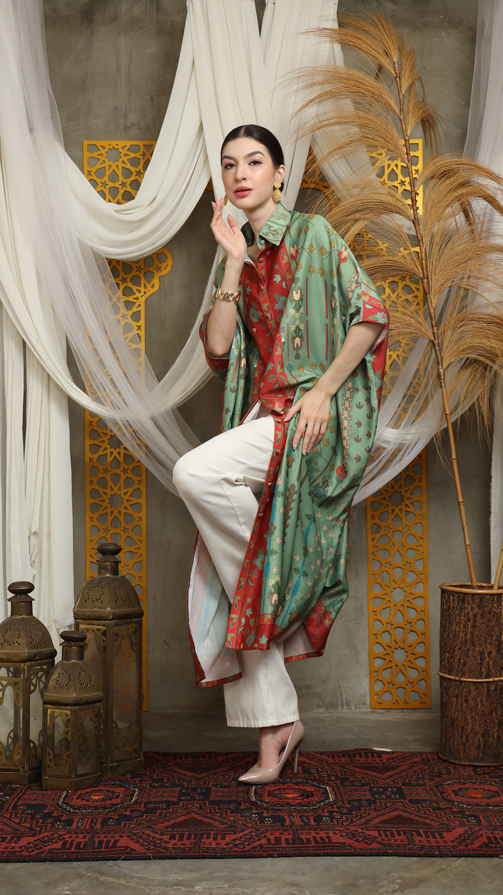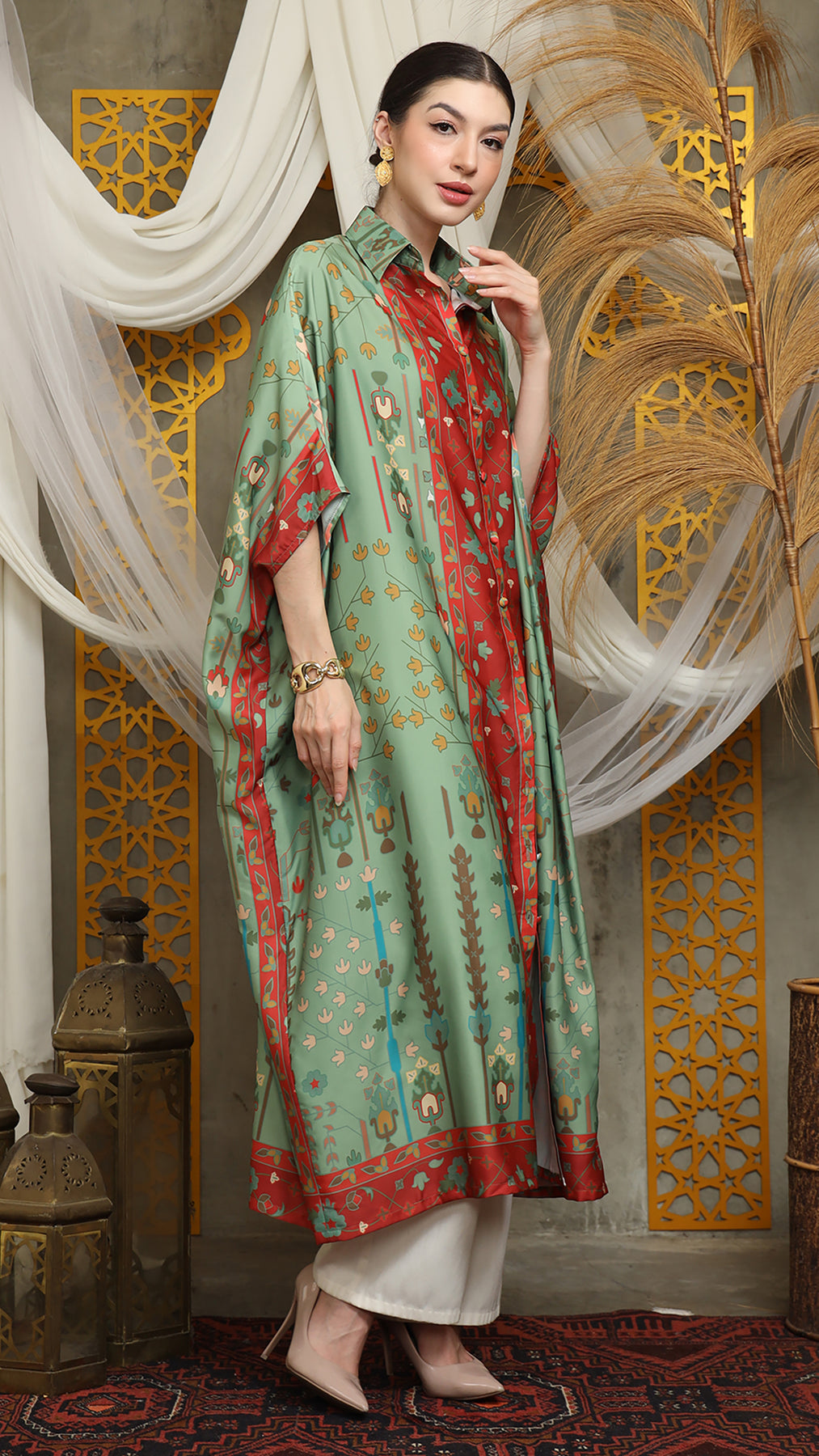 The Button Kaftan is a versatile, timeless piece that effortlessly blends style and comfort. Crafted from lightweight satin, it offers a luxurious feel and graceful drape, making it perfect for a variety of occasions. Designed with a convenient button-front fastening, it allows for easy wear and adjustable styling. The elegant motif adds a refined, sophisticated touch, elevating any look. Whether styled casually or worn as a chic outer layer, this kaftan adapts beautifully to different personal styles. Paired with pants, it creates a polished, contemporary outfit with endless styling possibilities.