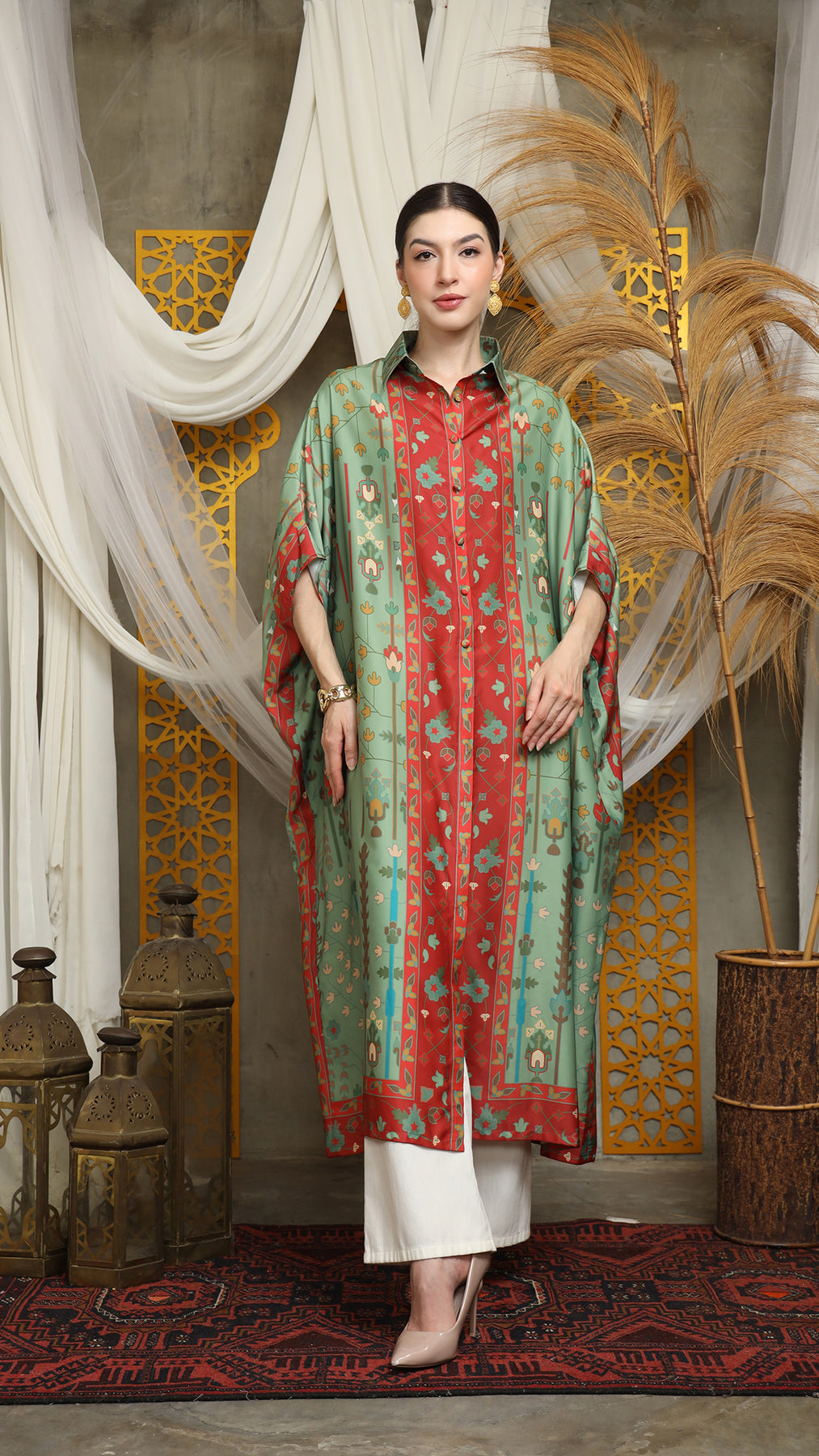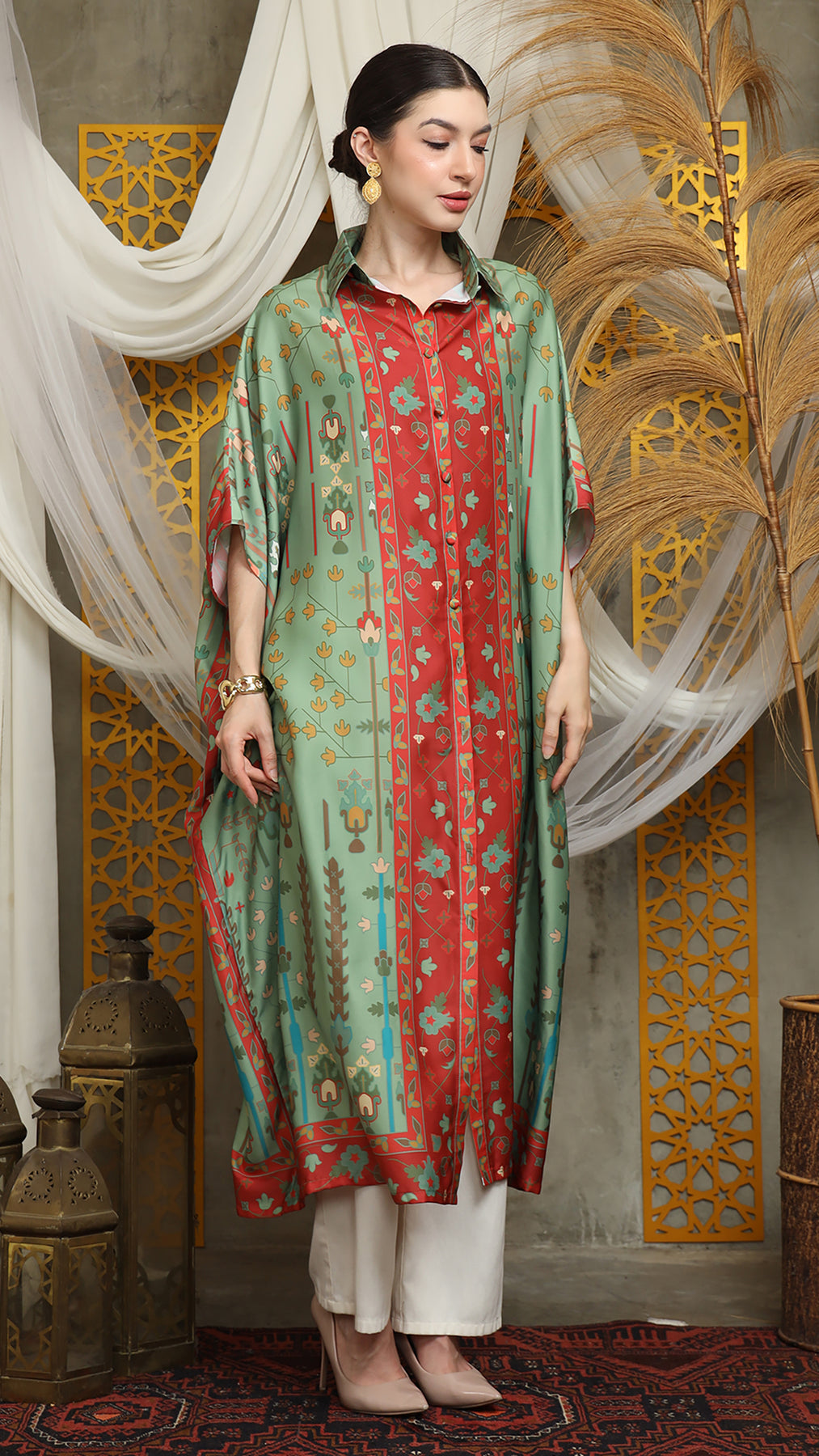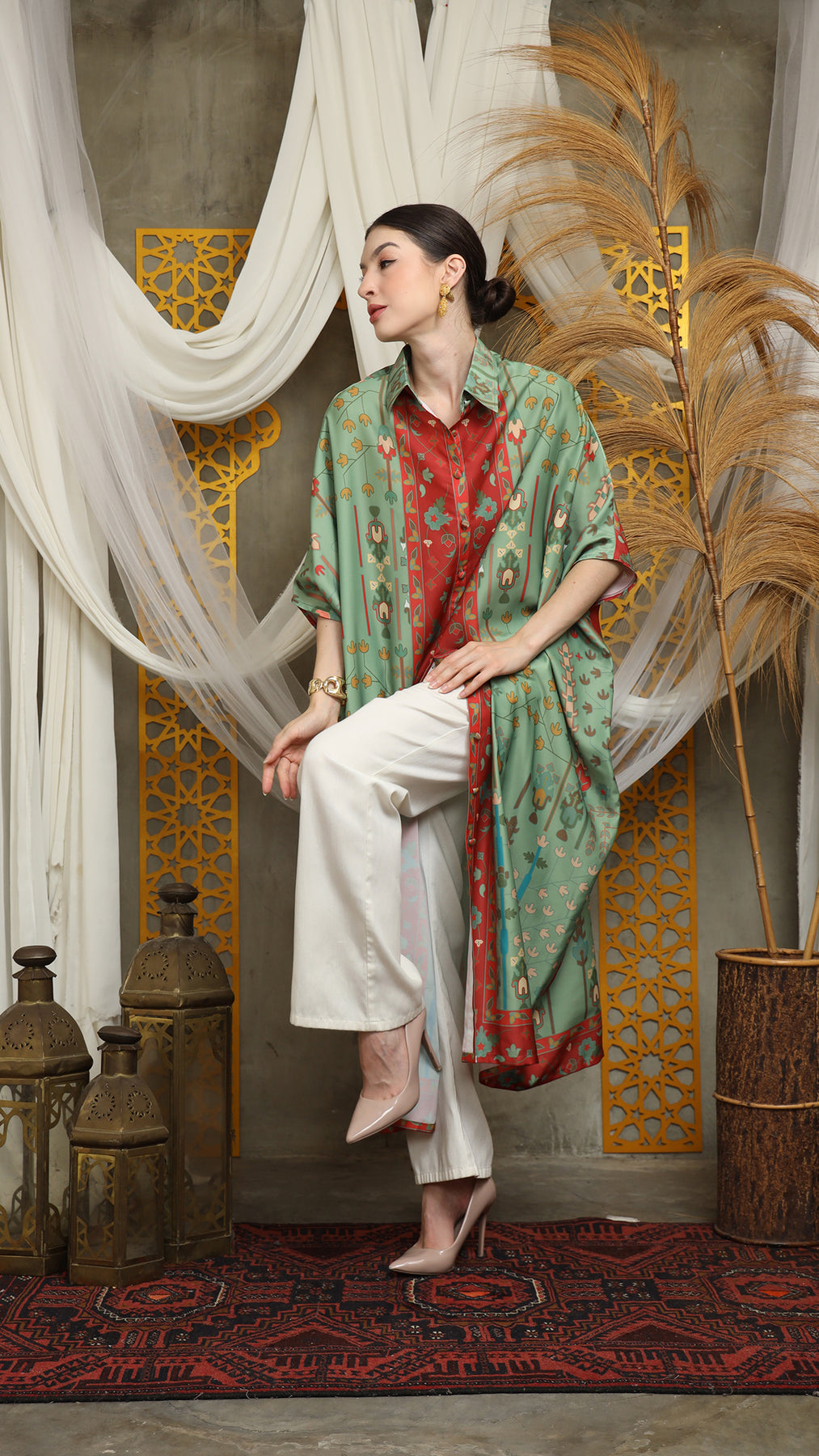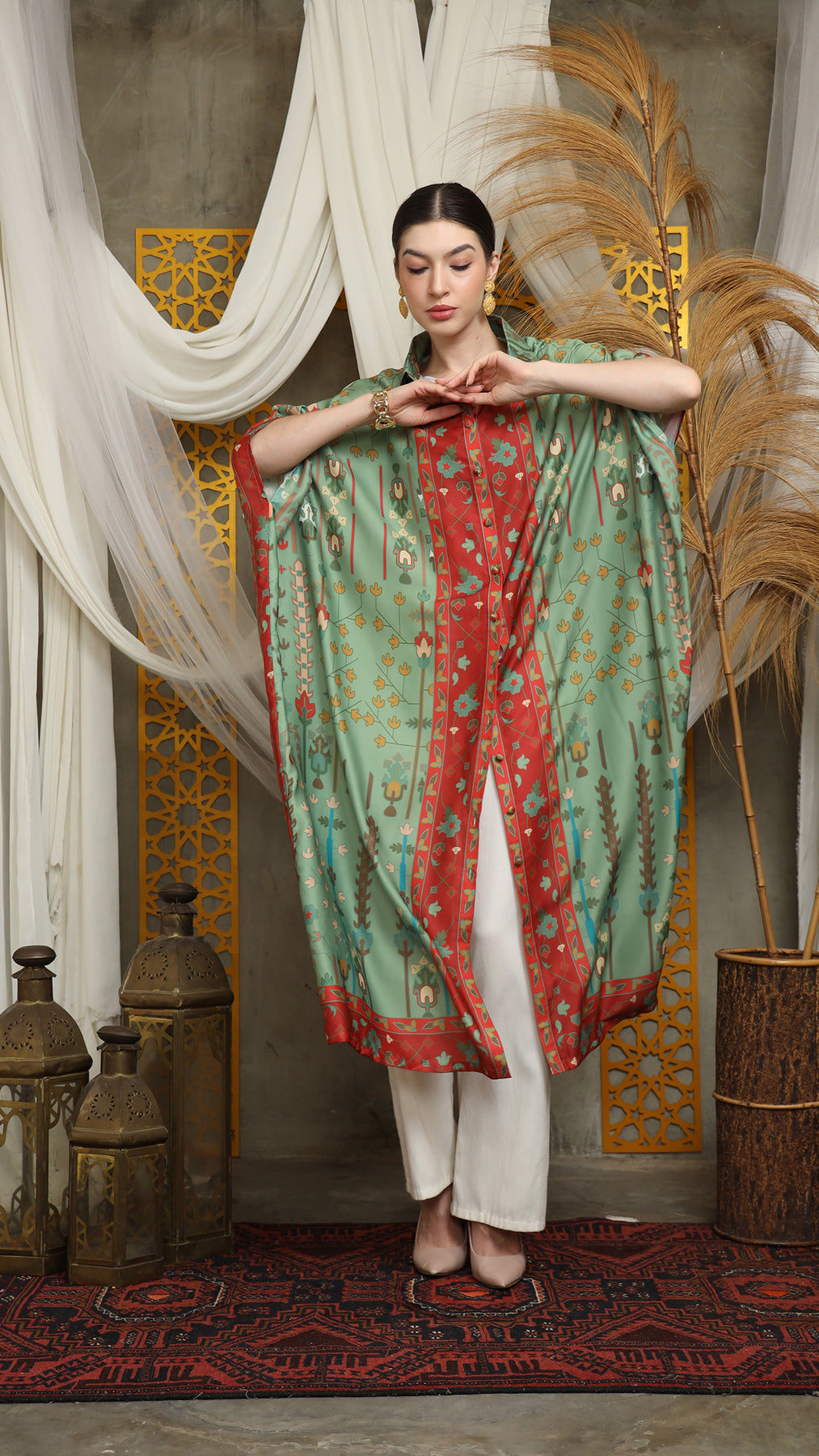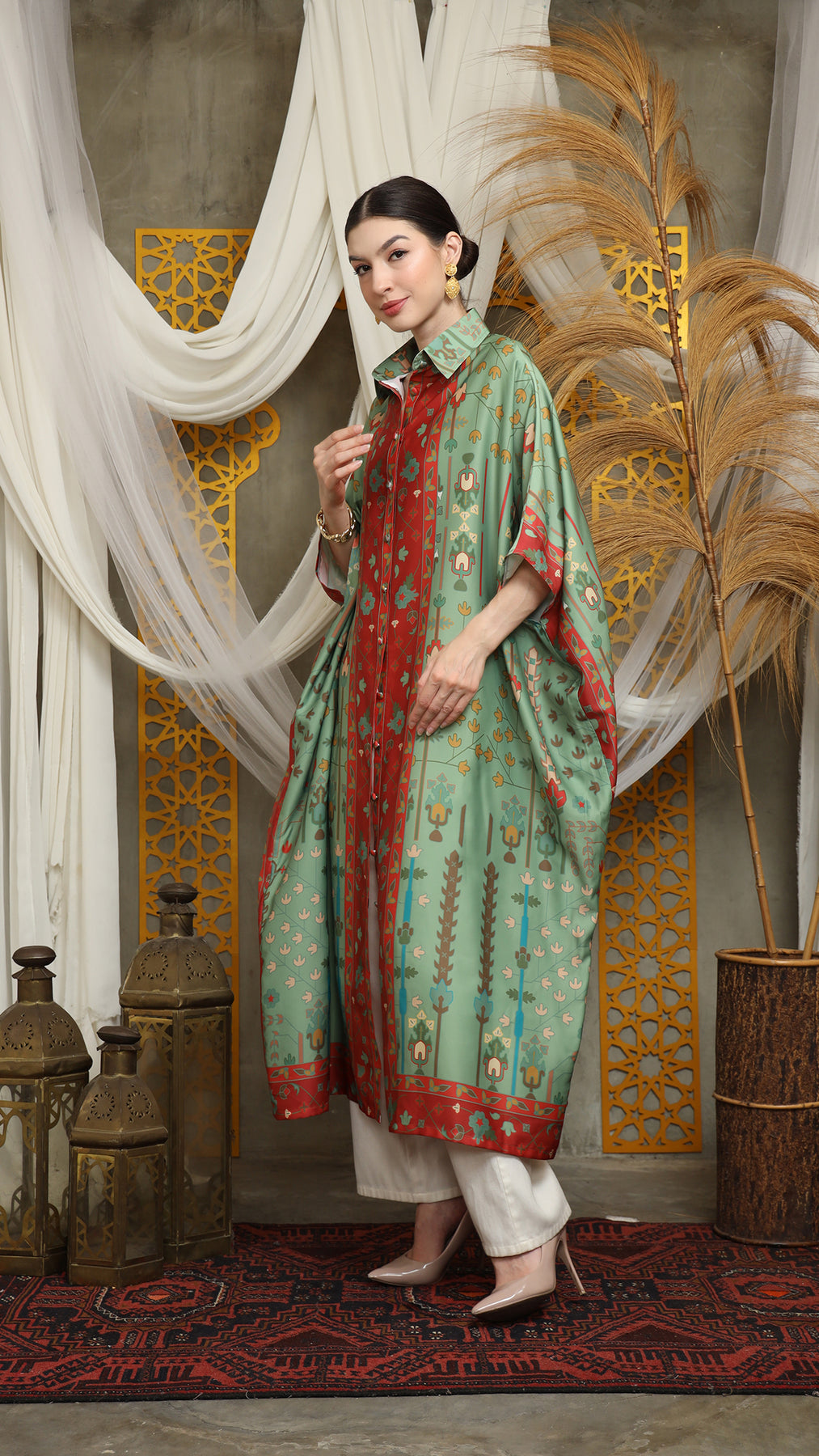 The Button Kaftan is a versatile, timeless piece that effortlessly blends style and comfort. Crafted from lightweight satin, it offers a luxurious feel and graceful drape, making it perfect for a variety of occasions. Designed with a convenient button-front fastening, it allows for easy wear and adjustable styling. The elegant motif adds a refined, sophisticated touch, elevating any look. Whether styled casually or worn as a chic outer layer, this kaftan adapts beautifully to different personal styles. Paired with pants, it creates a polished, contemporary outfit with endless styling possibilities.