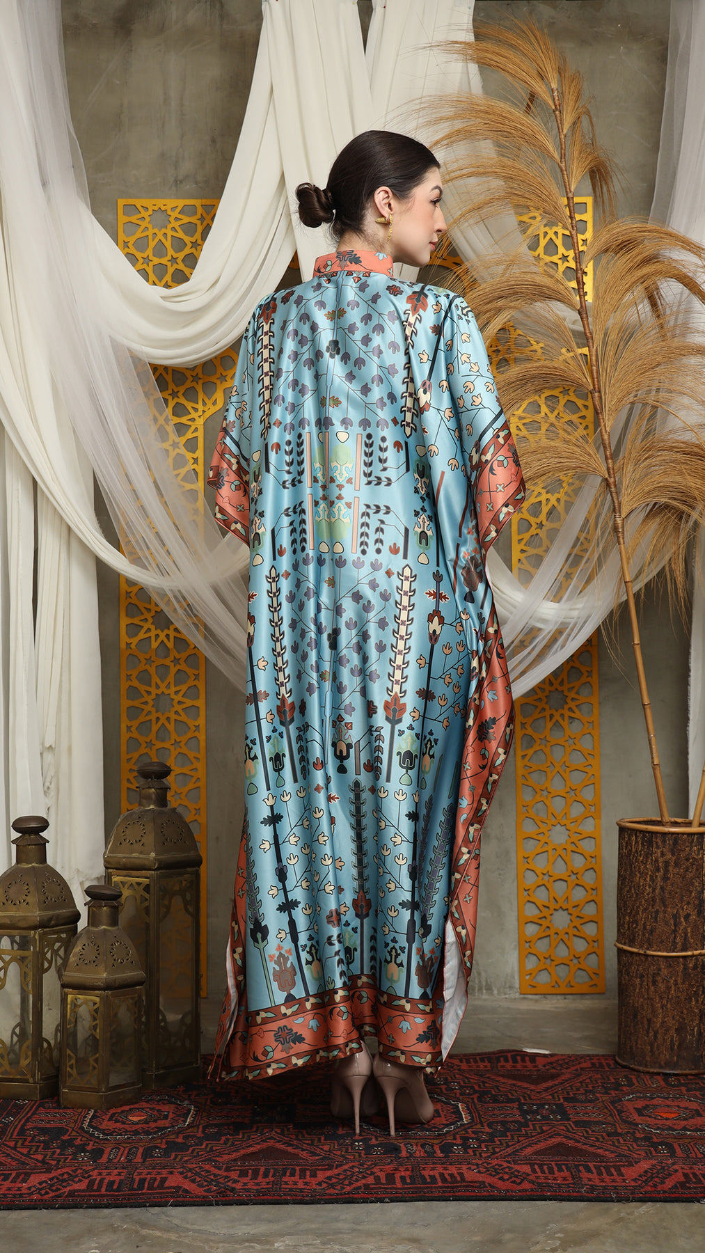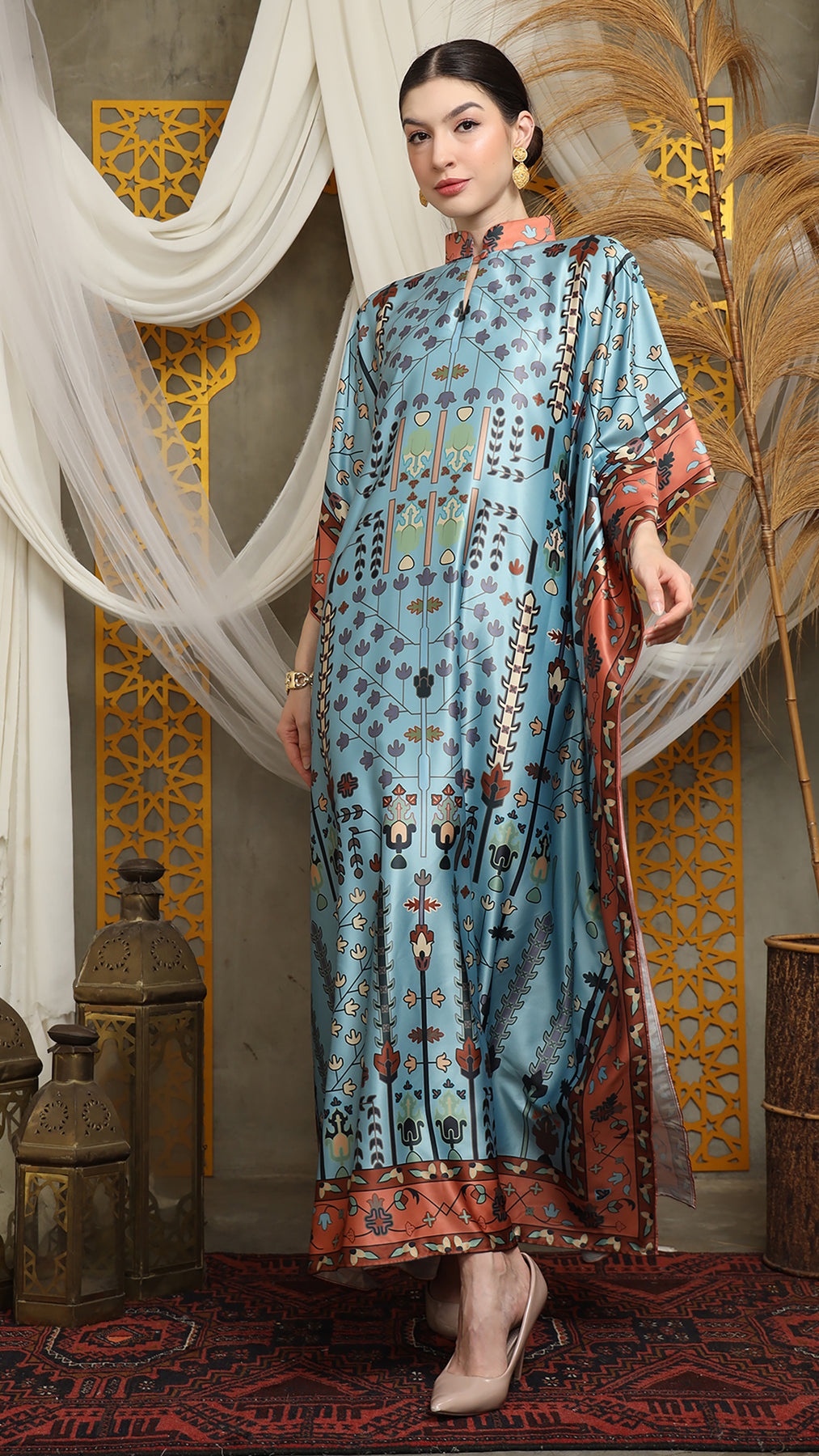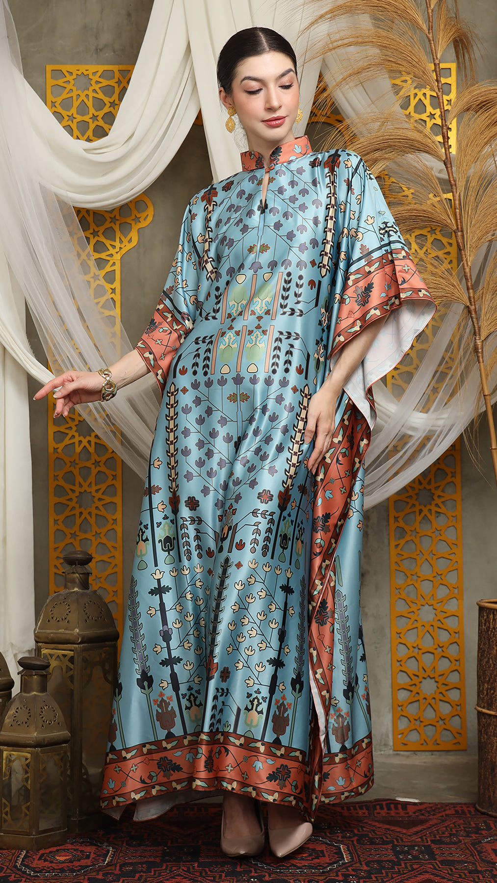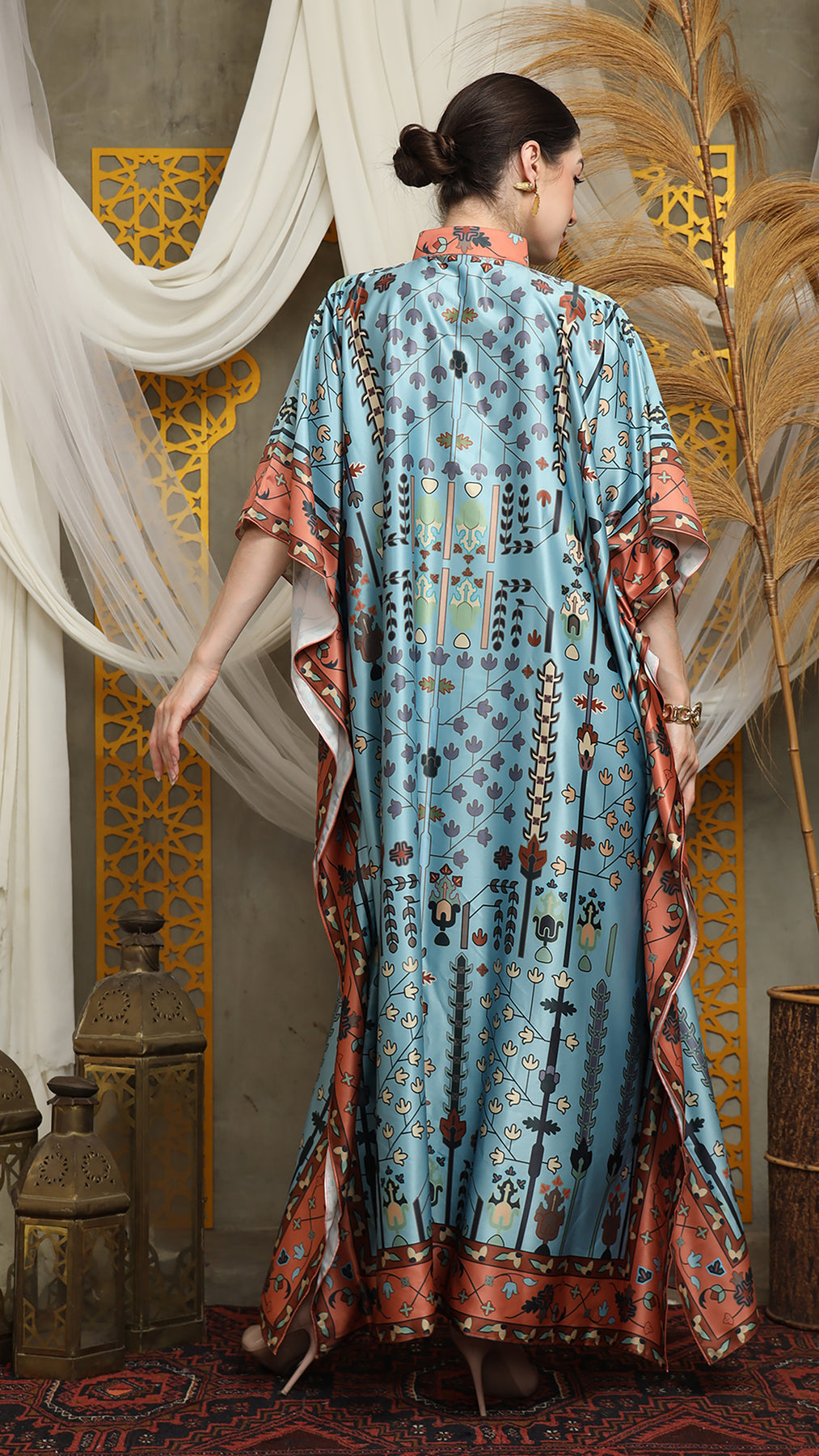 This kaftan made from lightweight satin material, which has super comfortable to lounge around in, adjustable drawstring and High Collar neckline with front buttons is an added feature which offers a glamorous way to cover up and perfect for evening wear.
