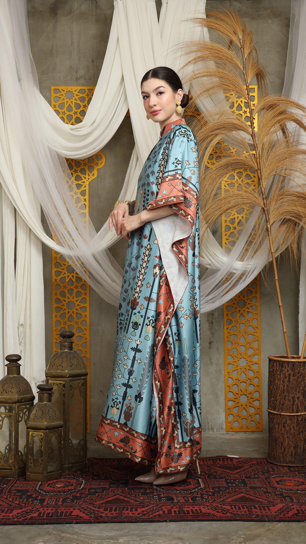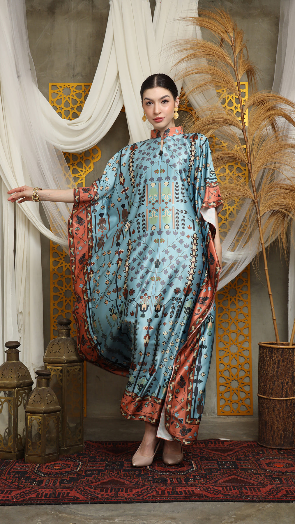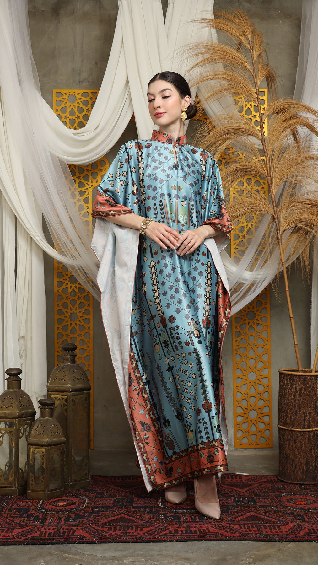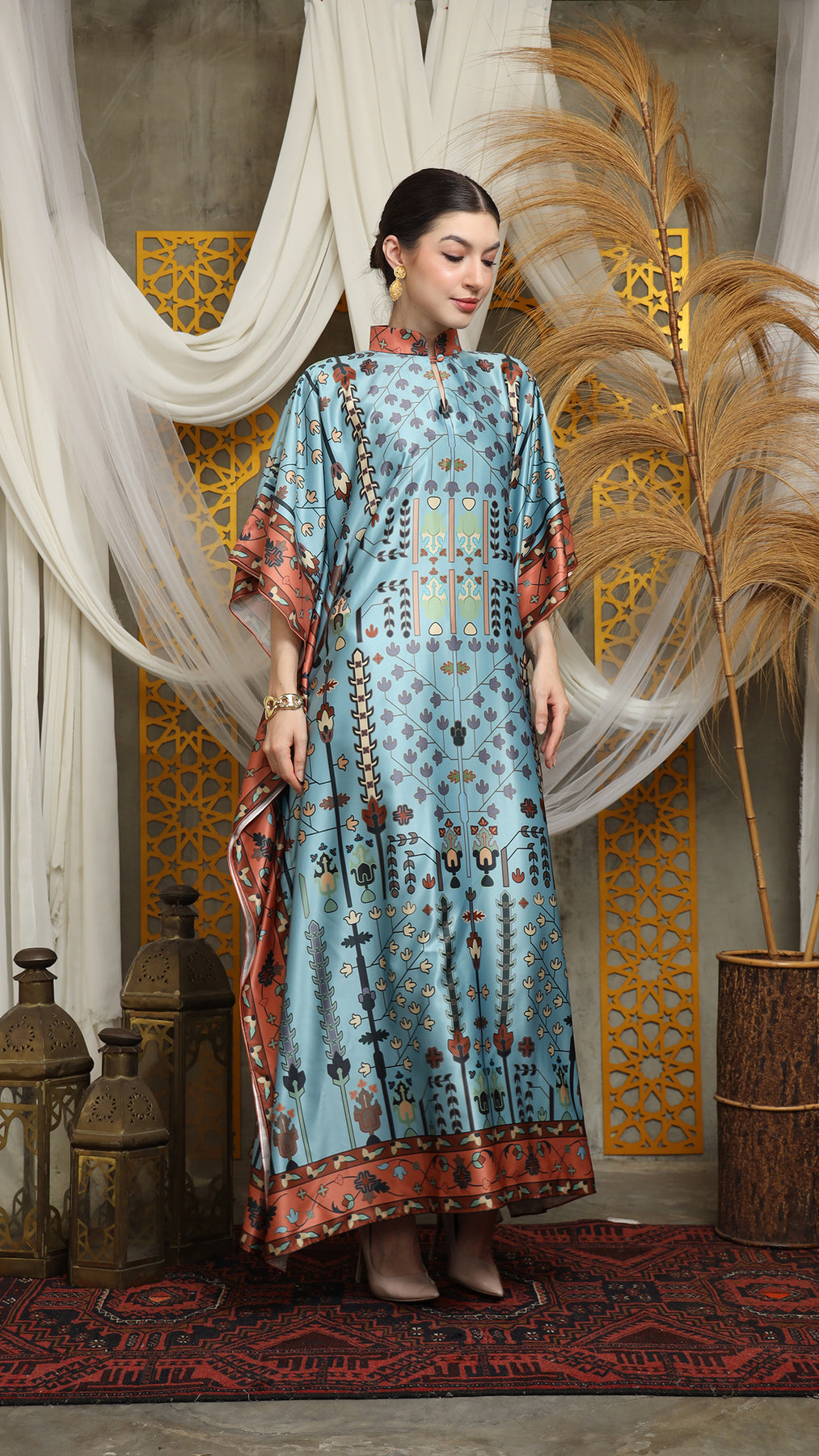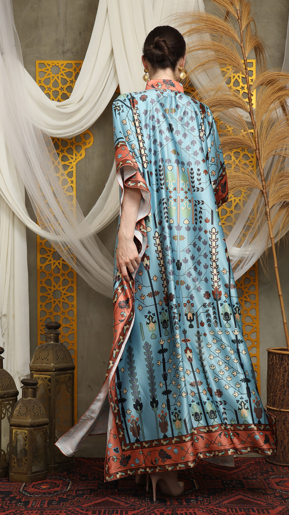 This kaftan made from lightweight satin material, which has super comfortable to lounge around in, adjustable drawstring and High Collar neckline with front buttons is an added feature which offers a glamorous way to cover up and perfect for evening wear.