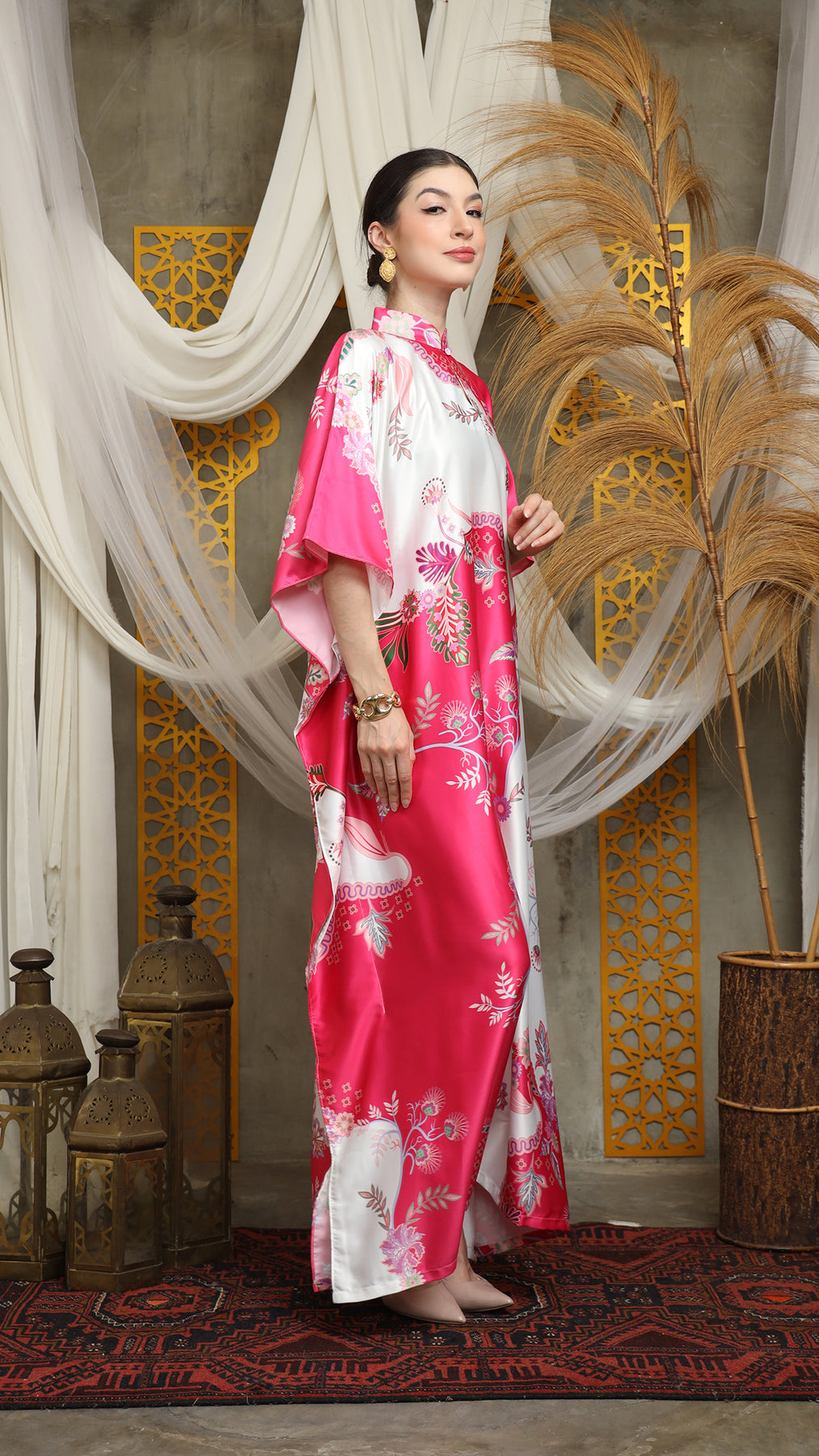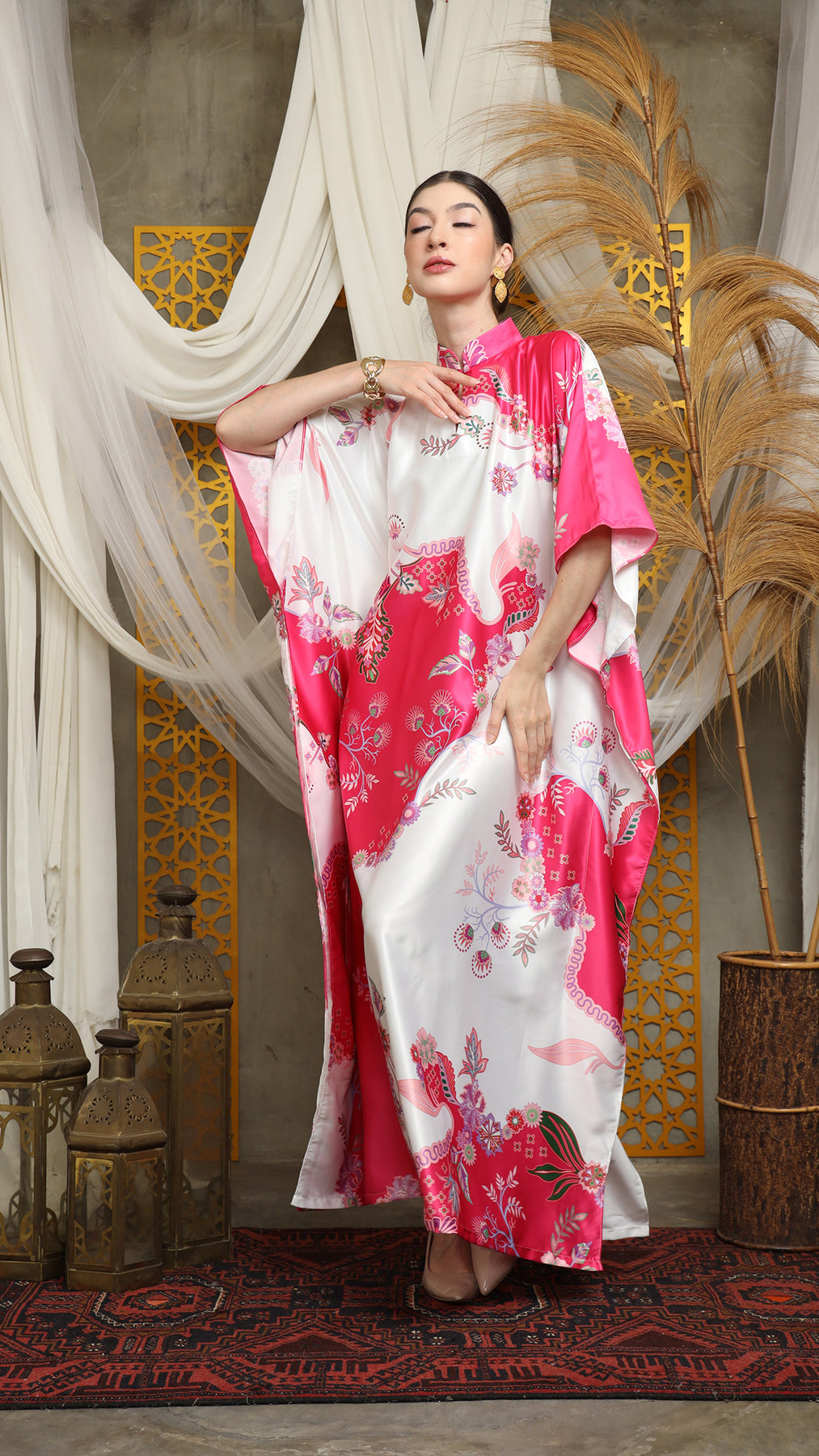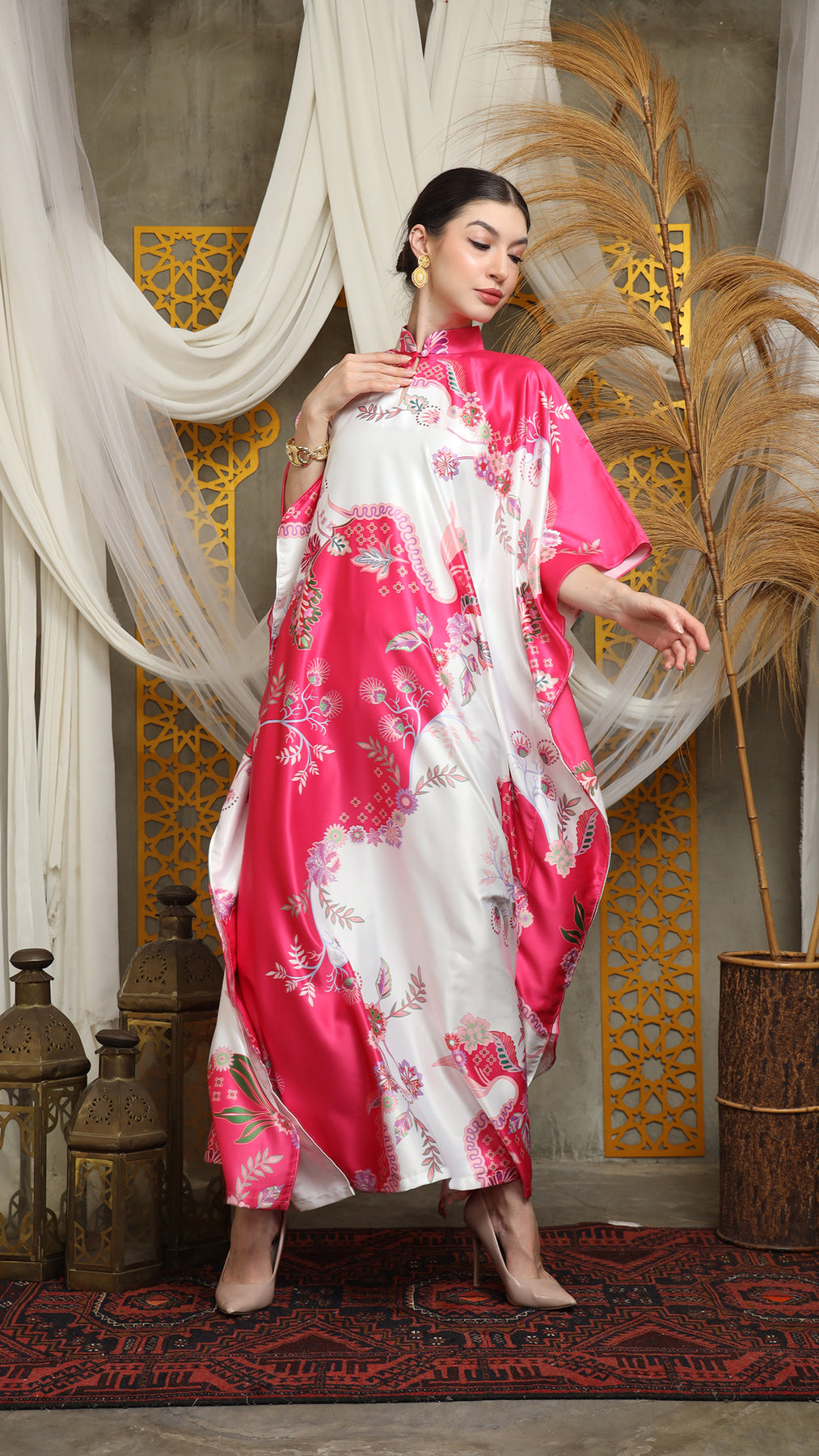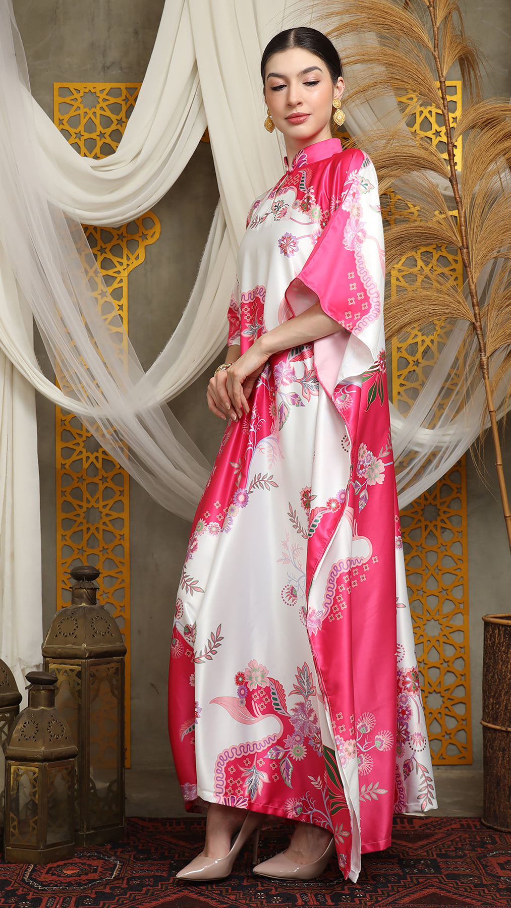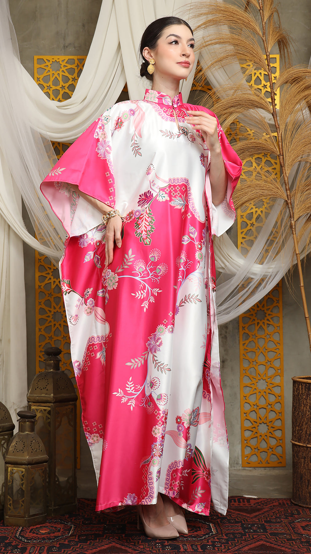 This kaftan made from lightweight satin material, which has super comfortable to lounge around in, adjustable drawstring and High Collar neckline with front buttons is an added feature which offers a glamorous way to cover up and perfect for evening wear.