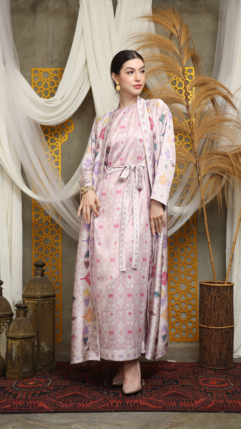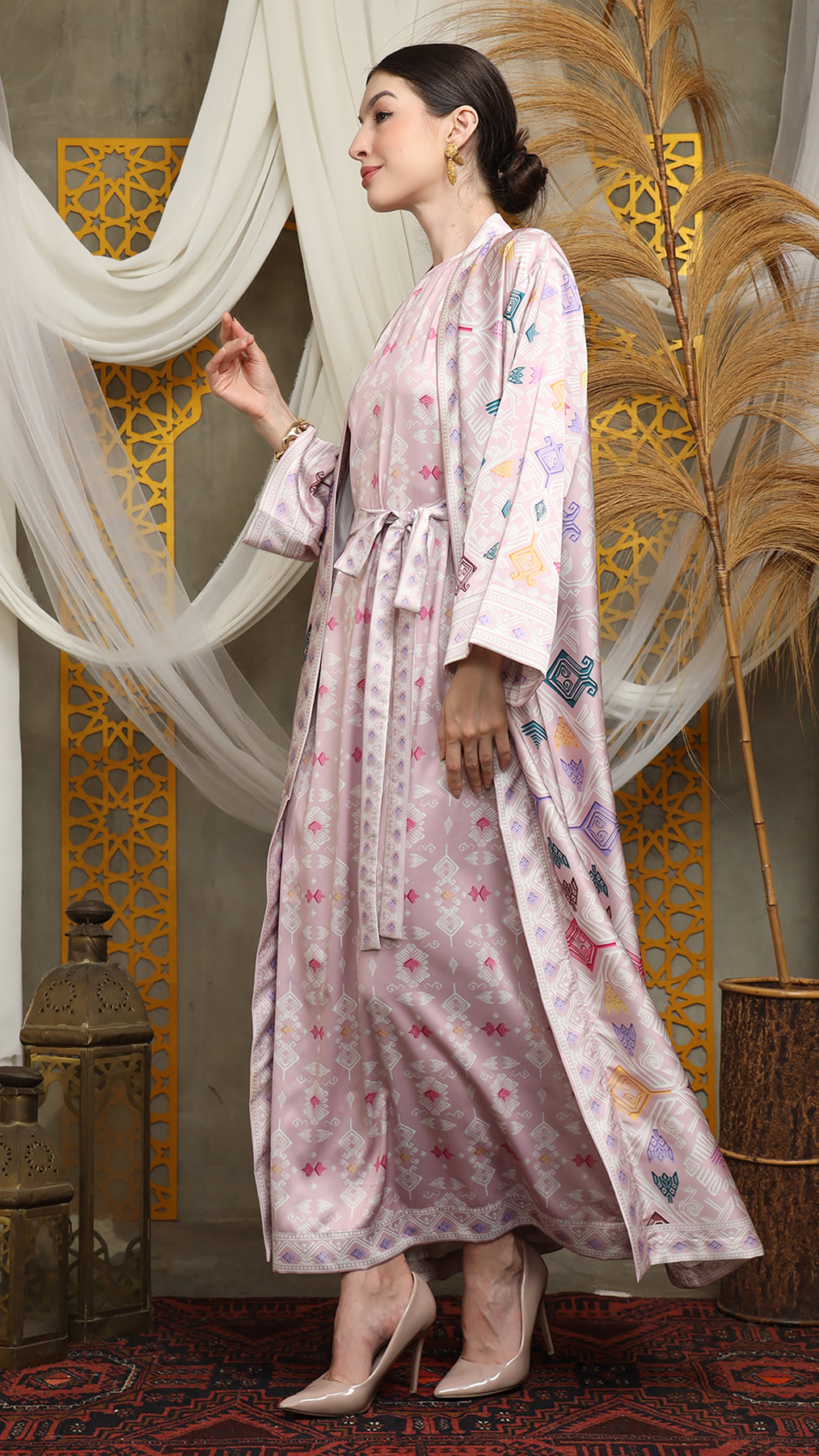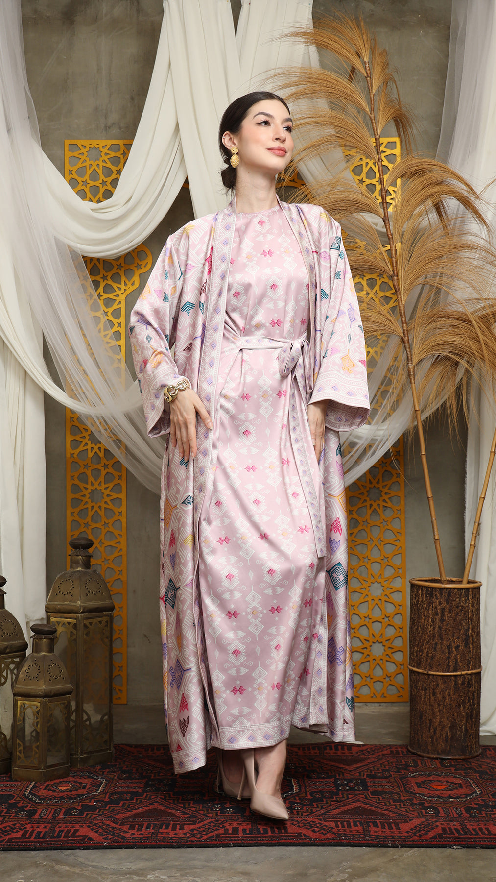 Outerwear is crafted from premium satin. It comes as a 2-piece set: an outer layer and an inner layer. The inner piece features a beautiful patterned design with a back button for added charm. Elegant and versatile, it’s perfect for any occasion, offering a timeless blend of sophistication and comfort.