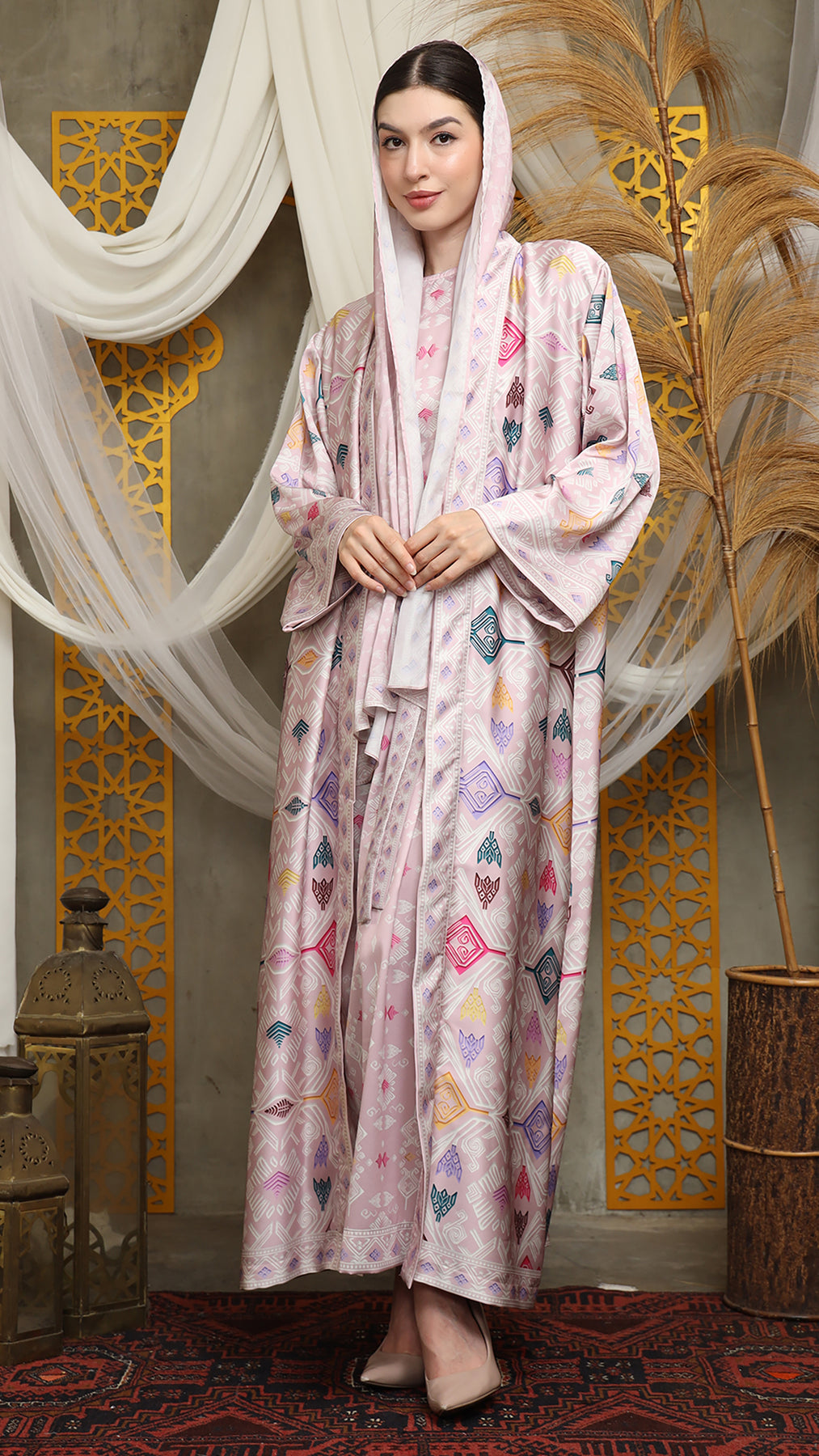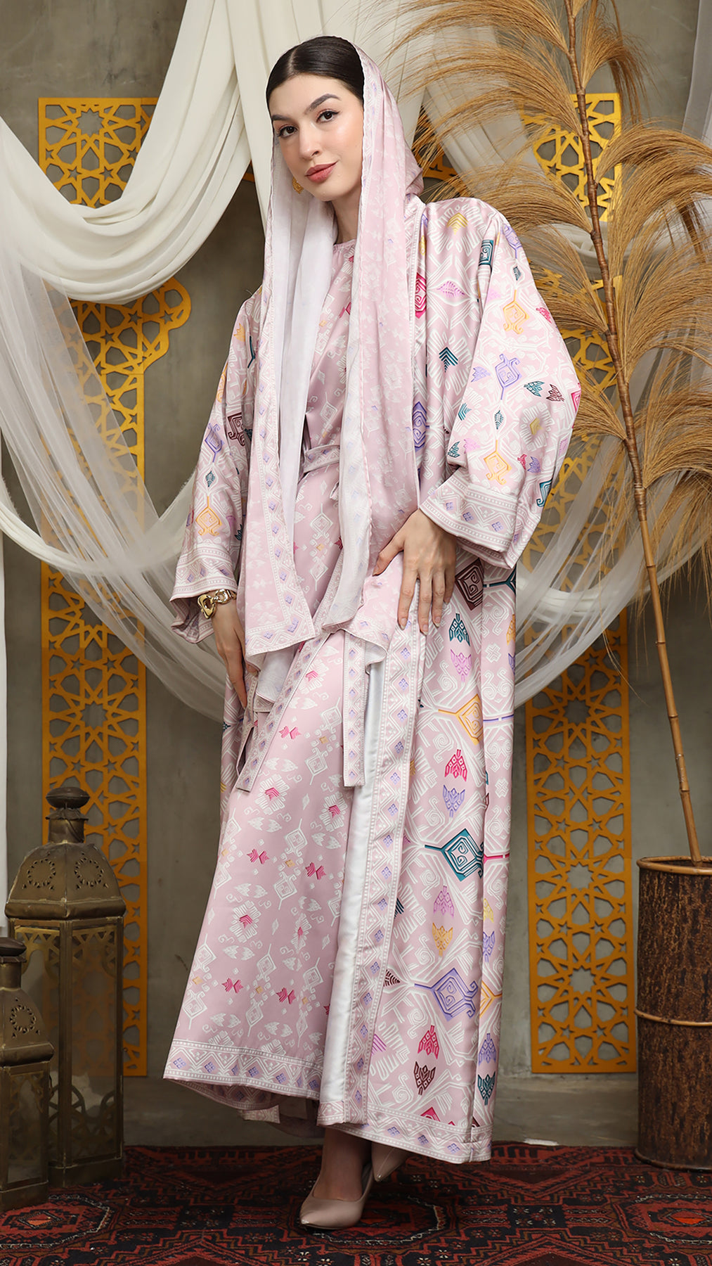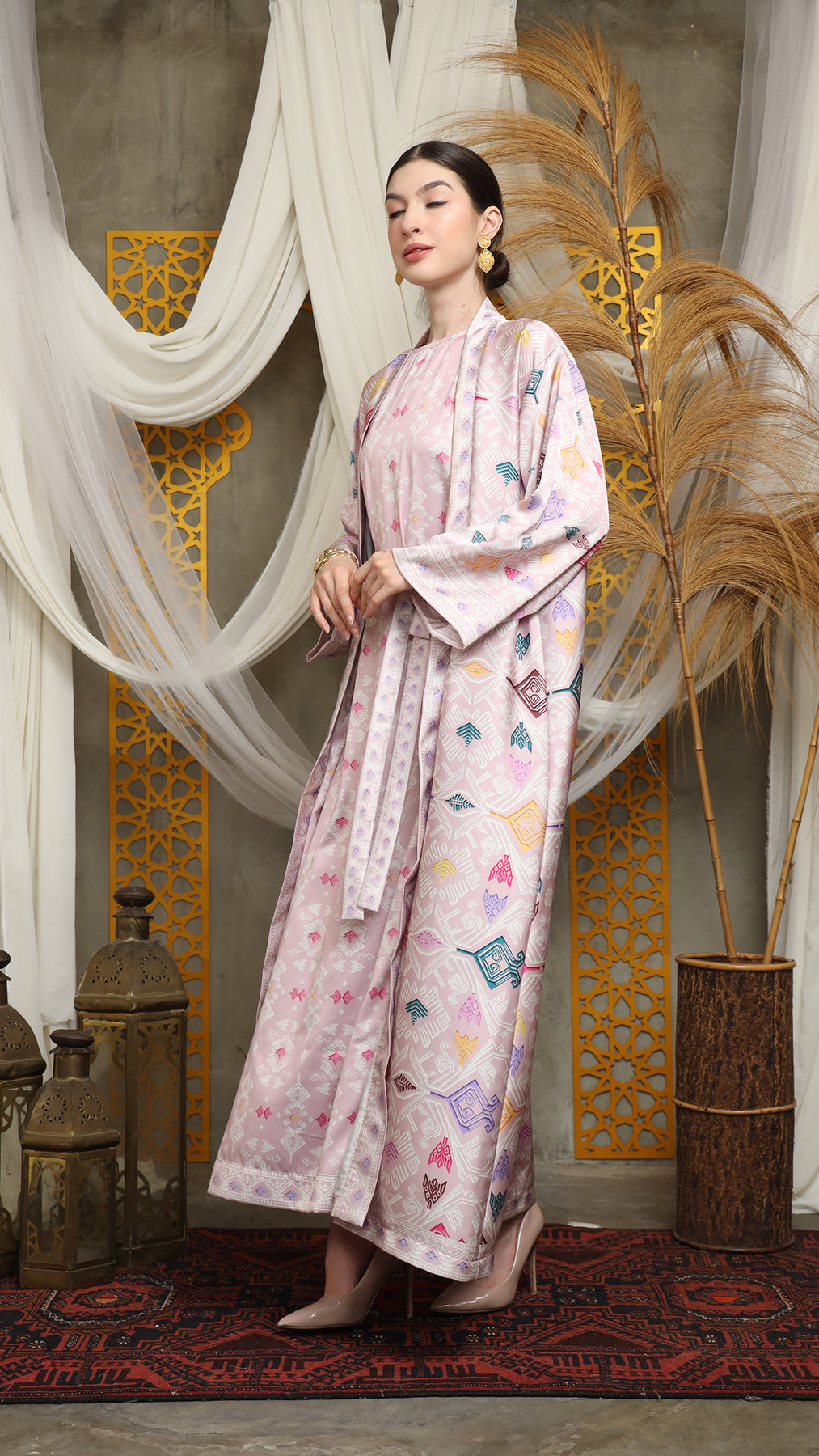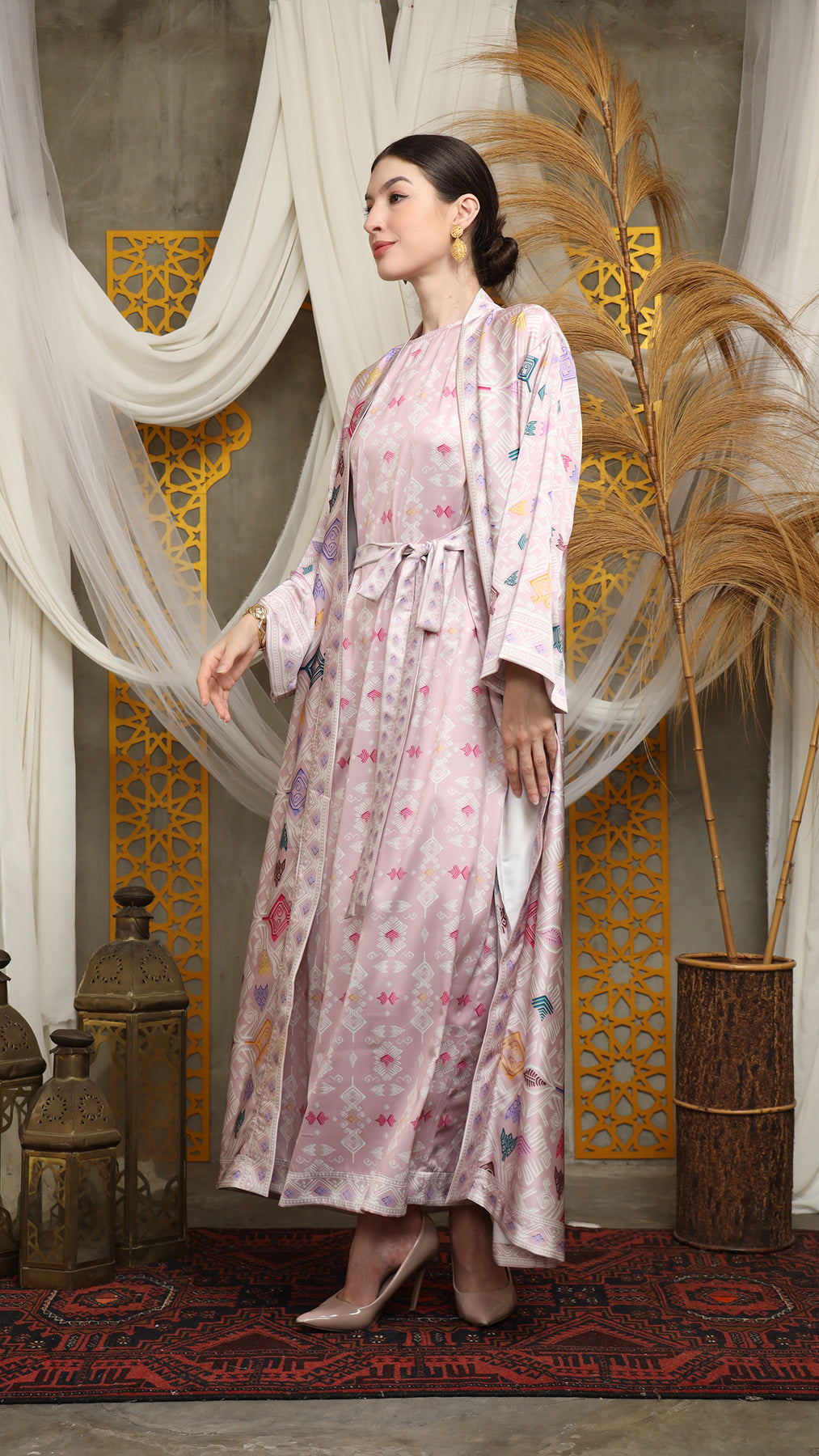 Outerwear is crafted from premium satin. It comes as a 2-piece set: an outer layer and an inner layer. The inner piece features a beautiful patterned design with a back button for added charm. Elegant and versatile, it’s perfect for any occasion, offering a timeless blend of sophistication and comfort.