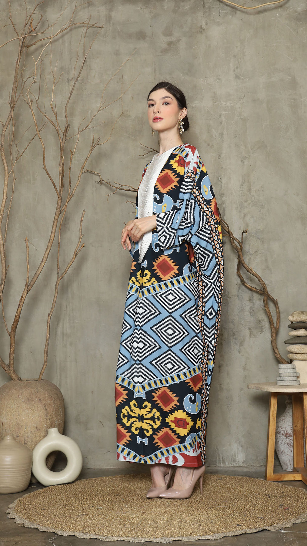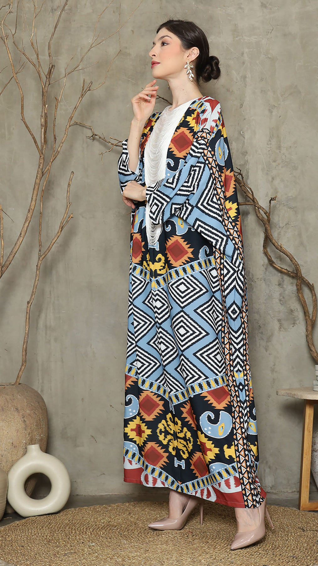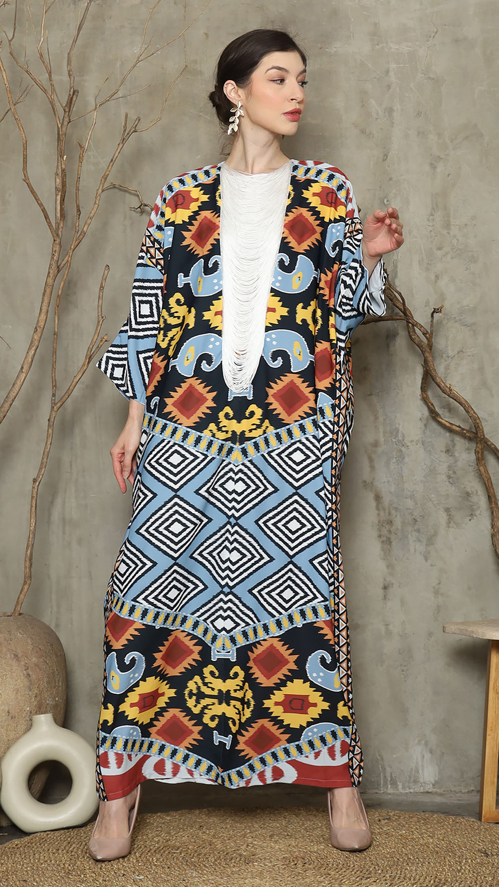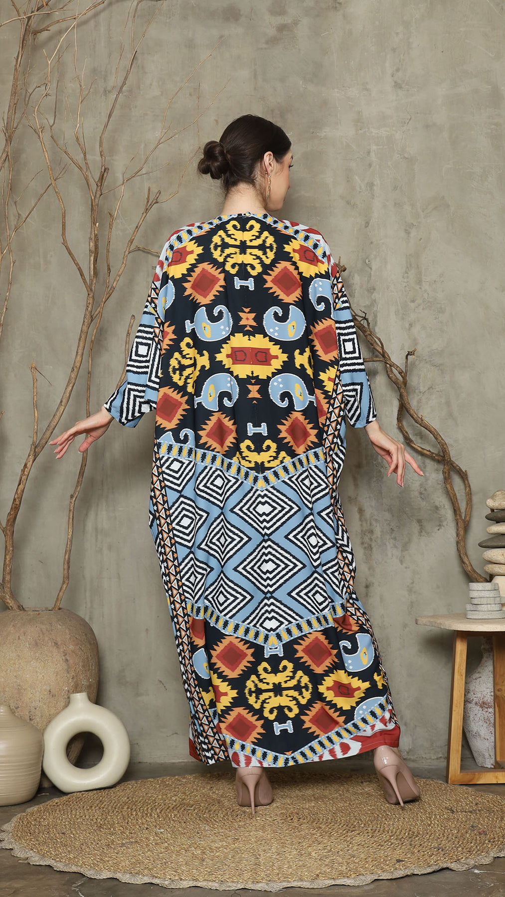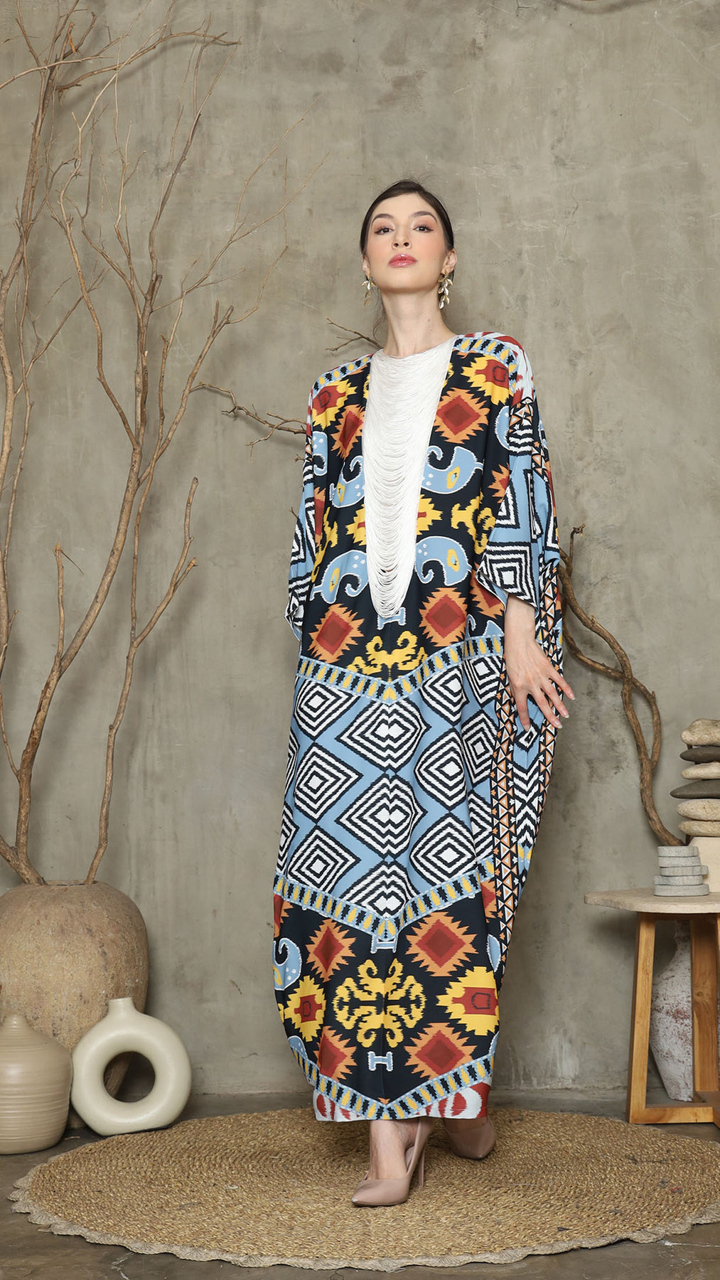 This kaftan is made from premium satin material, which has super comfortable to lounge around in, adjustable drawstring which offers a glamorous way to cover up and perfect for evening wear. A short fringe kaftan that brings effortless drama and easy elegance. Cut in a relaxed, breezy silhouette, it drapes beautifully over the body while allowing freedom of movement. The playful fringe detailing adds texture and motion, swaying with every step for a touch of bohemian glamour