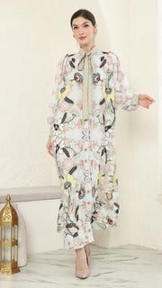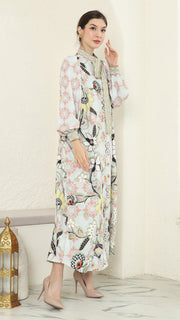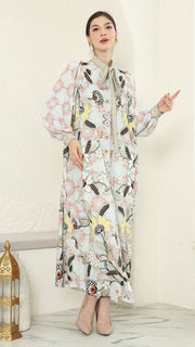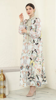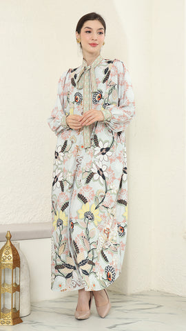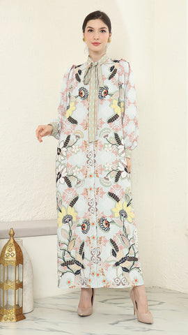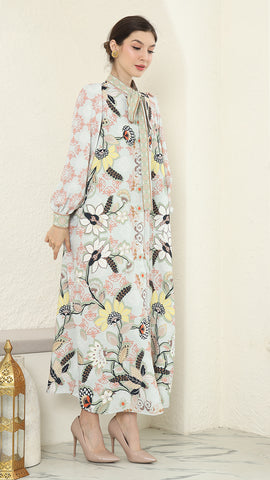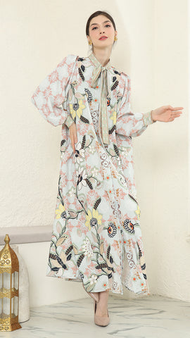 Introducing our Monogram Series: A graceful blend of floral motifs, soft tones, and intricate detailing. This statement piece features a delicate bow at the neckline, ornamental buttons at the sleeves, and a flowing silhouette adorned with vibrant flowers. A timeless and chic addition to elevate your style effortlessly.