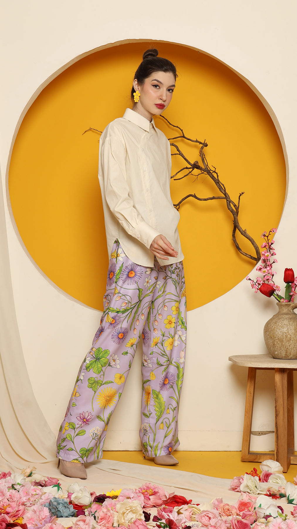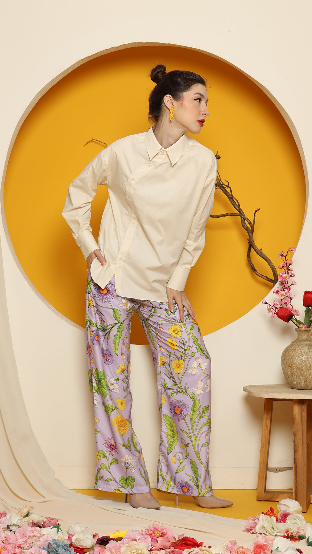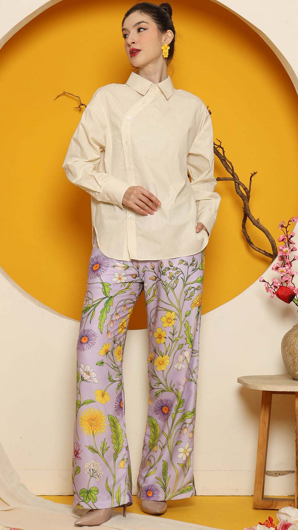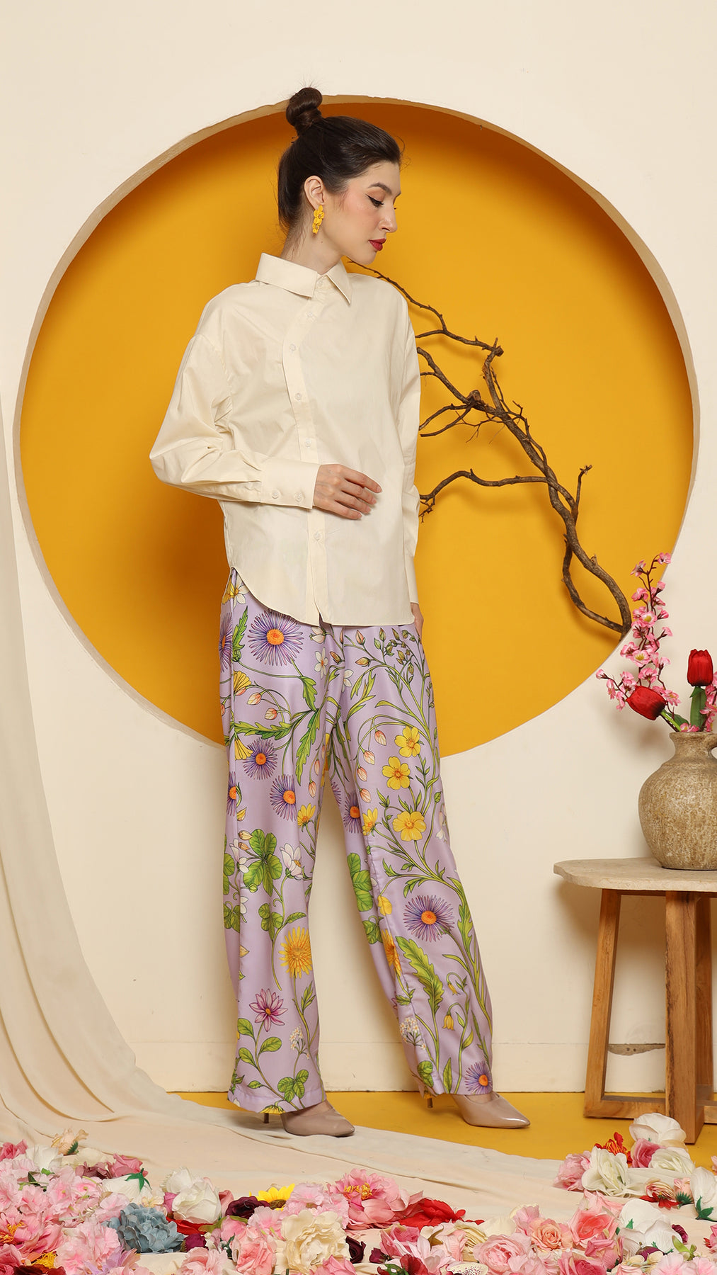 CHEONGSAM BUTTON SHIRT with PURPLE FLOWER PANTS SET