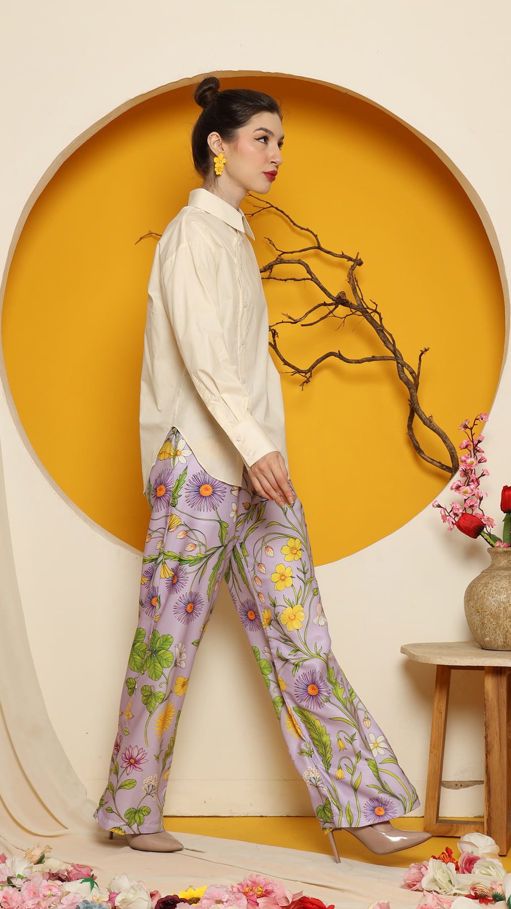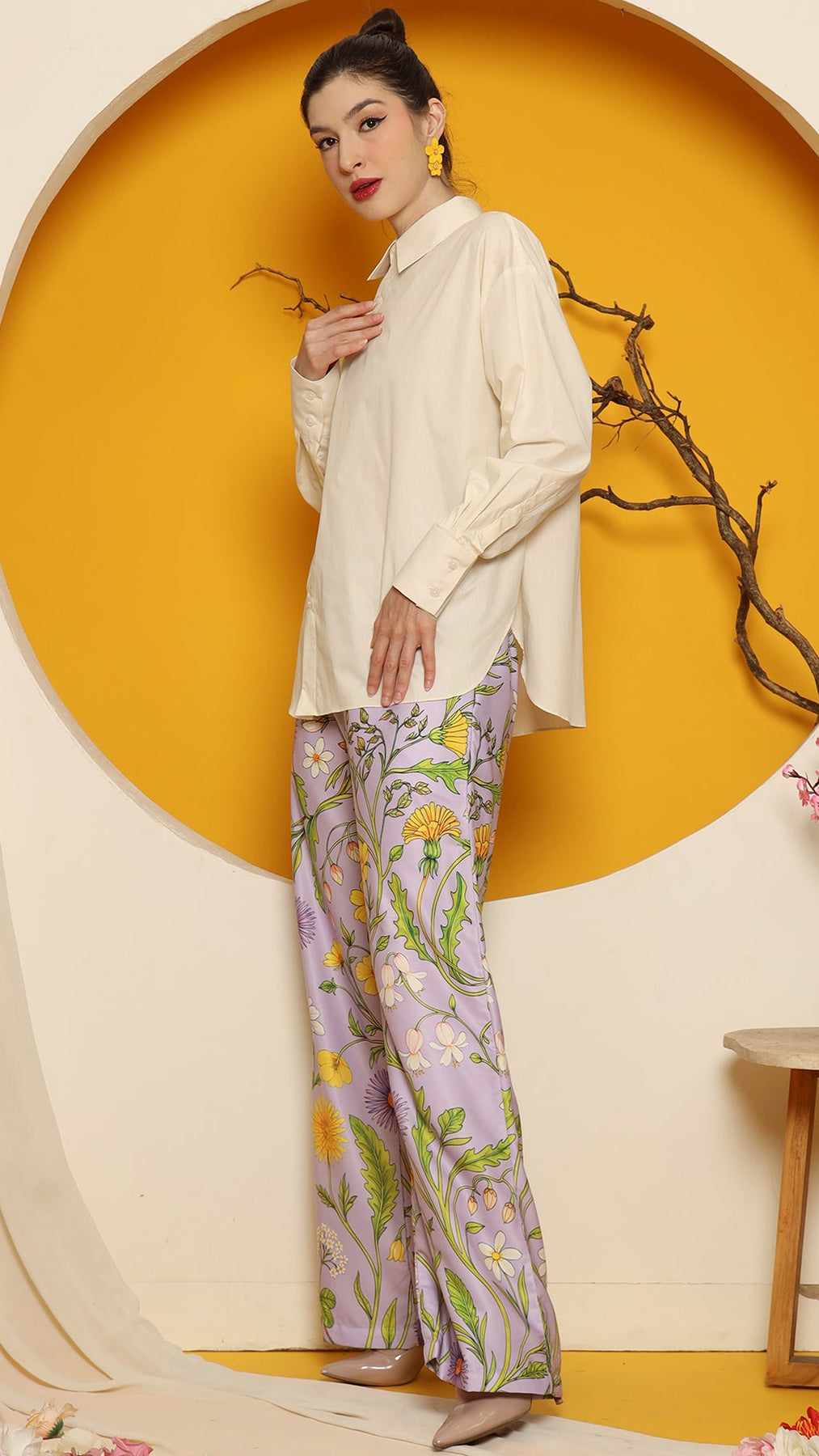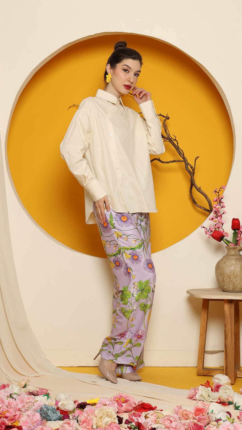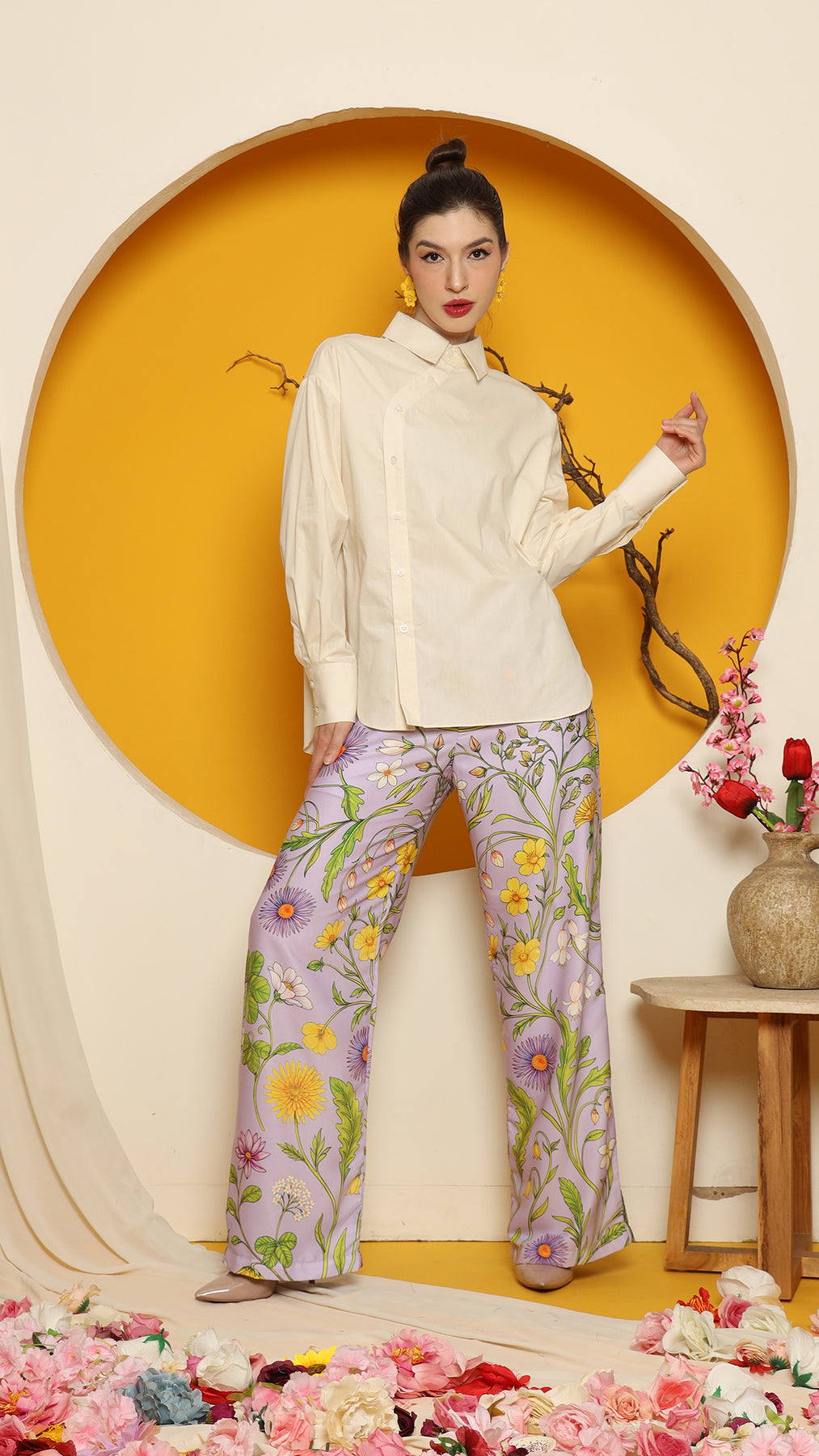 CHEONGSAM BUTTON SHIRT with PURPLE FLOWER PANTS SET