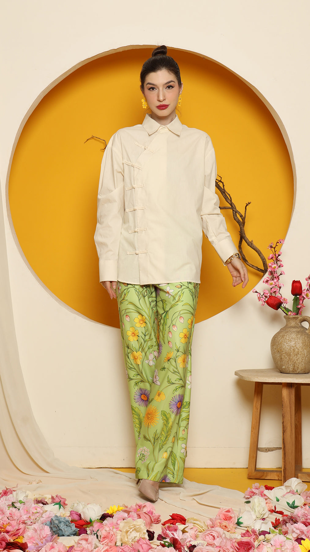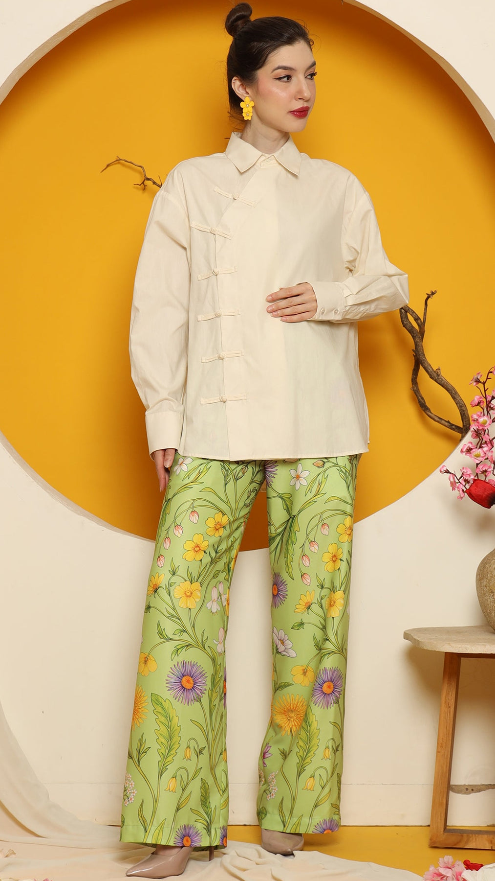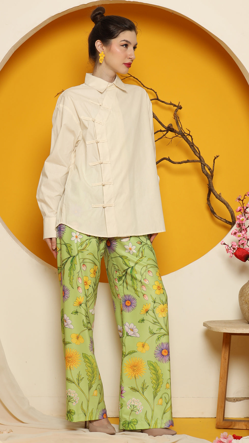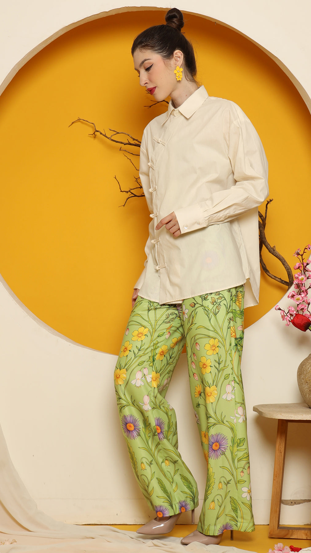 CHEONGSAM SHIRT with GREEN FLOWER PANTS SET