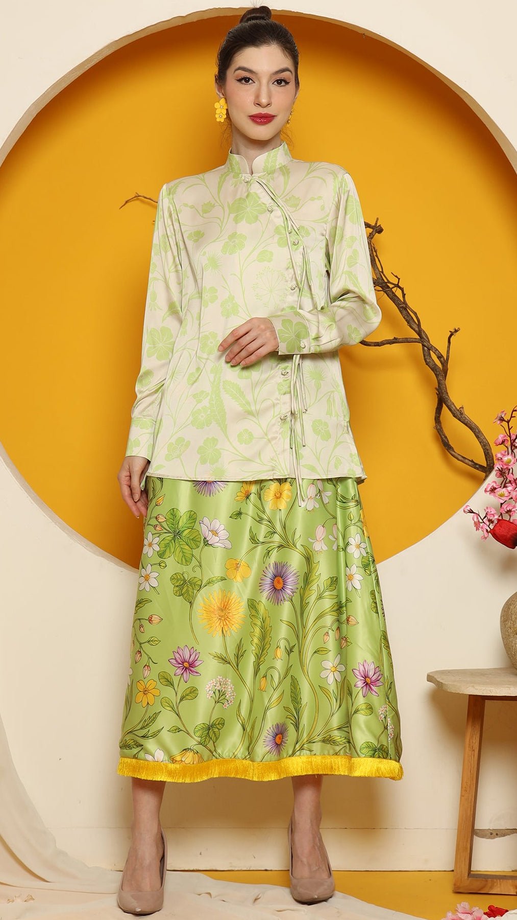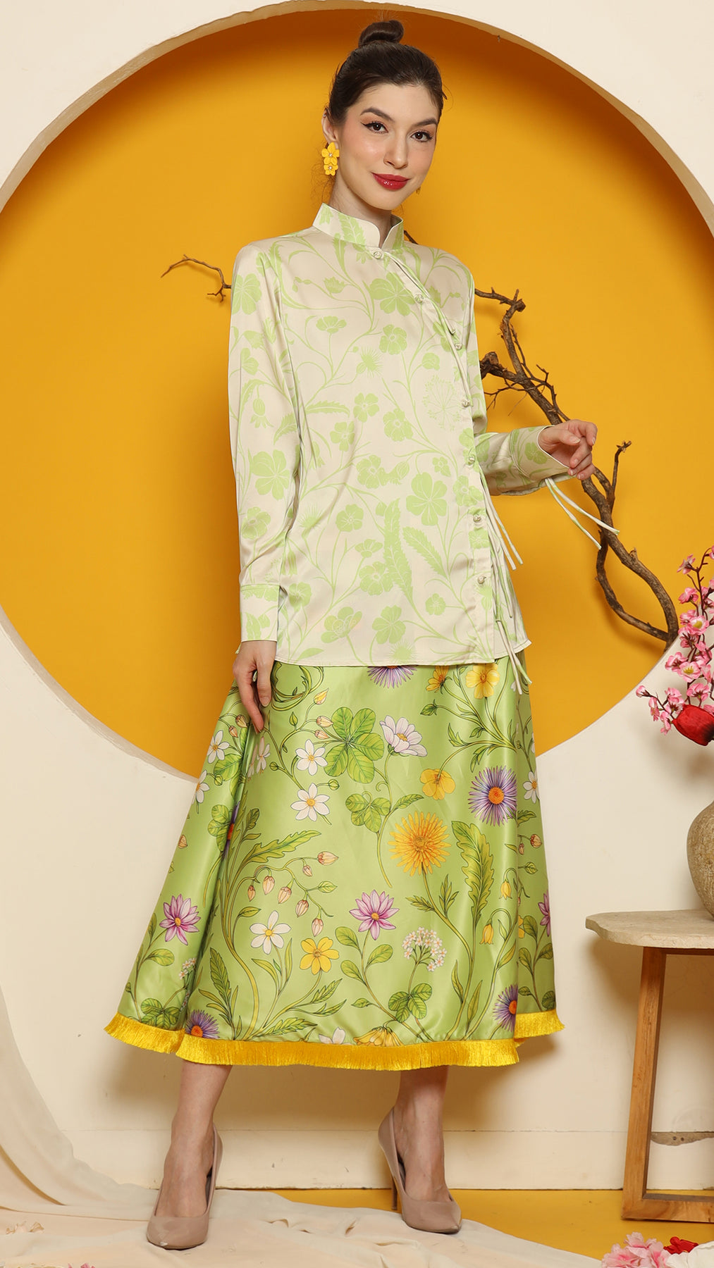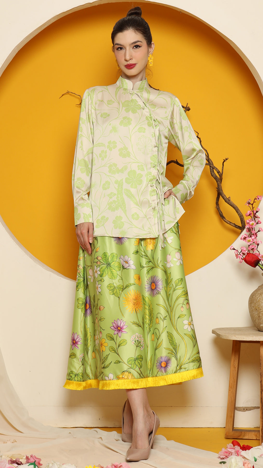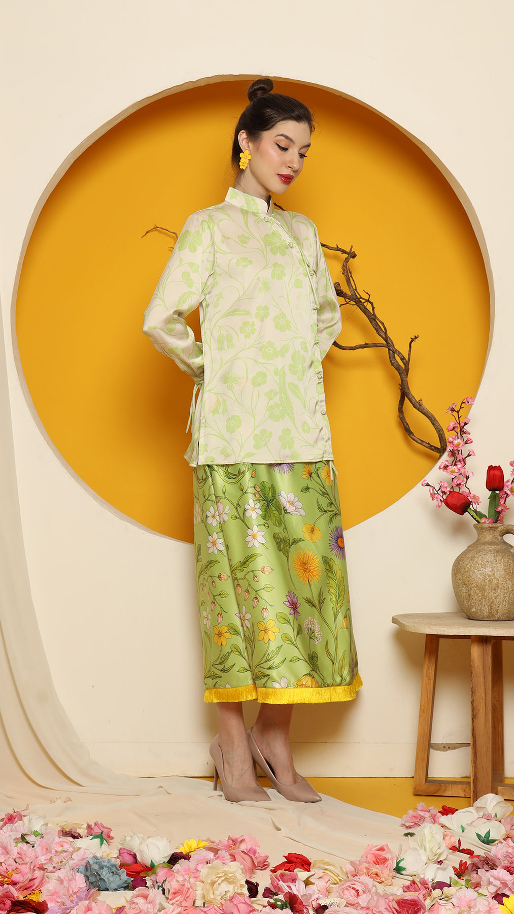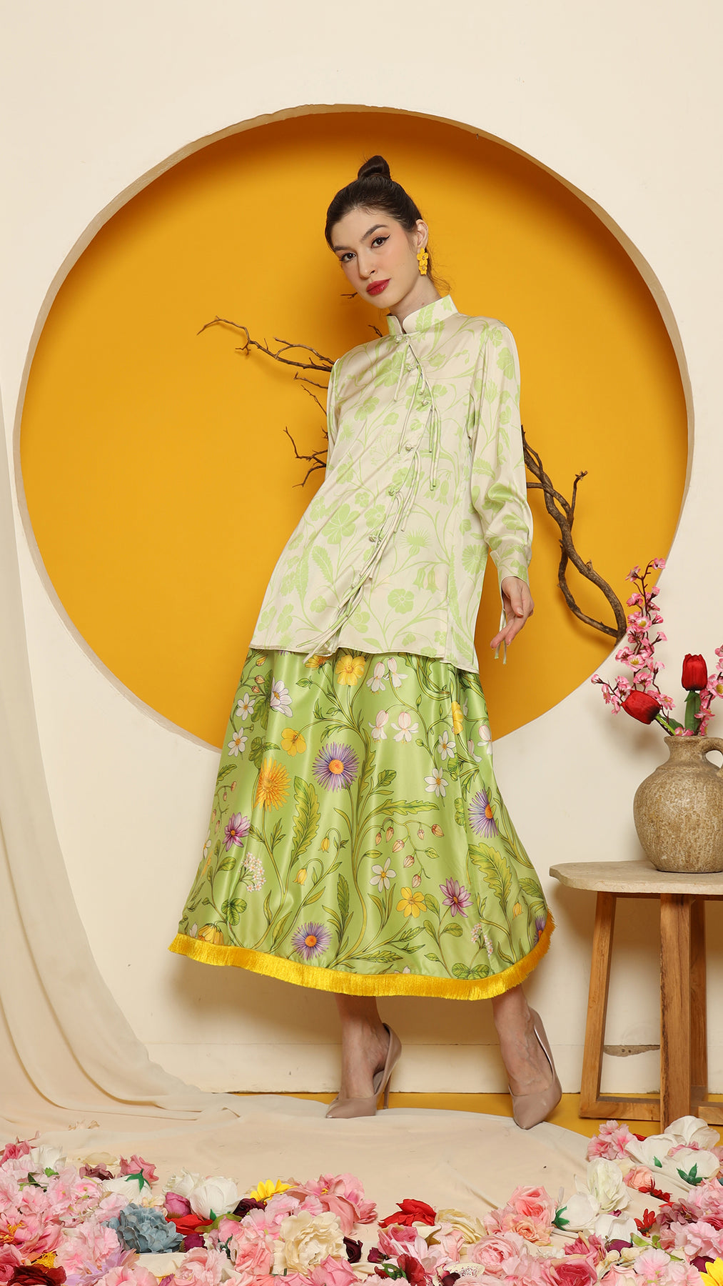 GREEN CHEONGSAM LONG TOP with FLOWER SKIRT SET