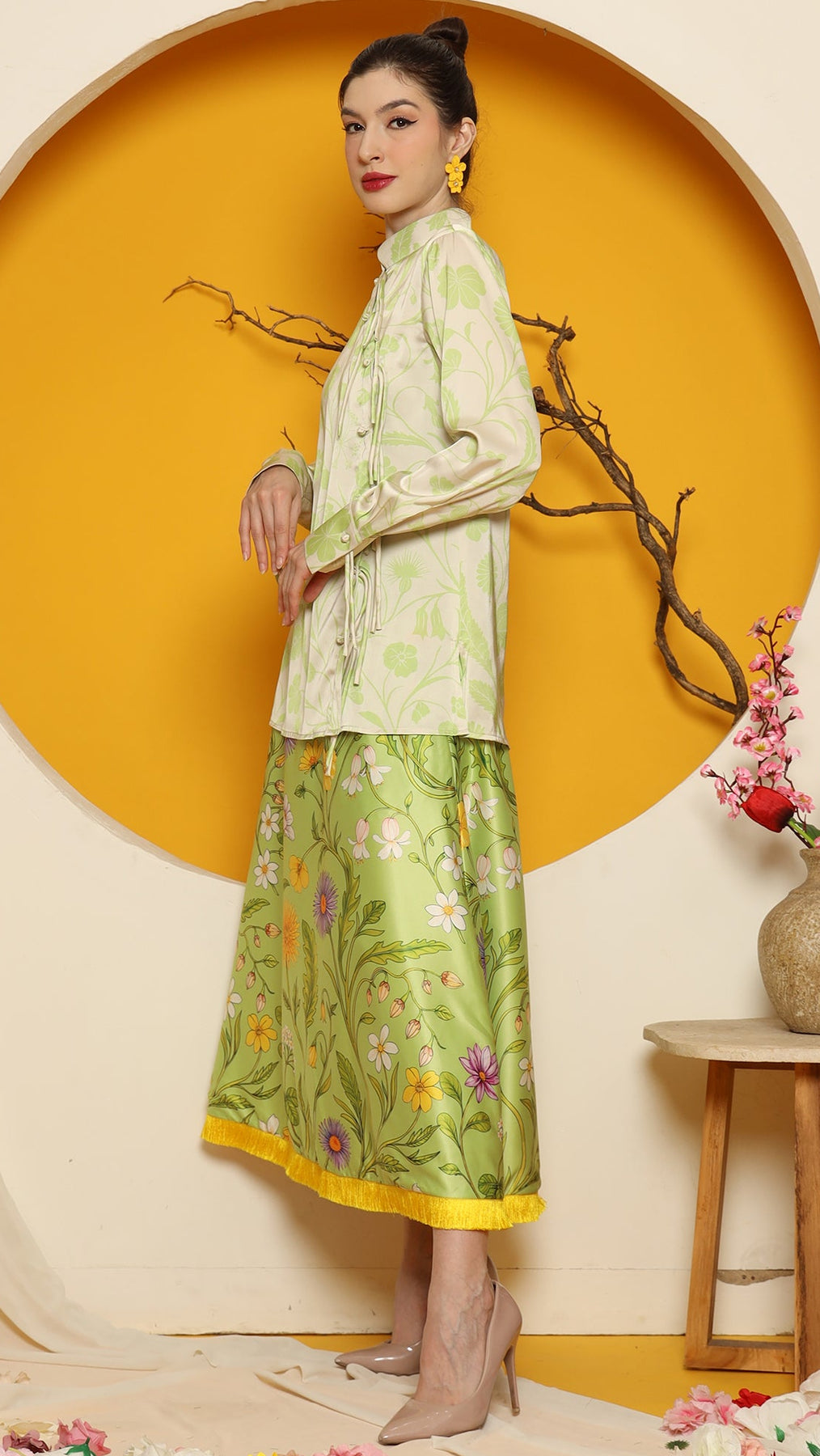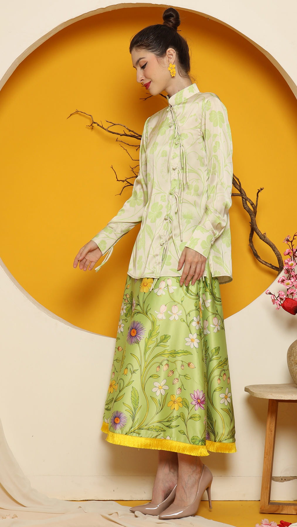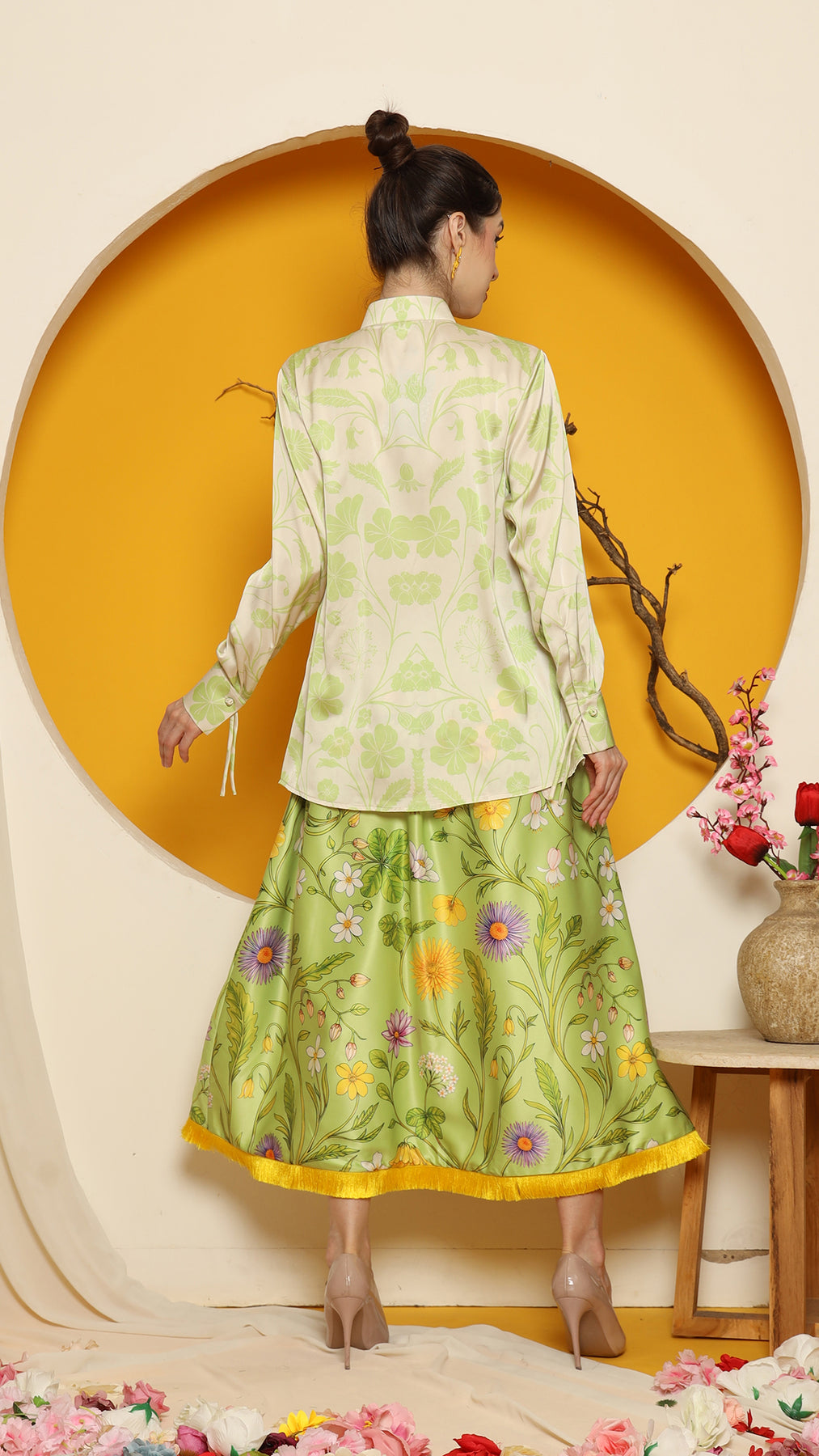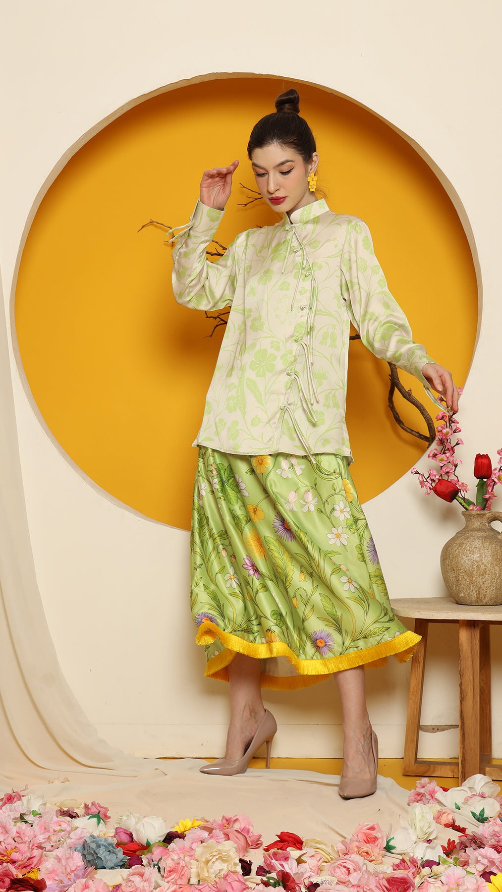 This refined ensemble includes cheongsam long top, showcasing an elegant flower motif. The shirt features a clean, minimalistic design perfect for a timeless look. Paired with it is a premium satin skirt adorned with floral patterns and finished with a red fringe hemline for a touch of sophistication.