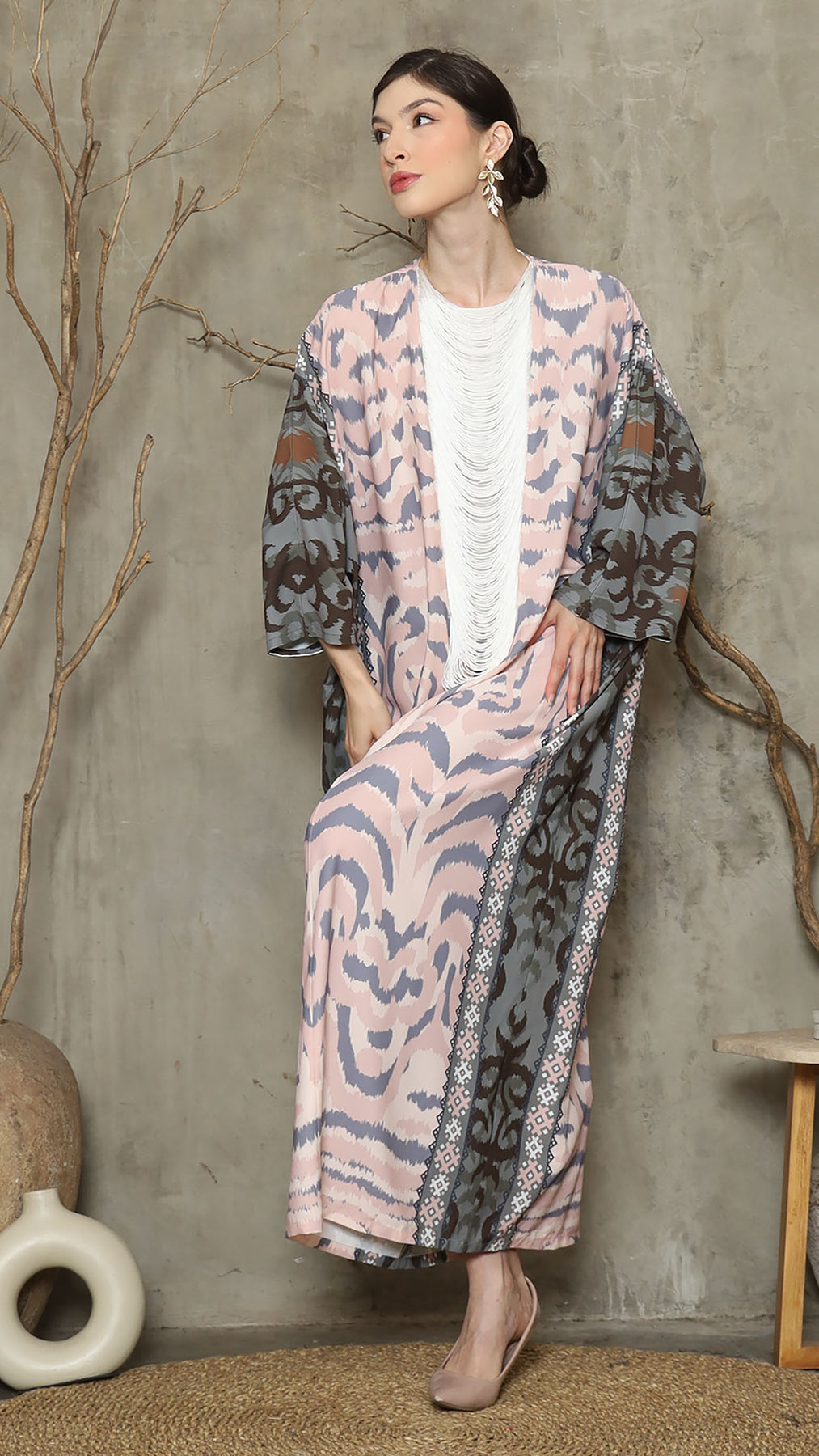 Green Ikat Necklace Fringe Long Kaftan