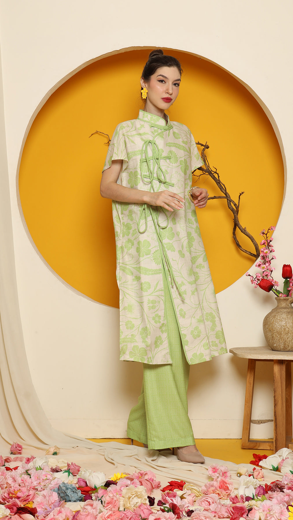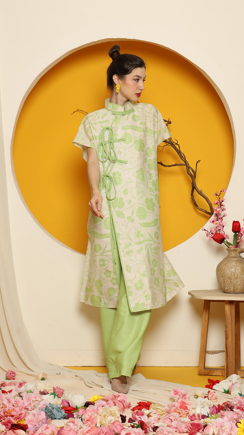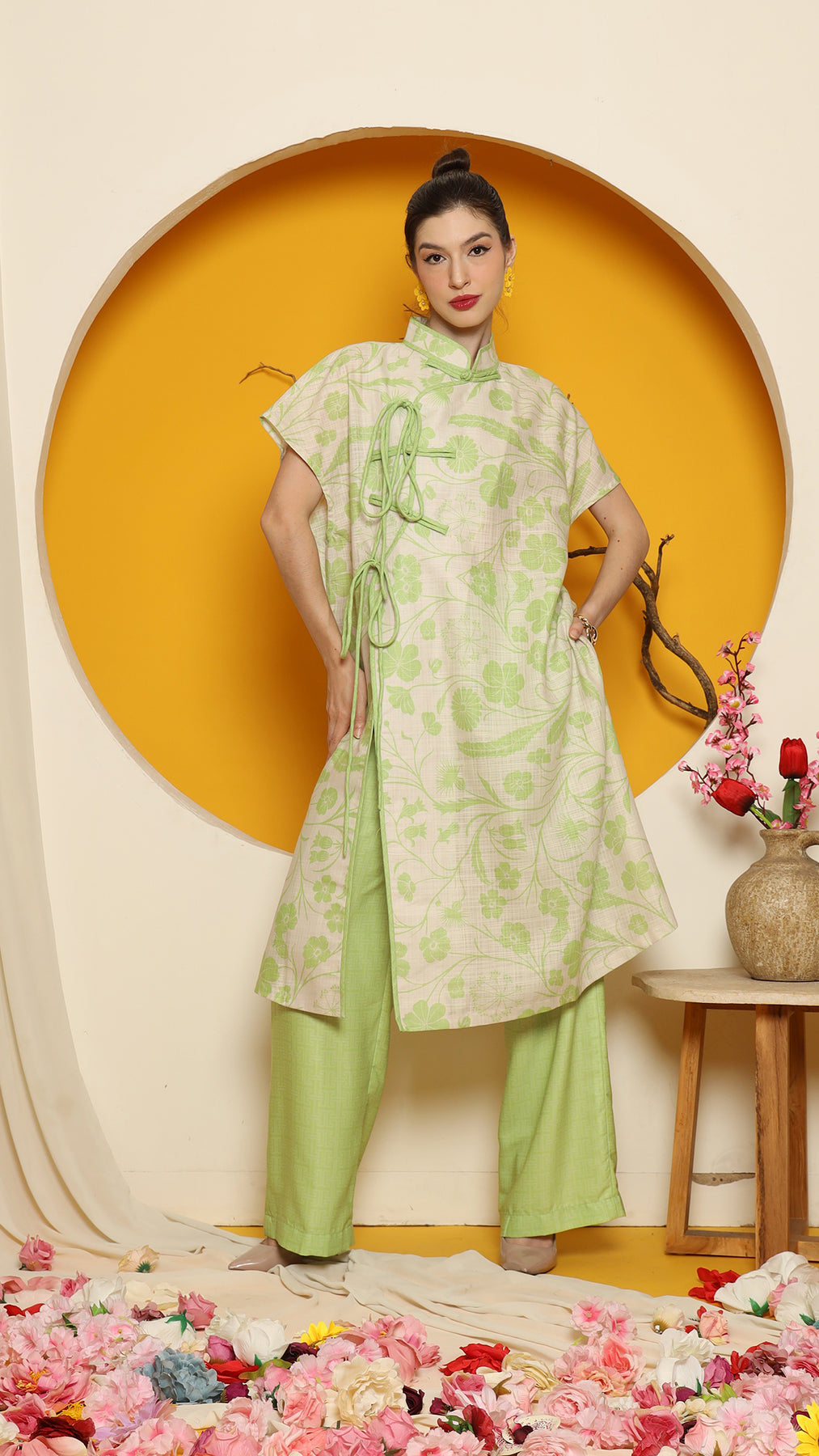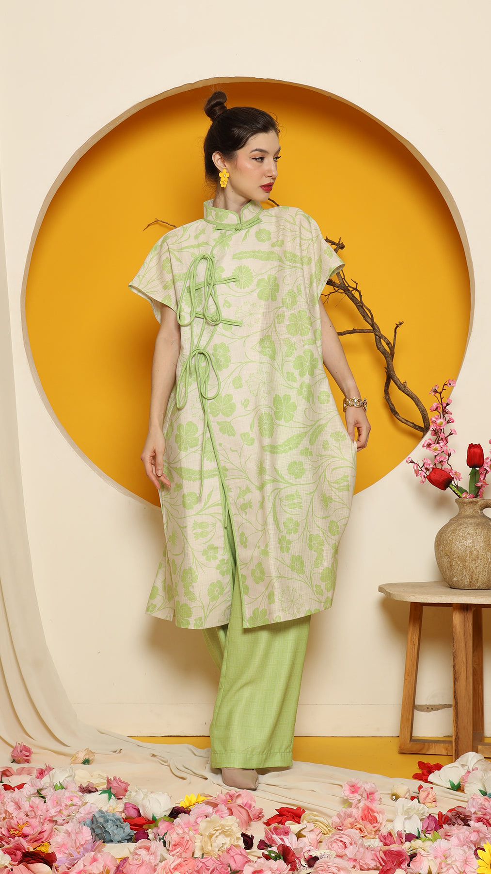 This ORIENTAL FLORAL CHEONGSAM free-size set features a breathable premium mixed material, ensuring comfort and elegance. Designed with an open-front style and accentuated with charming side strings, it offers a versatile fit for various occasions. The floral print adds a touch of sophistication, while the matching long pants complete the refined look. Perfect for those who value timeless style with modern functionality.