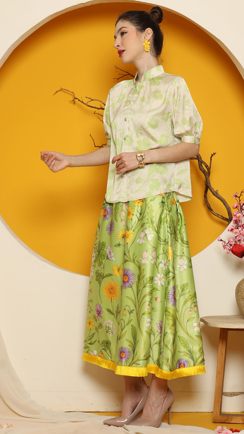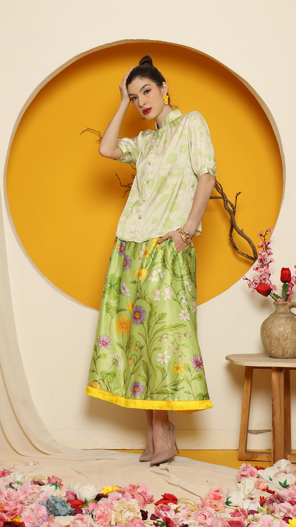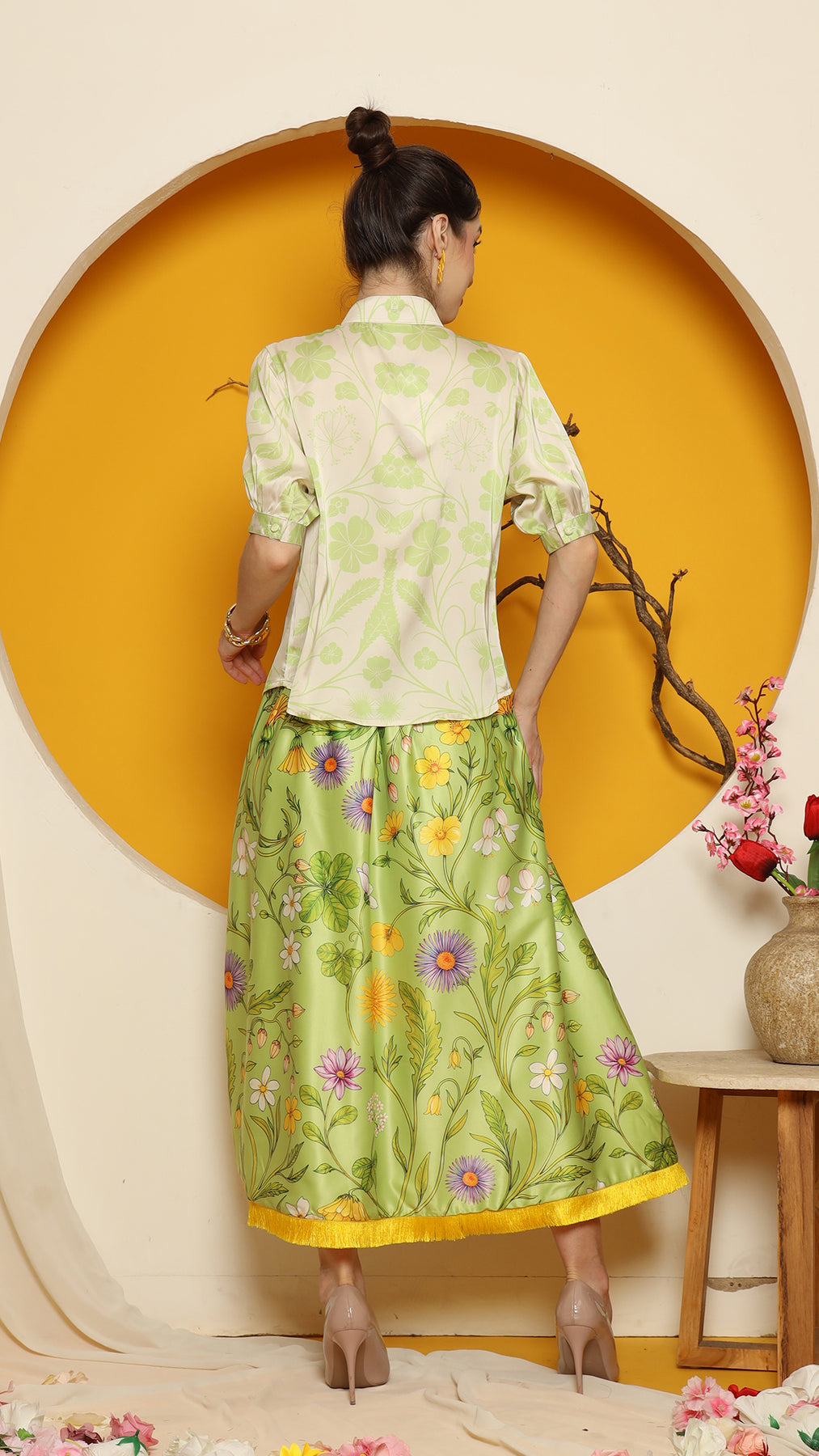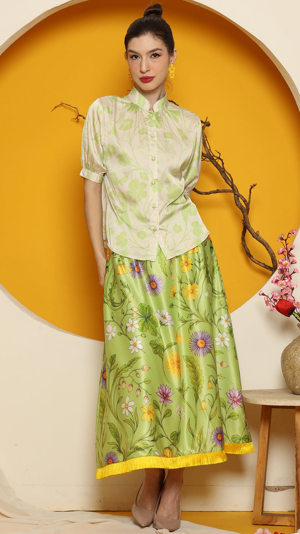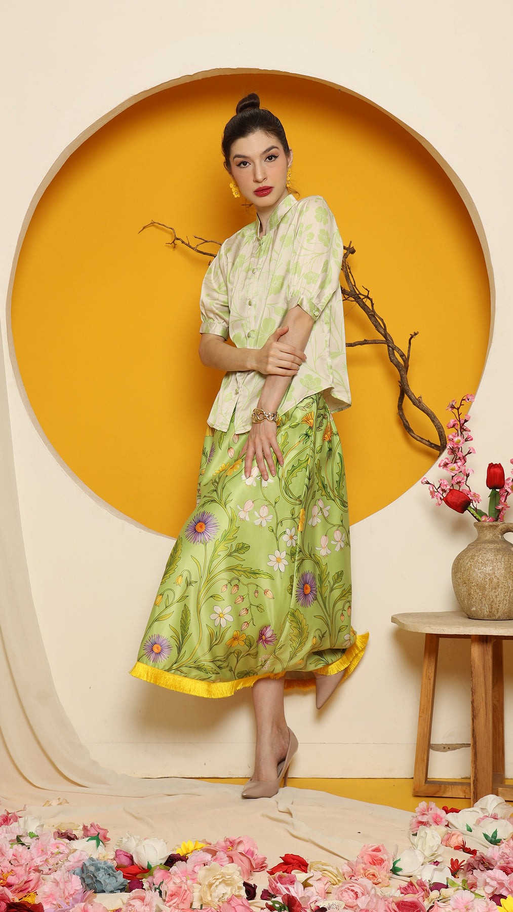 This refined ensemble includes high collar short top, showcasing an elegant flower motif. The shirt features a clean, minimalistic design perfect for a timeless look. Paired with it is a premium satin skirt adorned with floral patterns and finished with a red fringe hemline for a touch of sophistication.