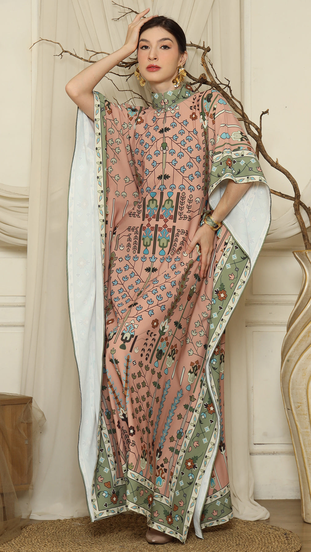 This kaftan made from lightweight satin material, which has super comfortable to lounge around in, adjustable drawstring and High Collar neckline with front buttons is an added feature which offers a glamorous way to cover up and perfect for evening wear.