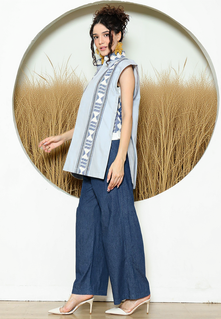 Embrace timeless elegance with this loose-fitting ikat cape tunic, designed for flexibility and comfort. Featuring button-down accents and a blazer collar at the front for a refined look, this woven combination tunic blends traditional charm with modern sophistication. Perfect for any occasion, this cape tunic showcases a unique style that celebrates heritage with a contemporary twist.