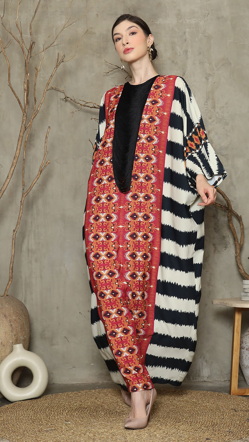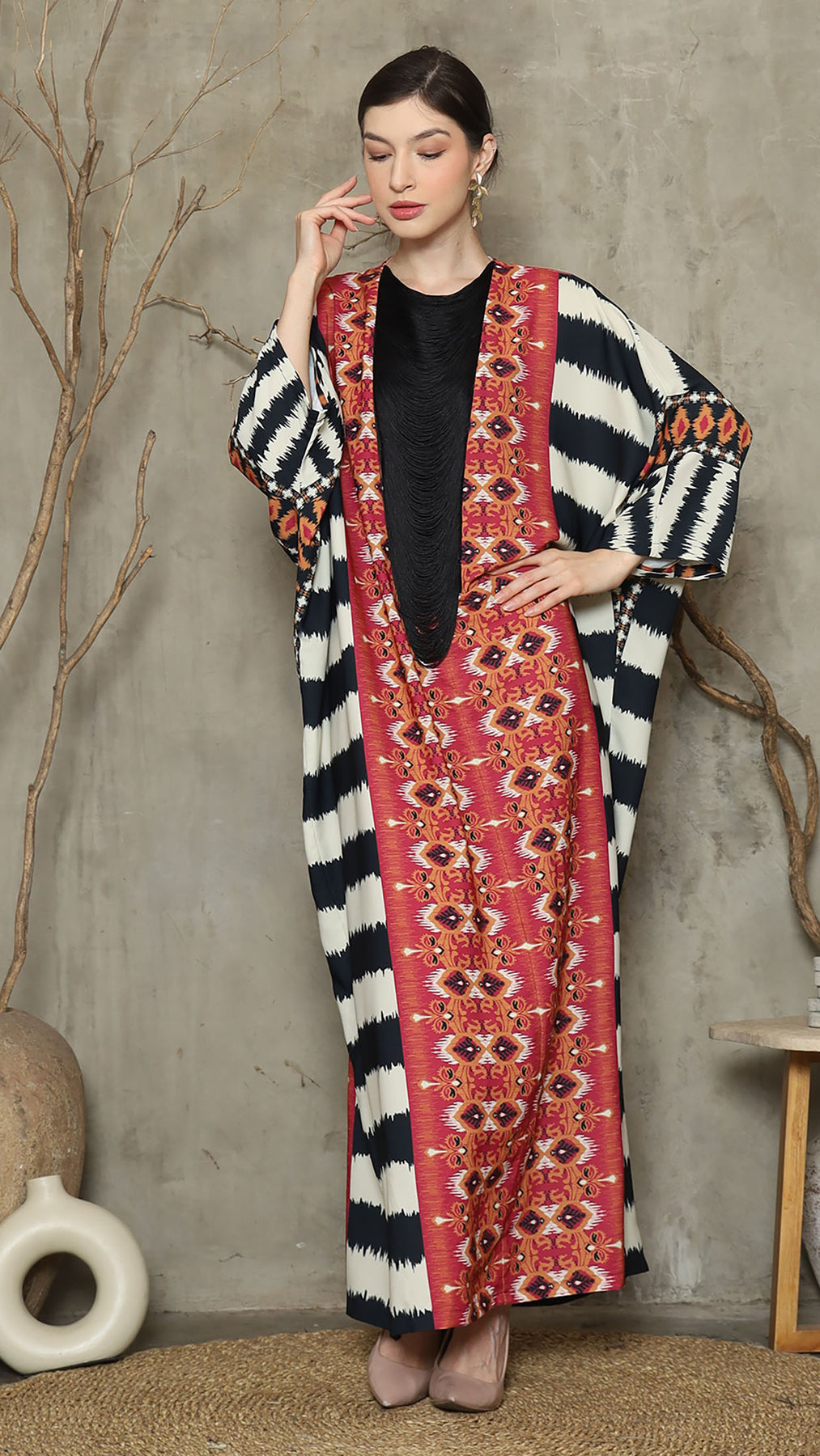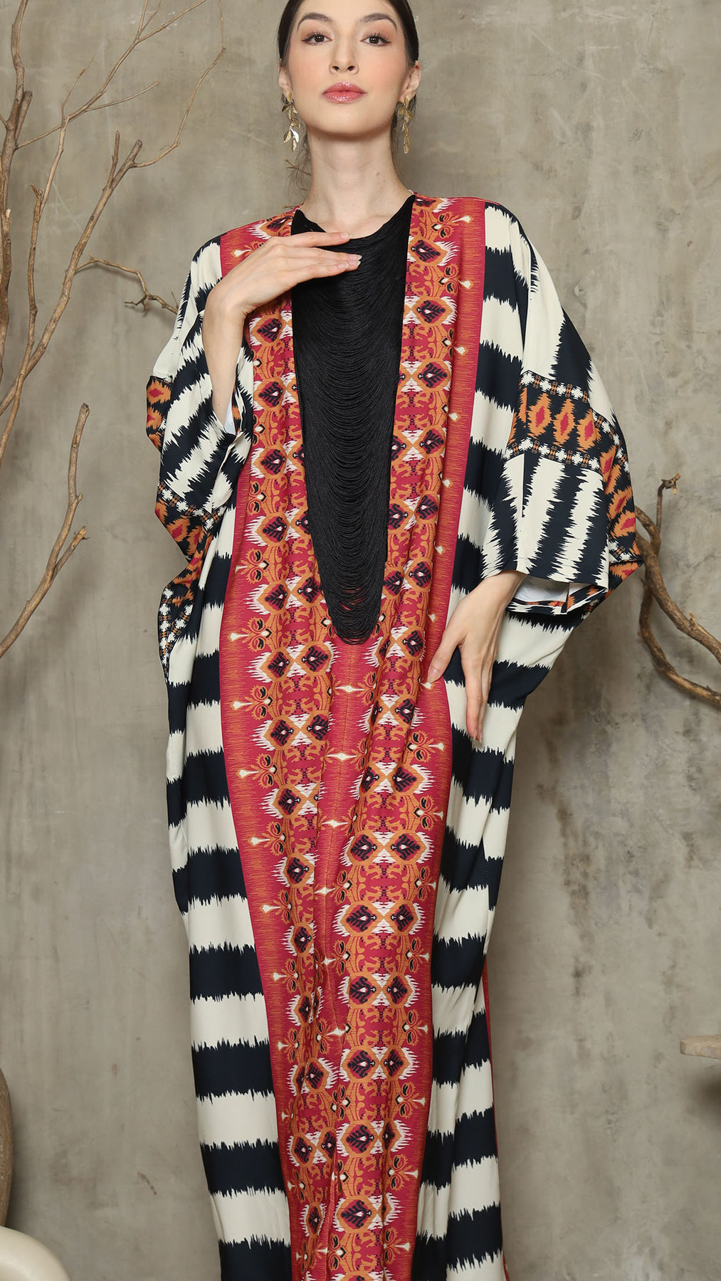 Red Ikat Necklace Fringe Long Kaftan
