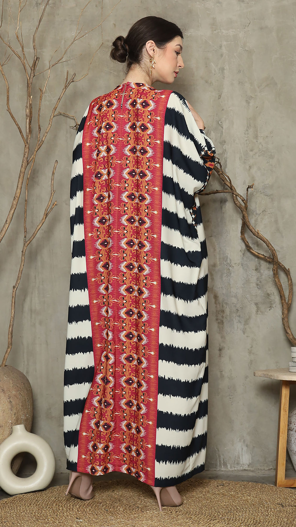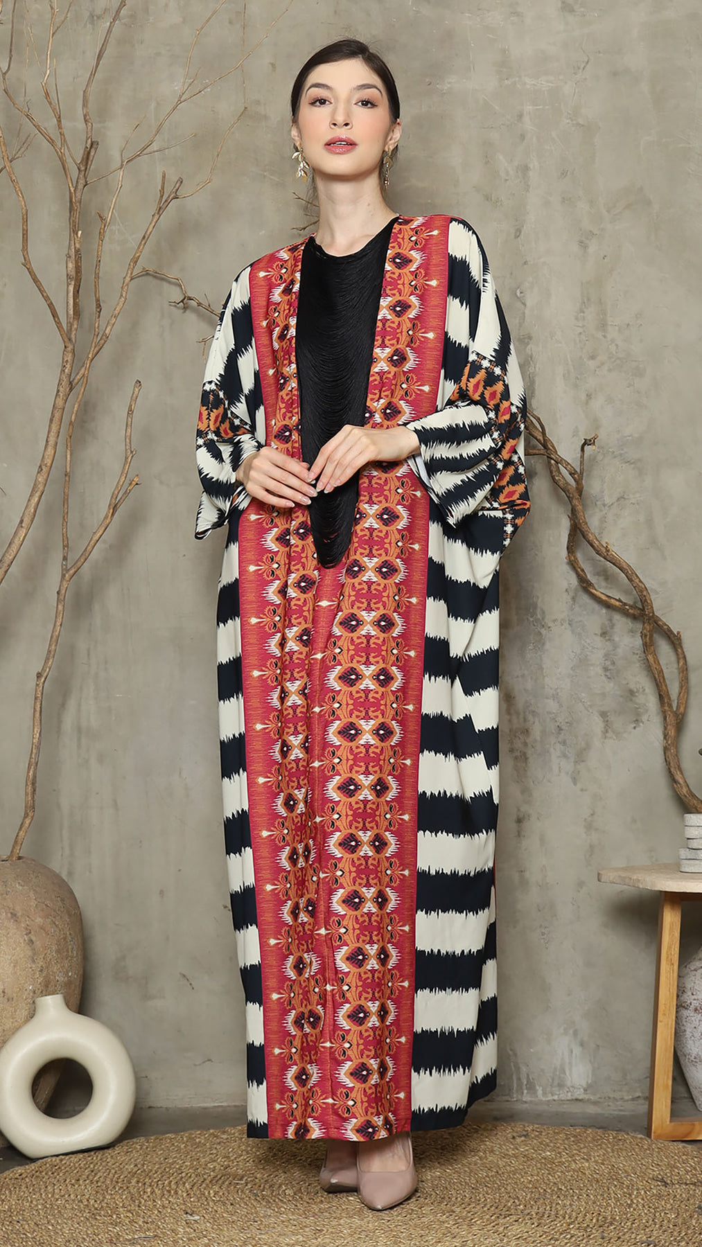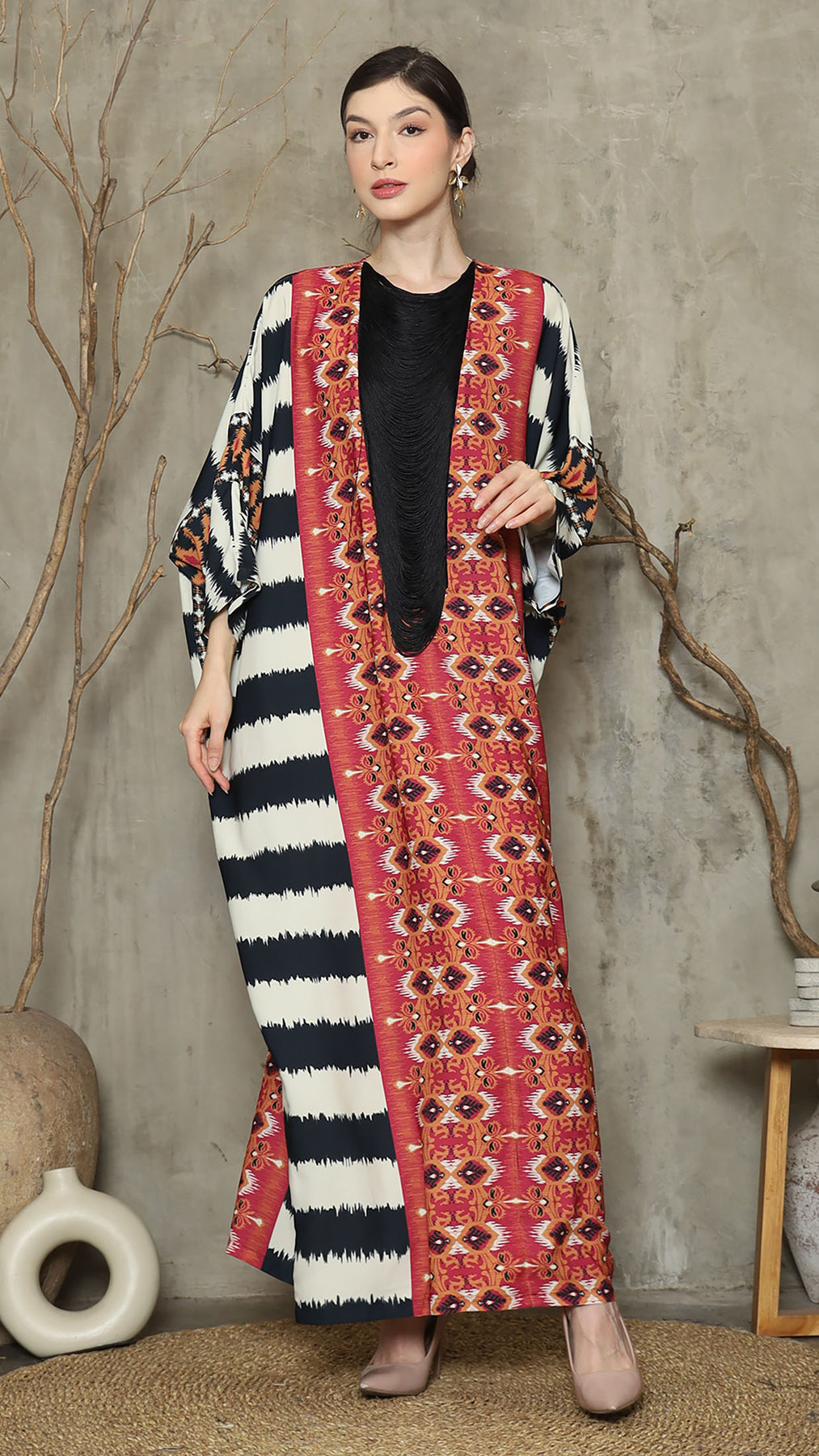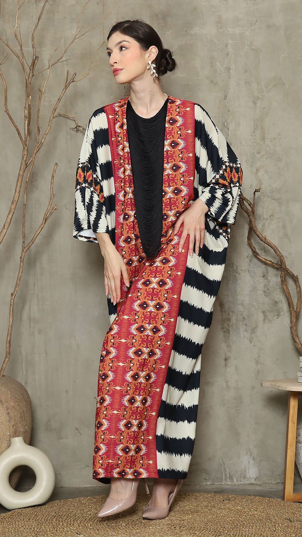 Red Ikat Necklace Fringe Long Kaftan
