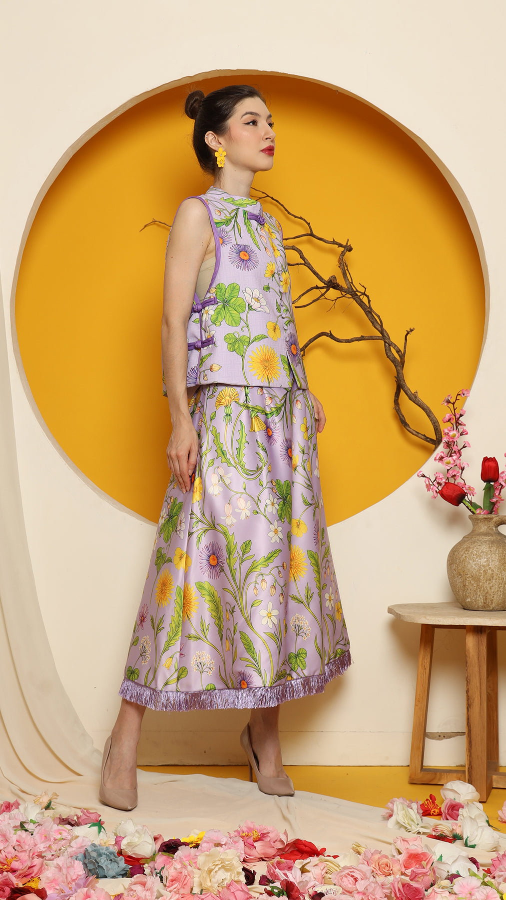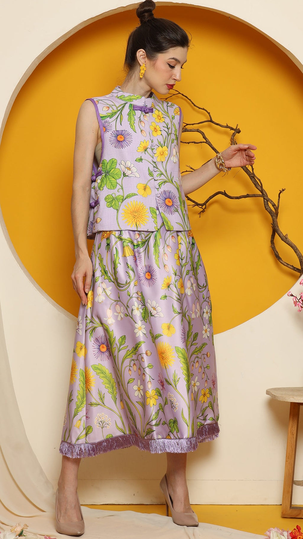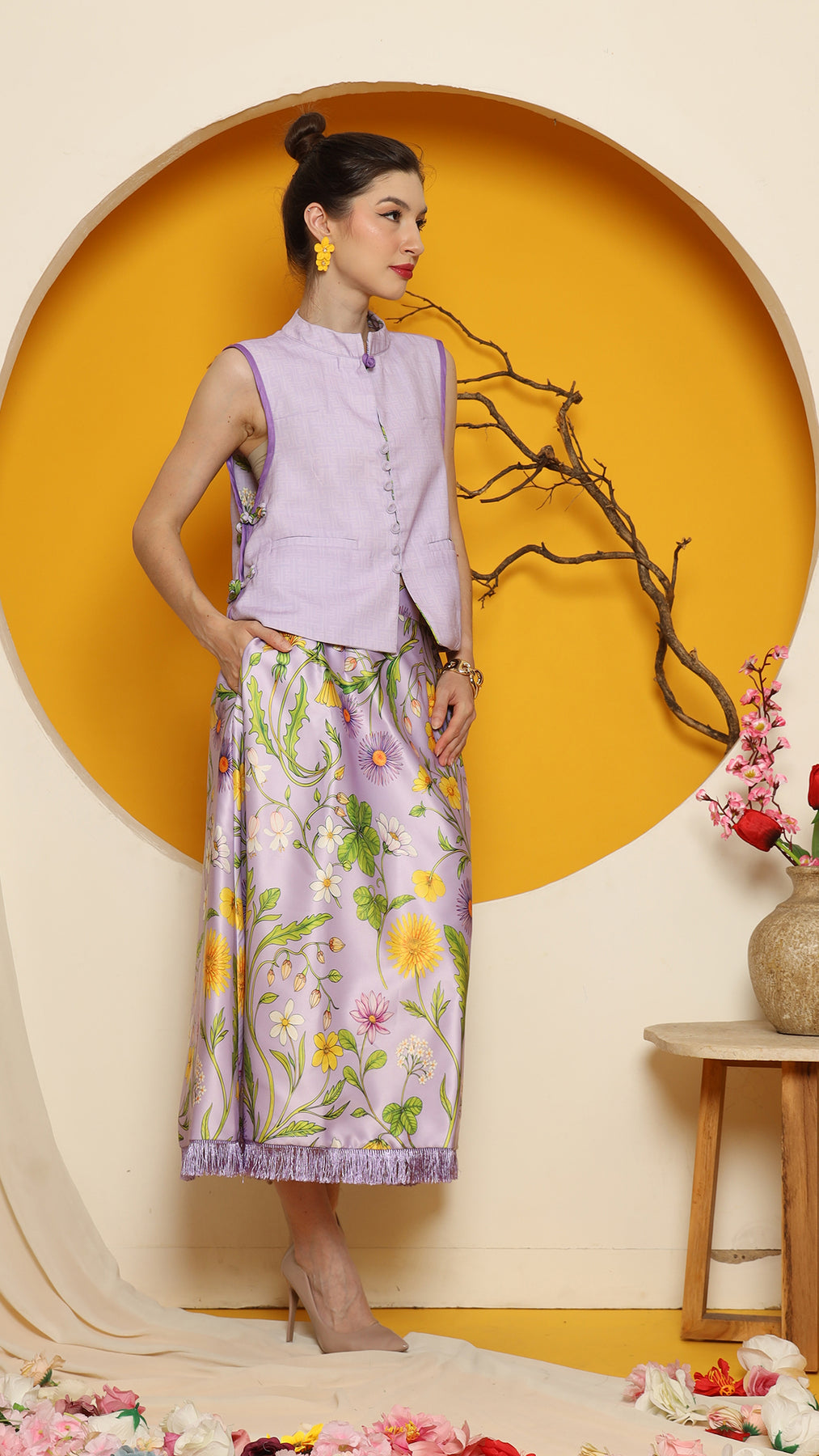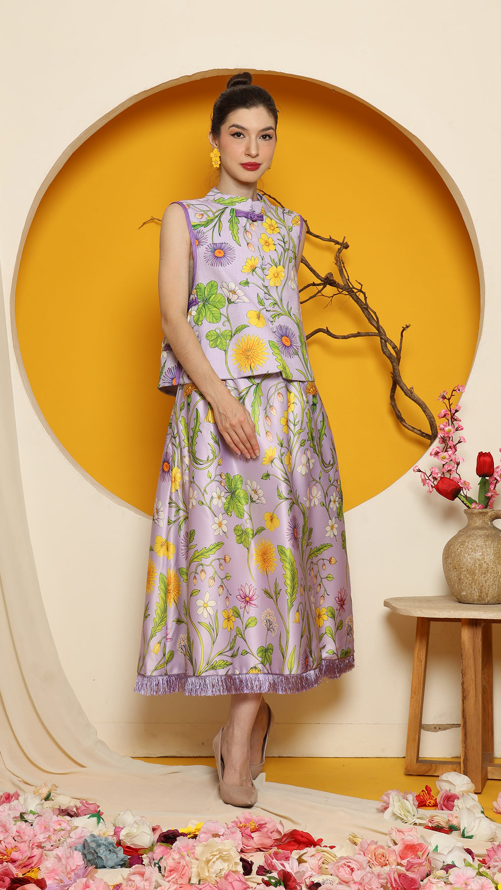 PURPLE FLOWER DOUBLE SIDE VEST with SKIRT SET