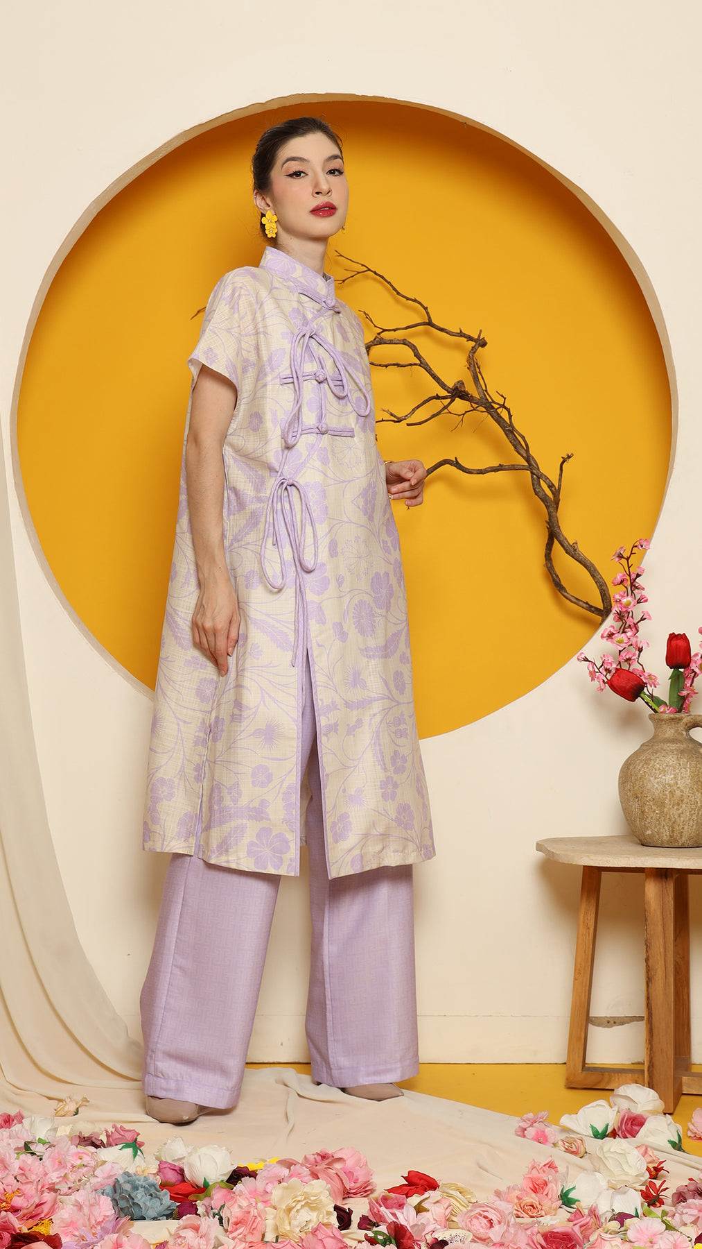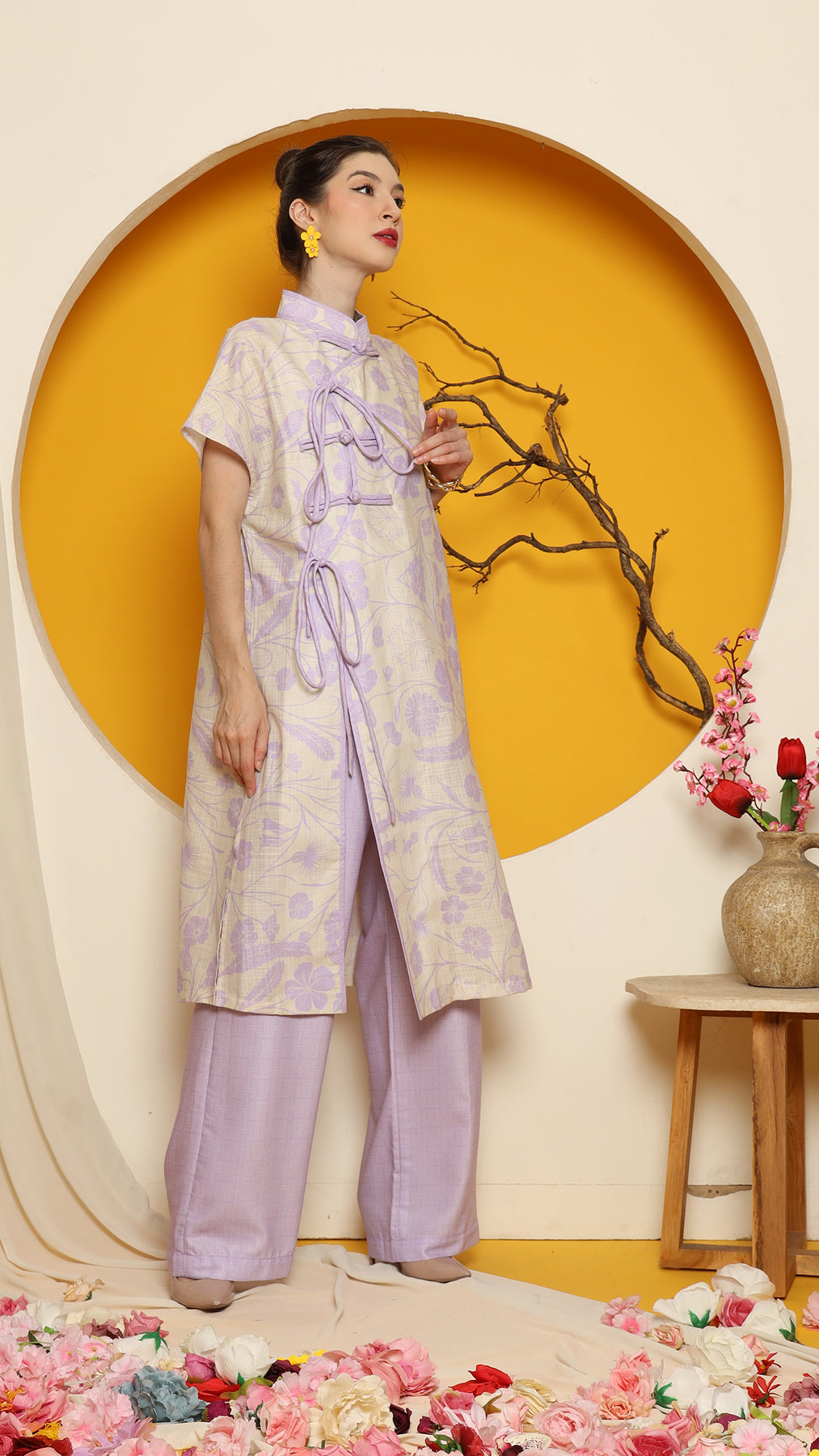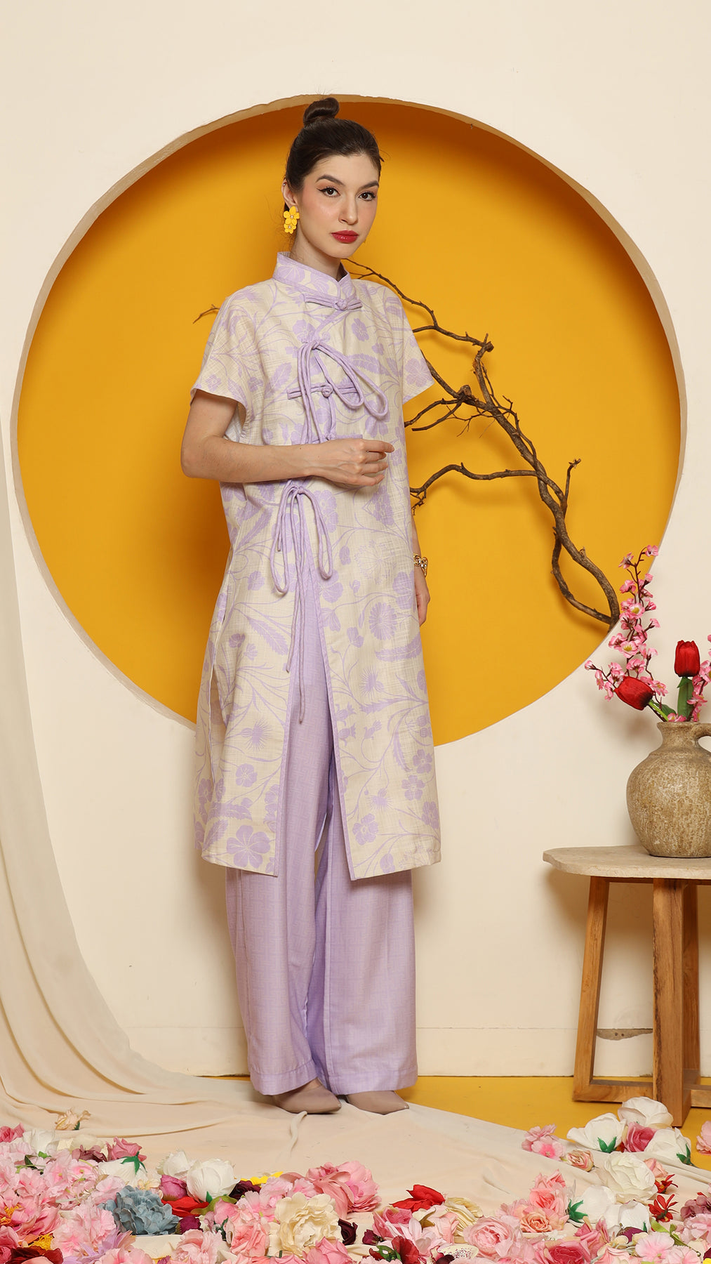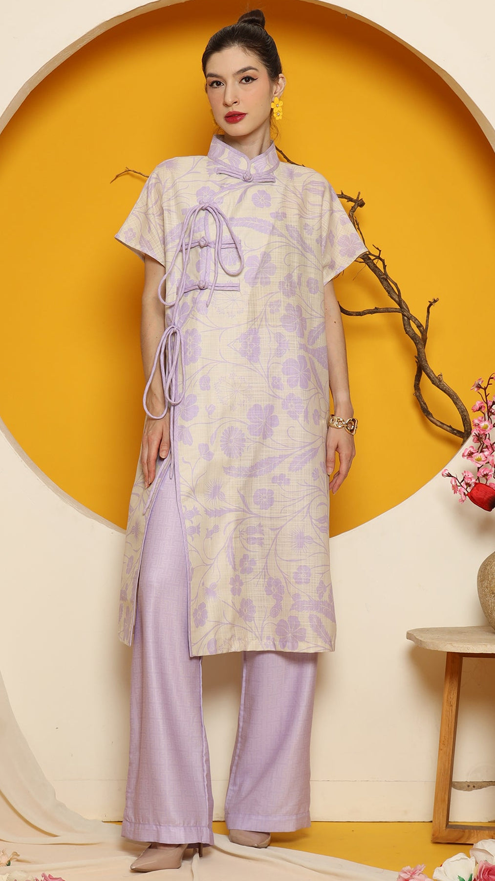 PURPLE ORIENTAL FLOWER CHEONGSAM PANT SET