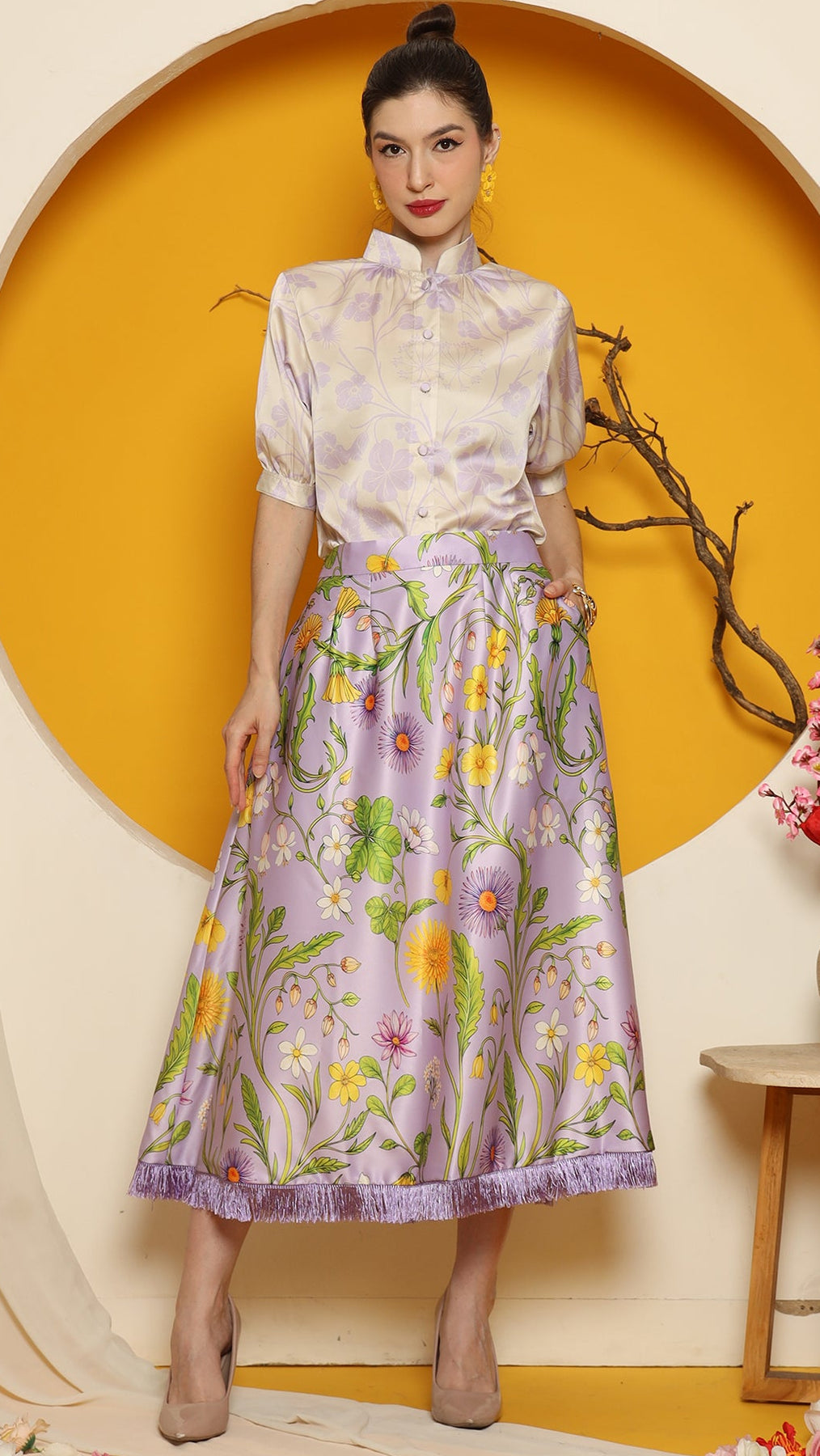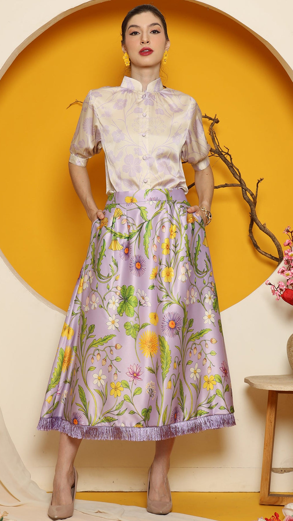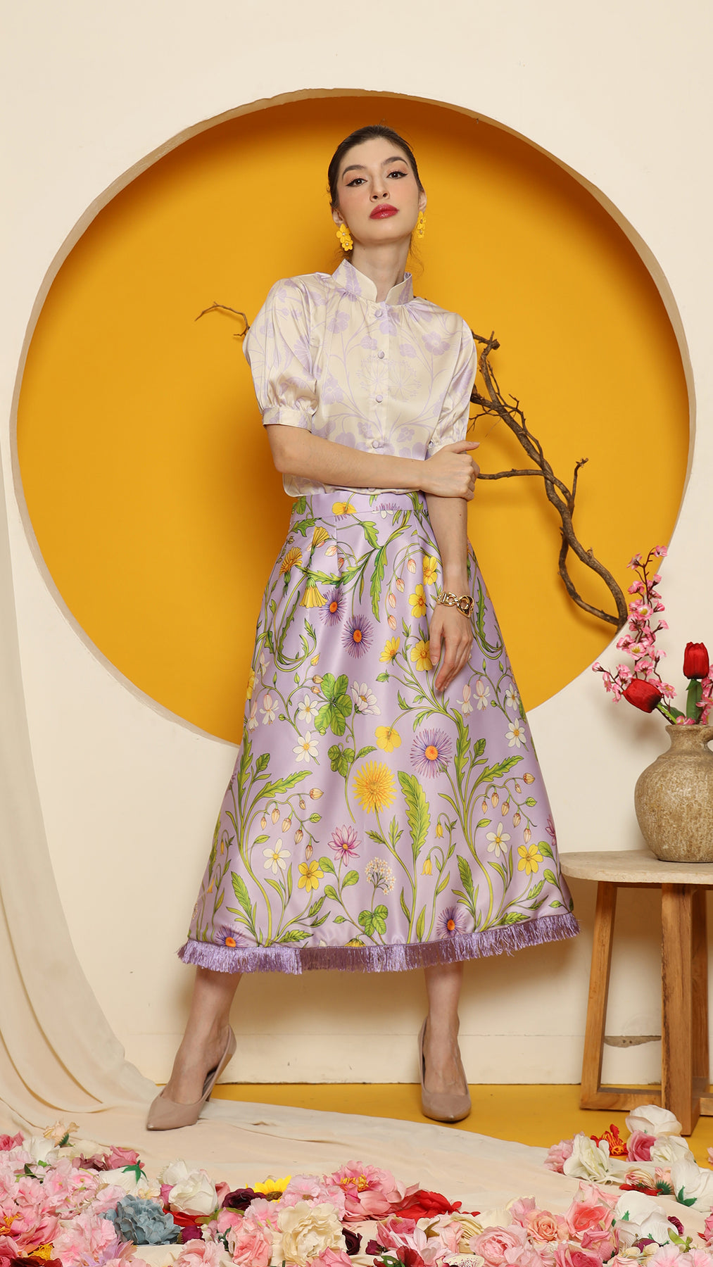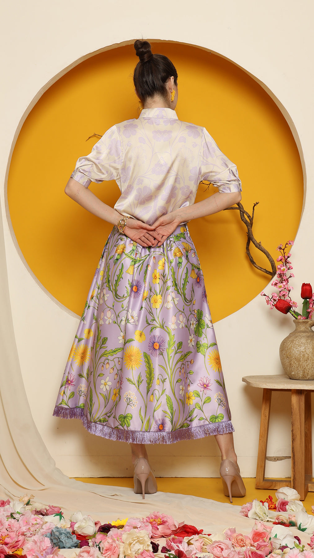 This refined ensemble includes high collar short top, showcasing an elegant flower motif. The shirt features a clean, minimalistic design perfect for a timeless look. Paired with it is a premium satin skirt adorned with floral patterns and finished with a red fringe hemline for a touch of sophistication.