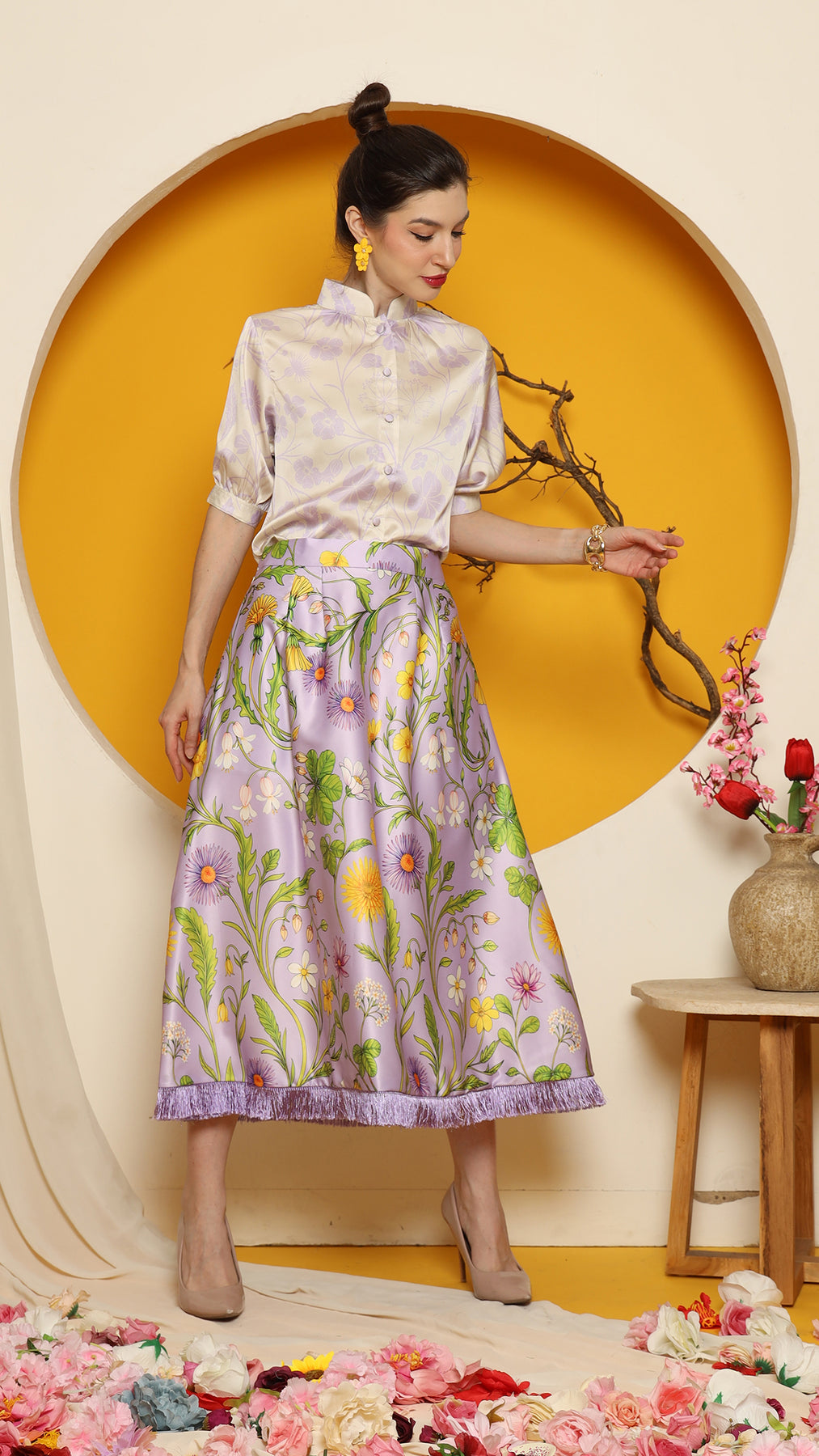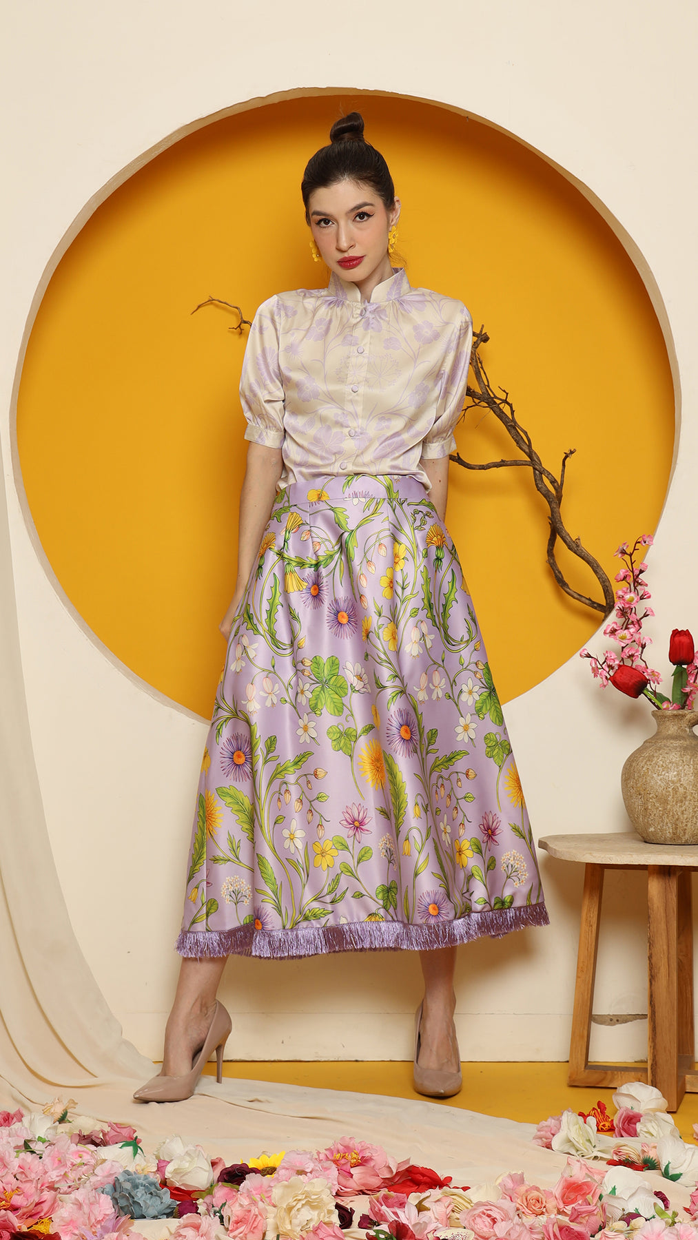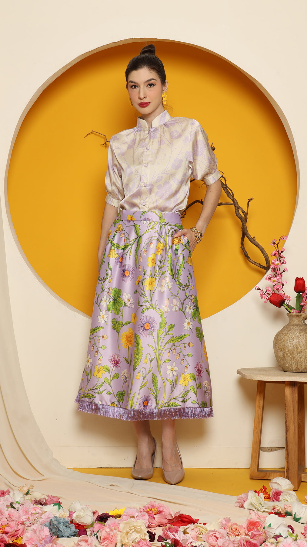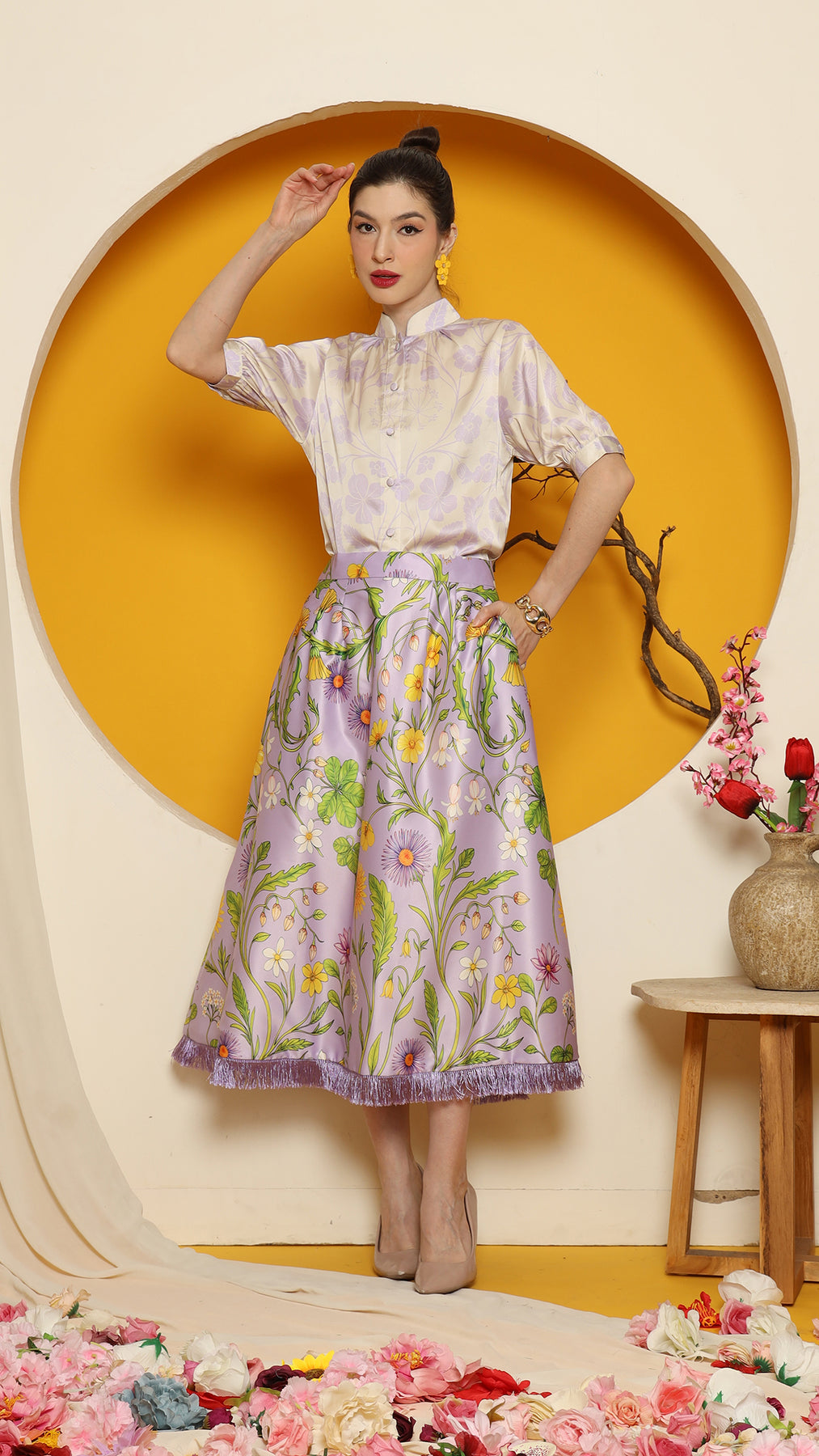 This refined ensemble includes high collar short top, showcasing an elegant flower motif. The shirt features a clean, minimalistic design perfect for a timeless look. Paired with it is a premium satin skirt adorned with floral patterns and finished with a red fringe hemline for a touch of sophistication.