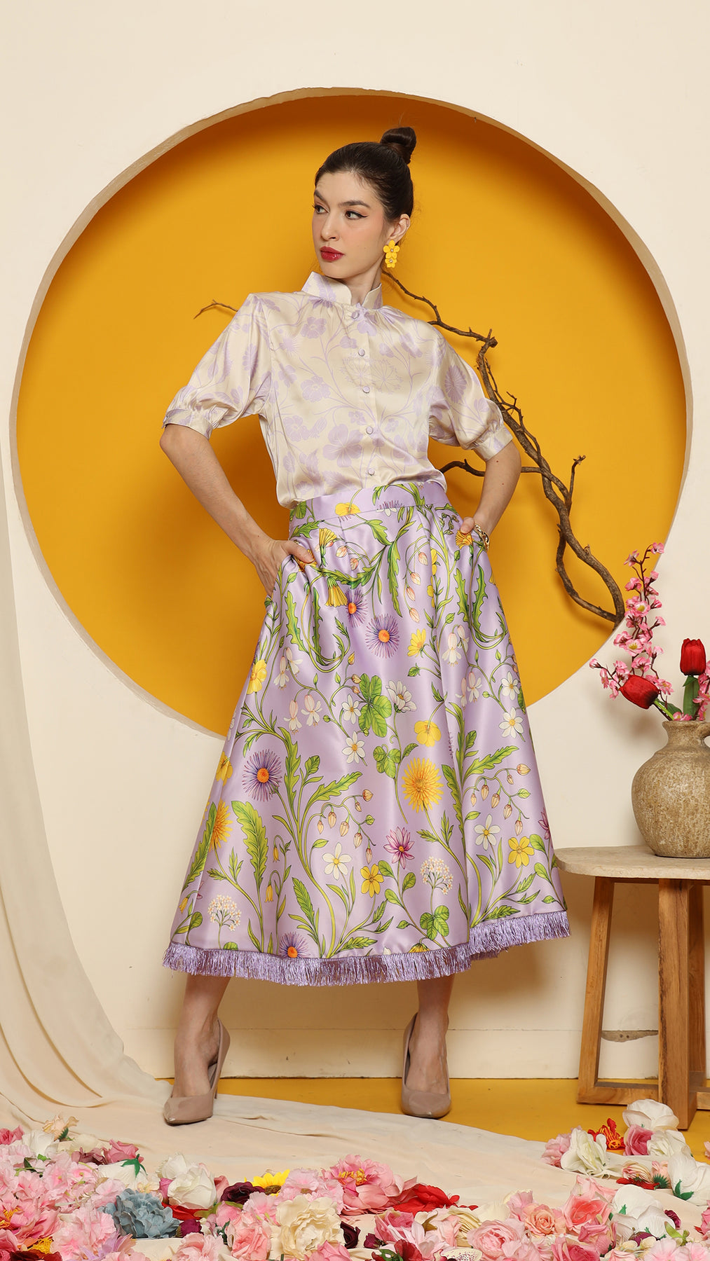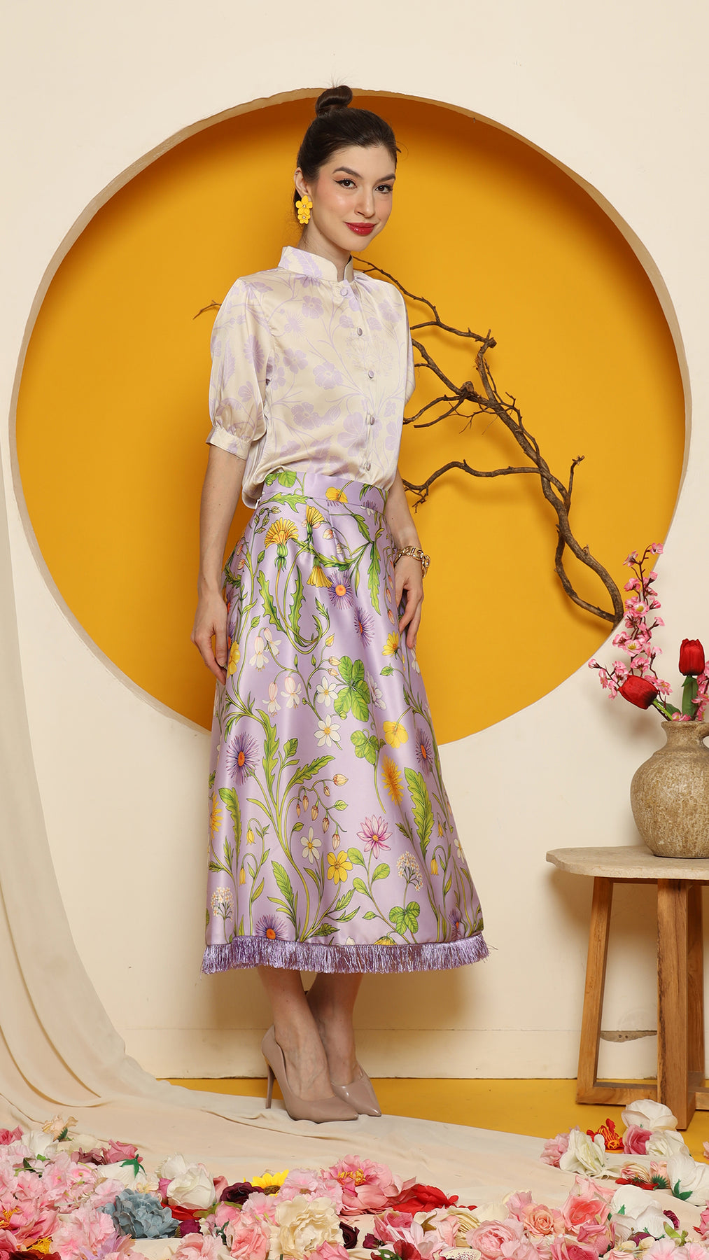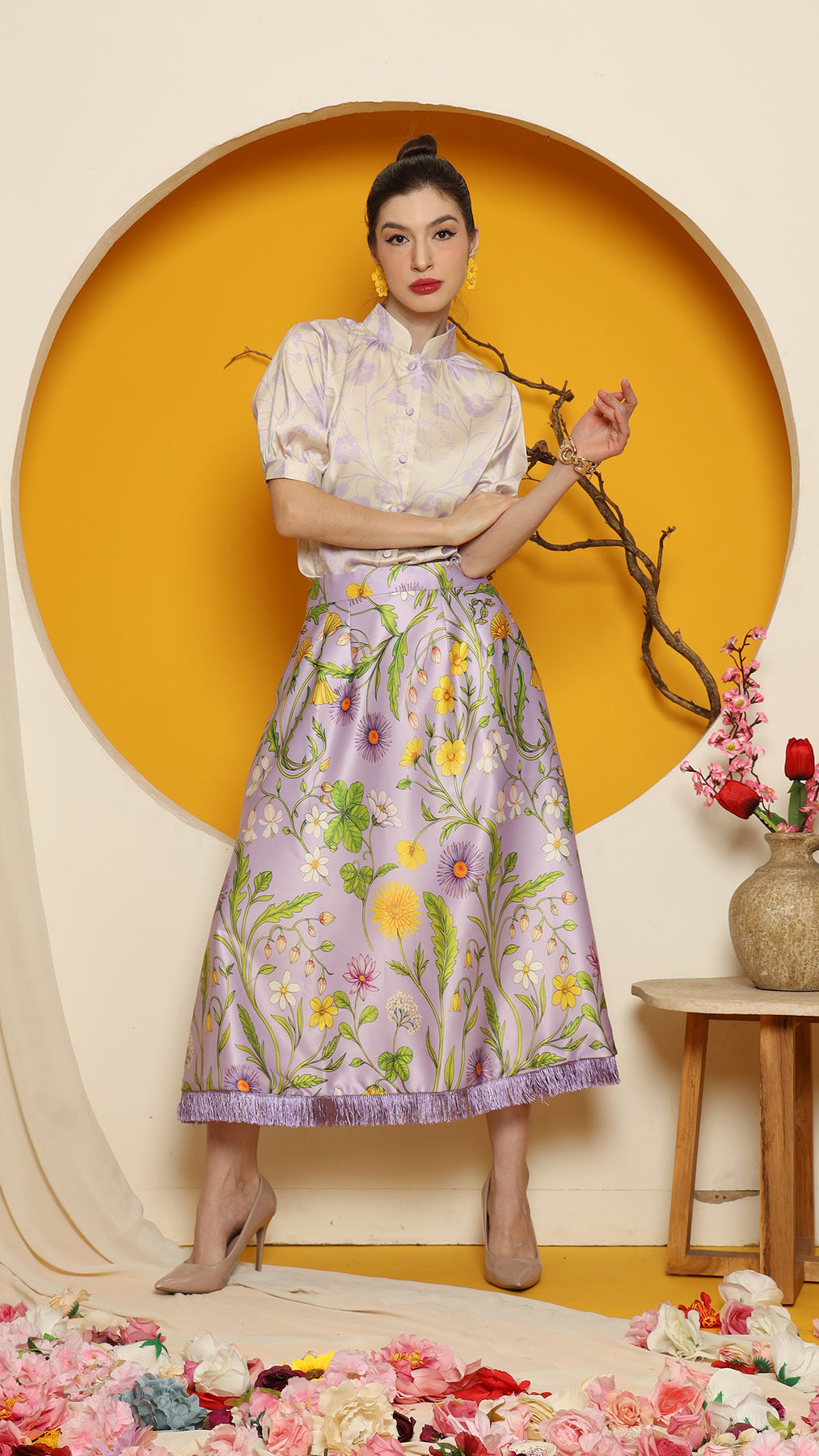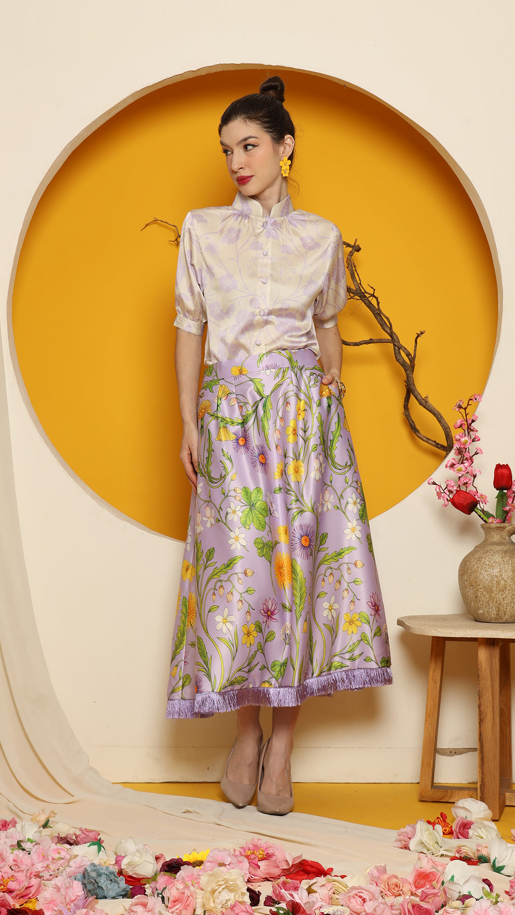 This refined ensemble includes high collar short top, showcasing an elegant flower motif. The shirt features a clean, minimalistic design perfect for a timeless look. Paired with it is a premium satin skirt adorned with floral patterns and finished with a red fringe hemline for a touch of sophistication.