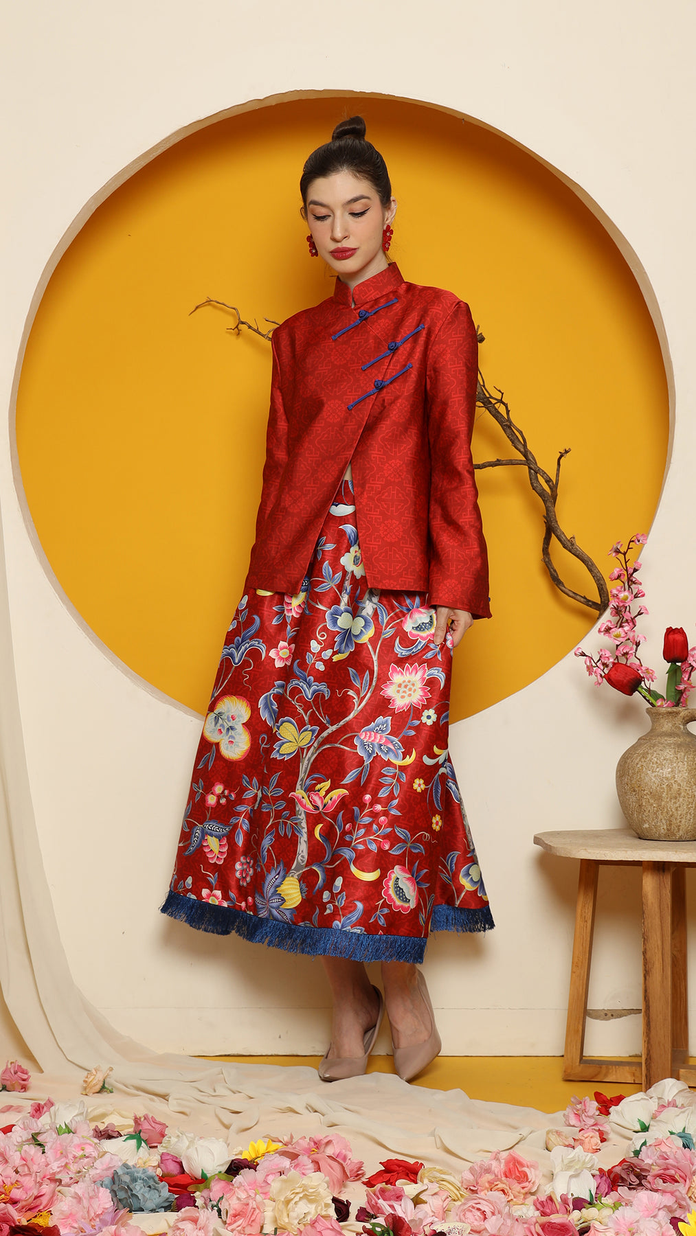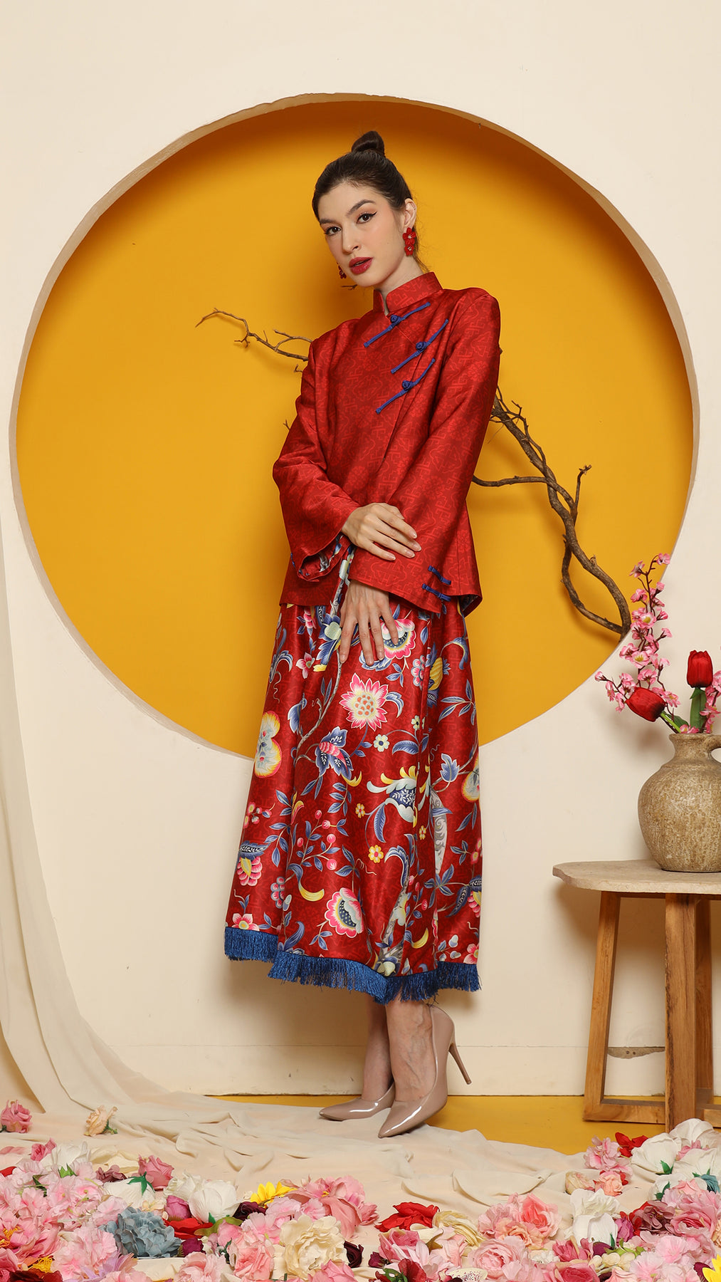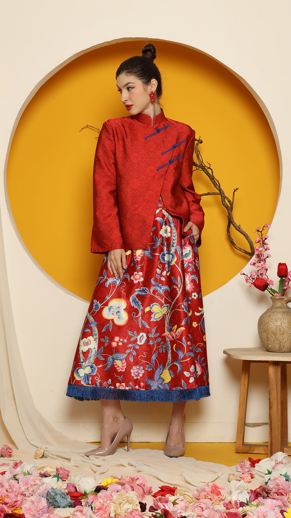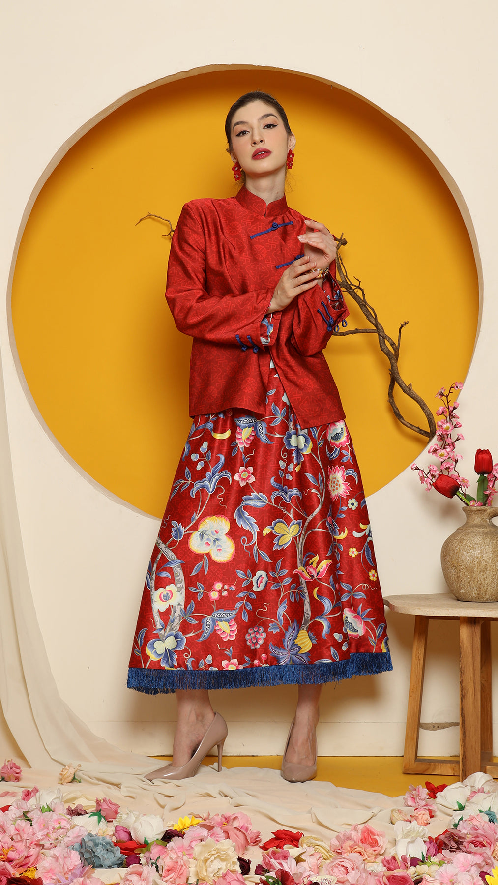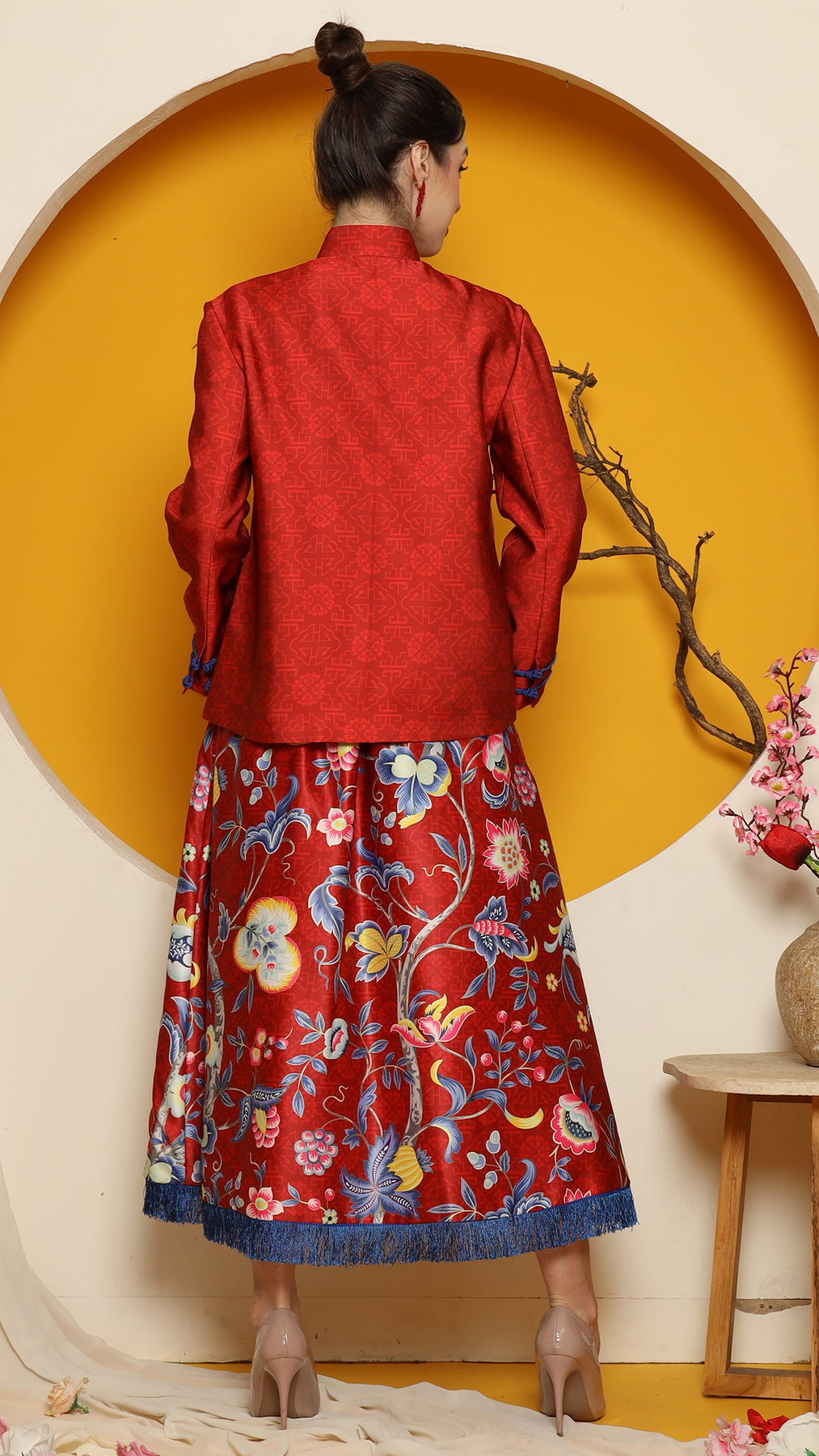 This sophisticated ensemble features a Cheongsham-style jacket with a distinctive overlap front closure and red knot-button detailing. Made from high-quality jacquard fabric, the jacket is fully lined and tailored to a flattering length of 64 cm. The skirt, crafted from premium floral satin, boasts intricate flower motifs, complemented by a chic red fringe hemline for added elegance. It is designed with a back zipper and an elastic waistband for comfort.