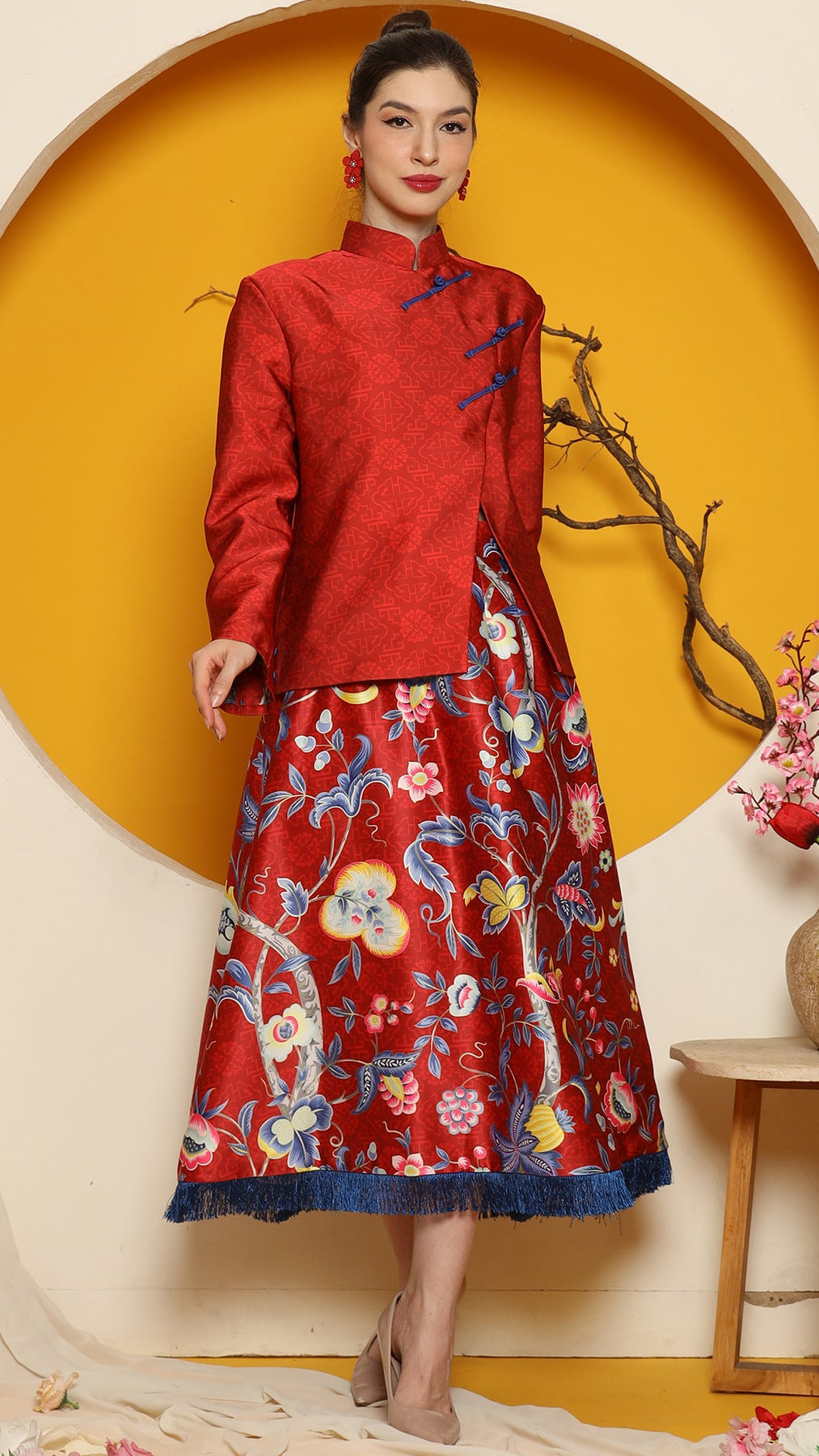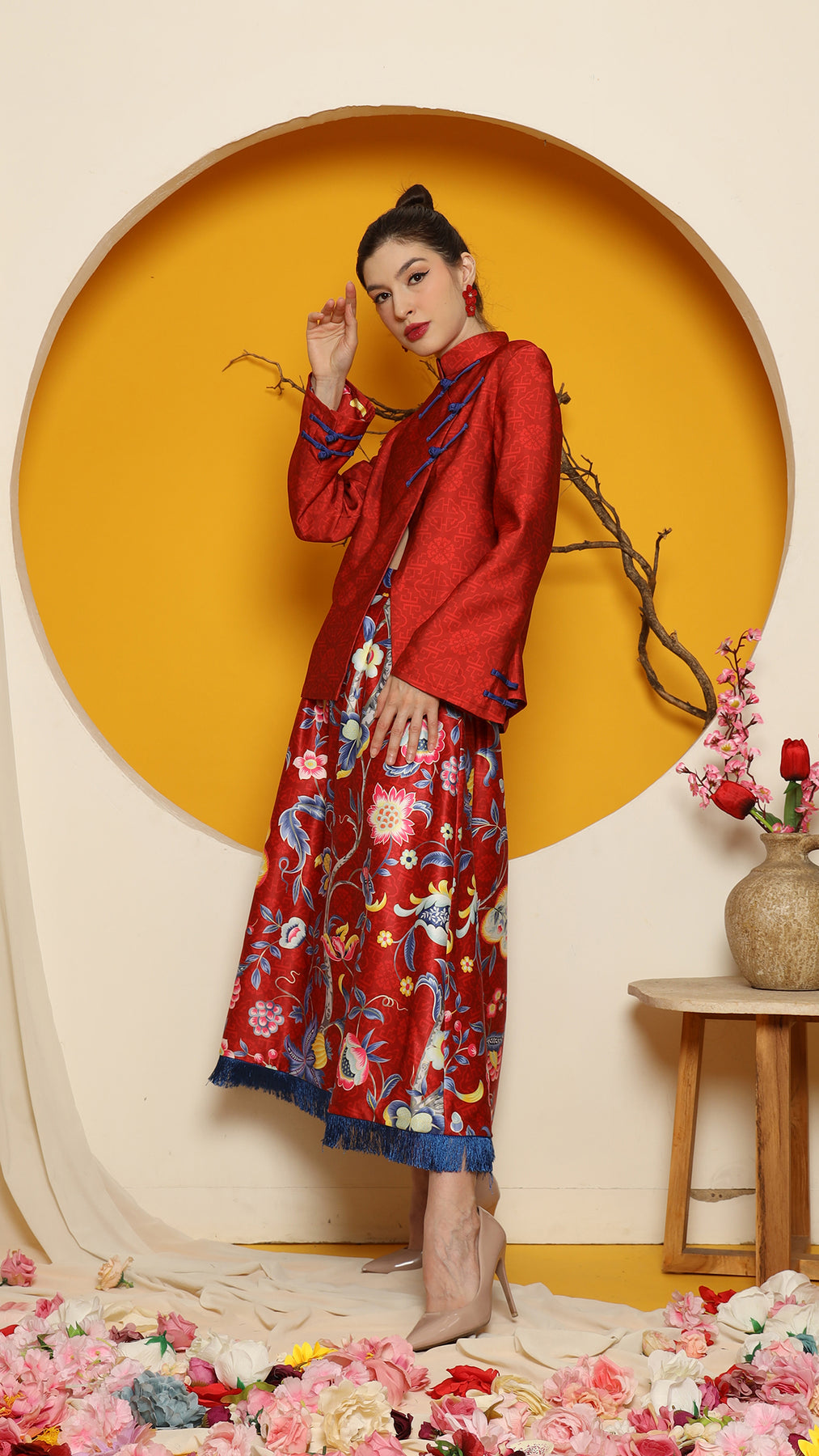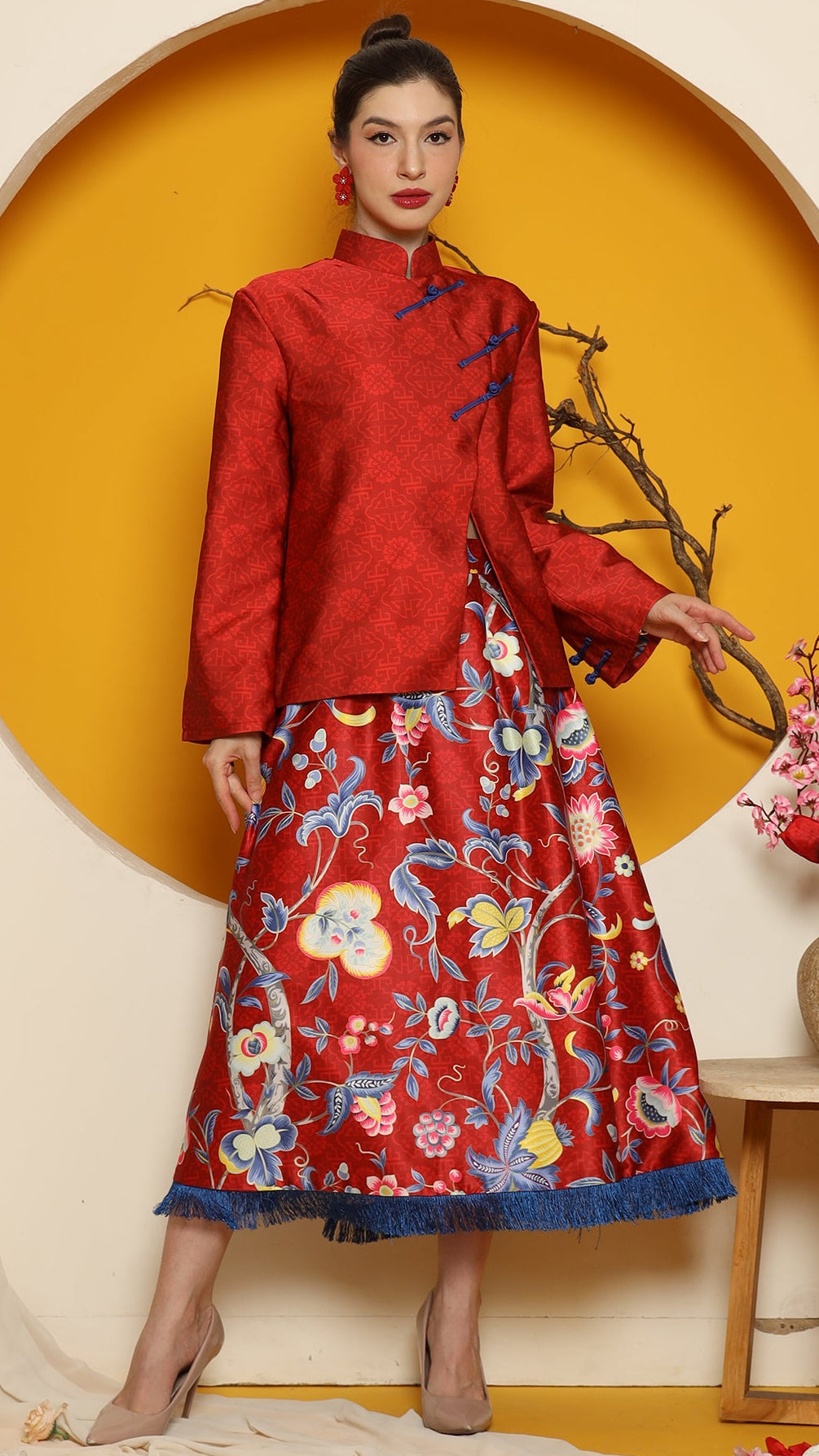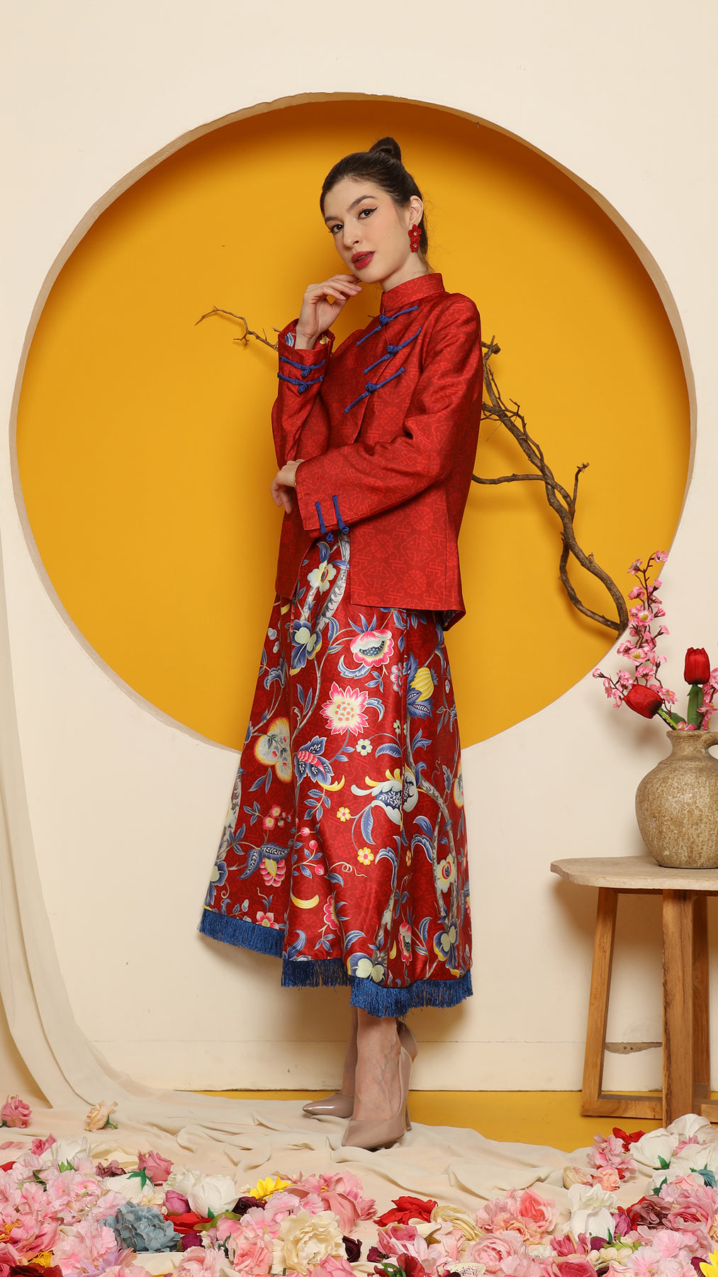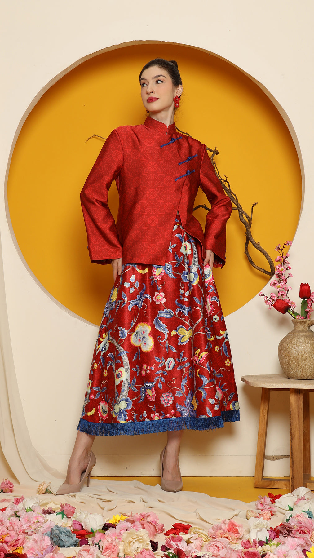 This sophisticated ensemble features a Cheongsham-style jacket with a distinctive overlap front closure and red knot-button detailing. Made from high-quality jacquard fabric, the jacket is fully lined and tailored to a flattering length of 64 cm. The skirt, crafted from premium floral satin, boasts intricate flower motifs, complemented by a chic red fringe hemline for added elegance. It is designed with a back zipper and an elastic waistband for comfort.